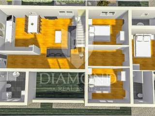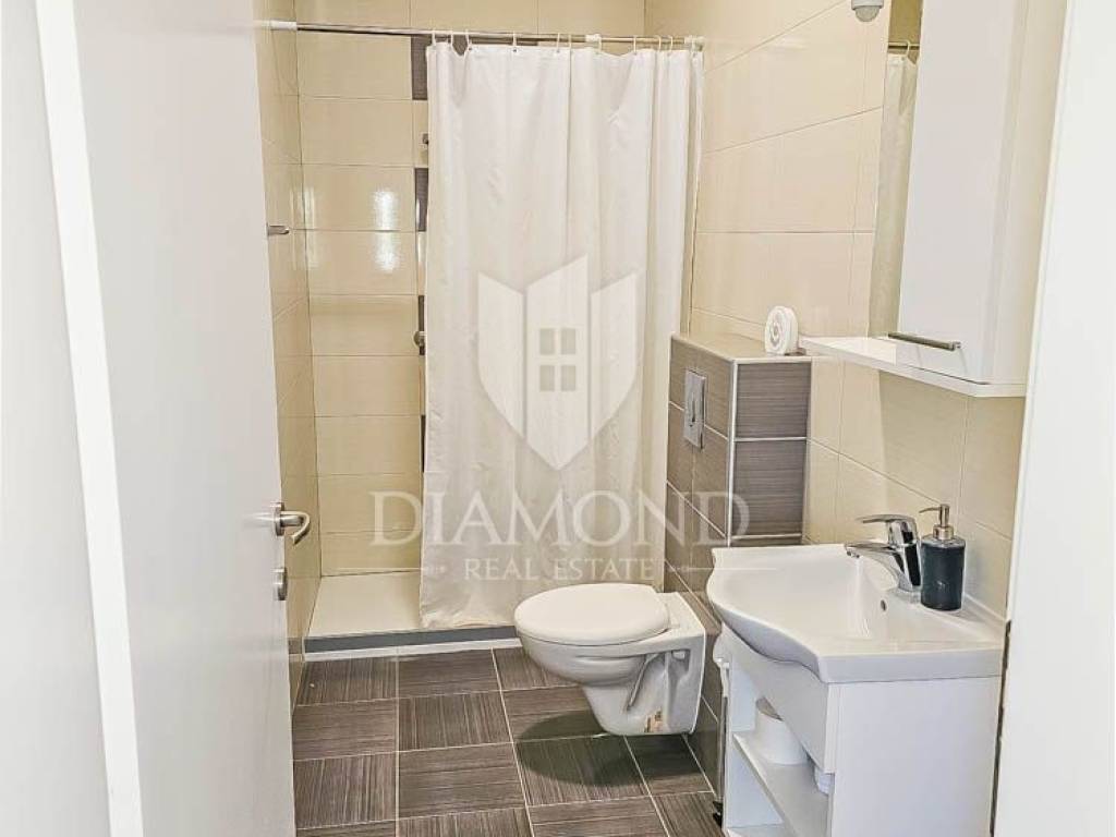 The apartment is located on the first floor and extends through the entire floor. At the entrance to the apartment, we have a corridor that leads to the first bathroom and the laundry room. Downstairs there is a spacious living room with a kitchen and a dining room leading to the loggia, perfect for relaxing on summer days. From the living room, stairs lead to a large roof terrace (30m2) with a wonderful view of the sea. In the continuation of the apartment, there are 3 spacious bedrooms, each of which has its own bathroom. There is also a storage room on the ground floor, as well as two parking spaces in the garden.
