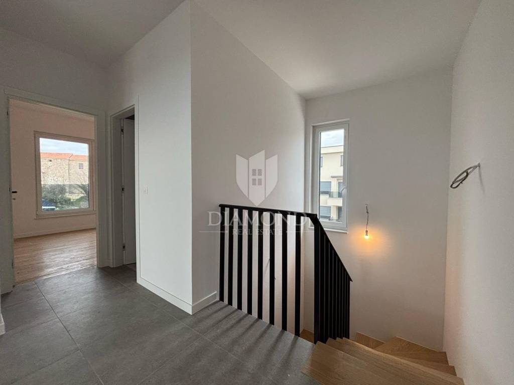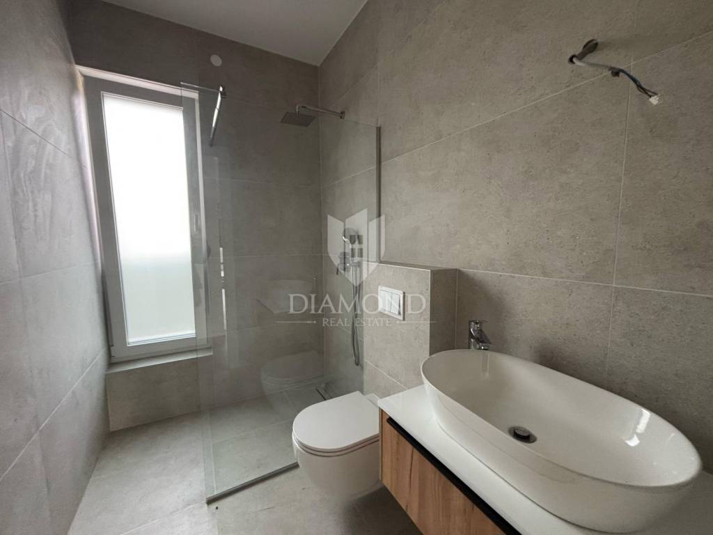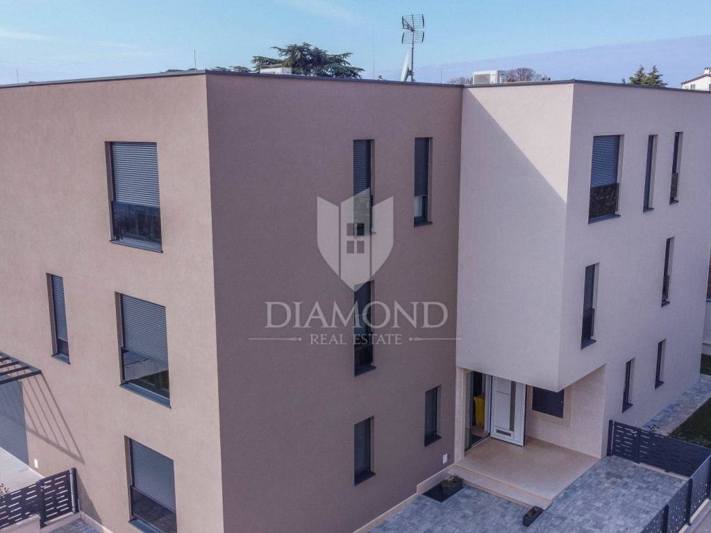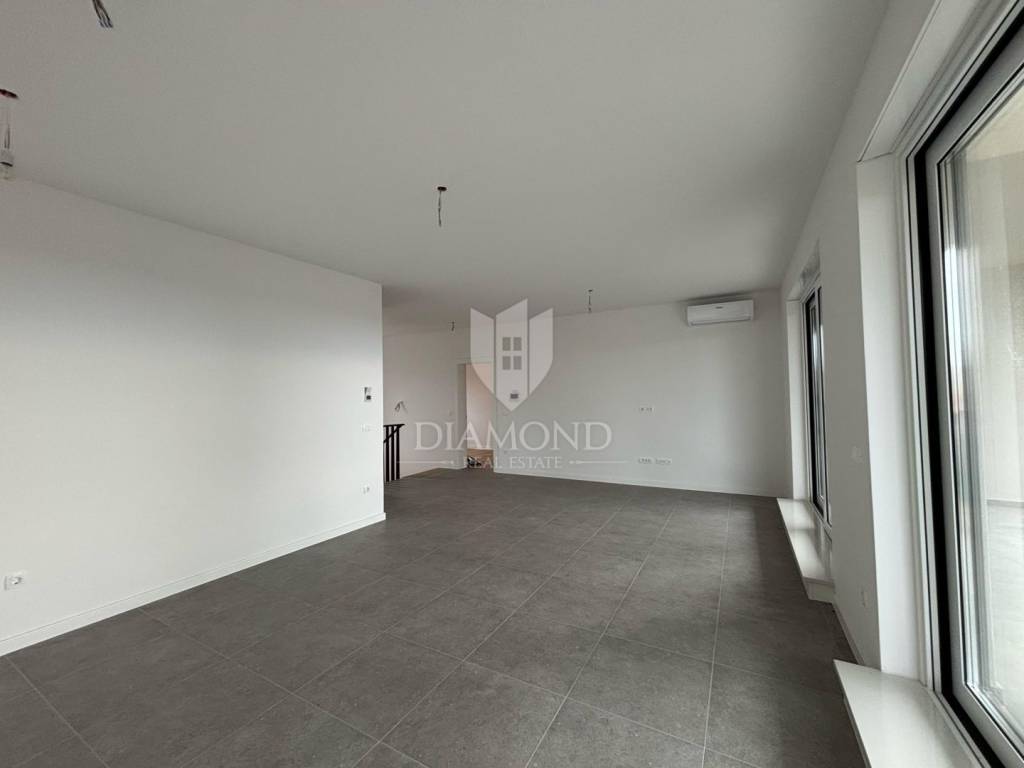 This luxury residential building with a total of four two-story apartments is located in a quiet place, only 3 km from the first beaches. The apartments are very spacious and spread over two floors. The stairs lead to the second floor of the apartment, where there is a living room, dining room and open space kitchen, two bedrooms and a bathroom, while an elegant internal staircase leads down to the first floor, where there is a toilet, wardrobe, another comfortable bedroom. with its own well-equipped bathroom terrace offering a beautiful view. From the living room on the second floor, there is access to a covered terrace where, with the option of installing a jacuzzi, you can enjoy a beautiful view of the sea. The total size of the apartment is 124.82 m2. The apartment will be heated by underfloor heating with a heat pump and air conditioners. Poreč is located 9 km away from the town. All amenities from school, kindergarten, restaurants, bank, shop, post office, children's playgrounds, walks by the sea and in nature are located in the immediate vicinity of the apartment. The apartment is included in the VAT system, so the prices include VAT.