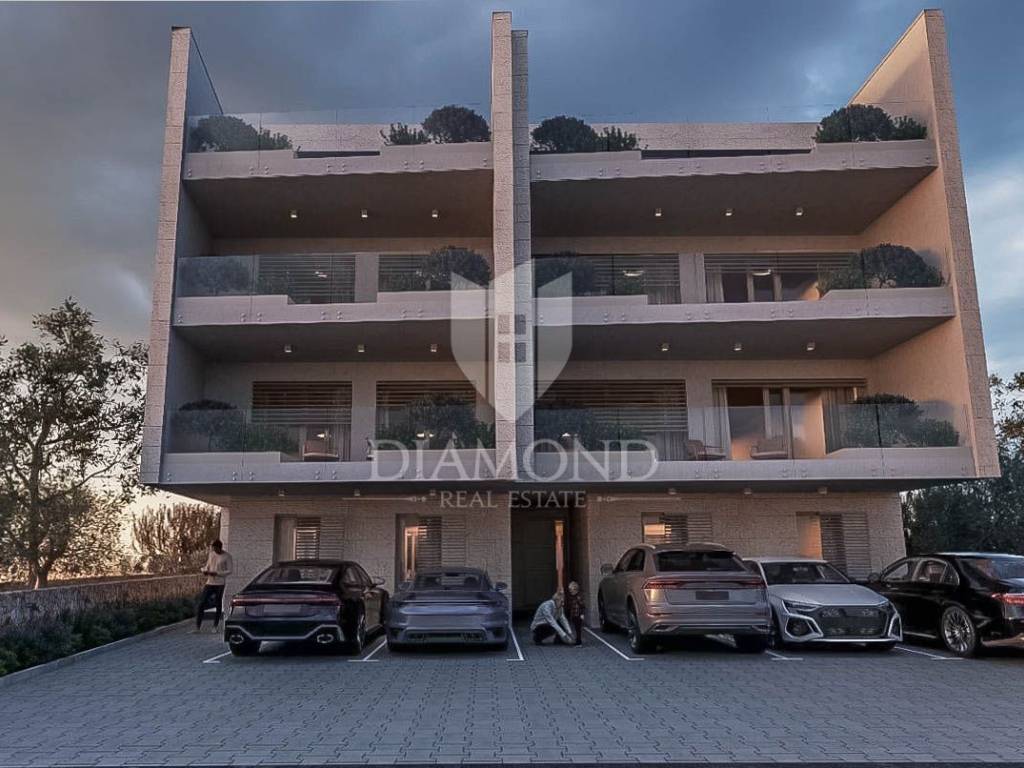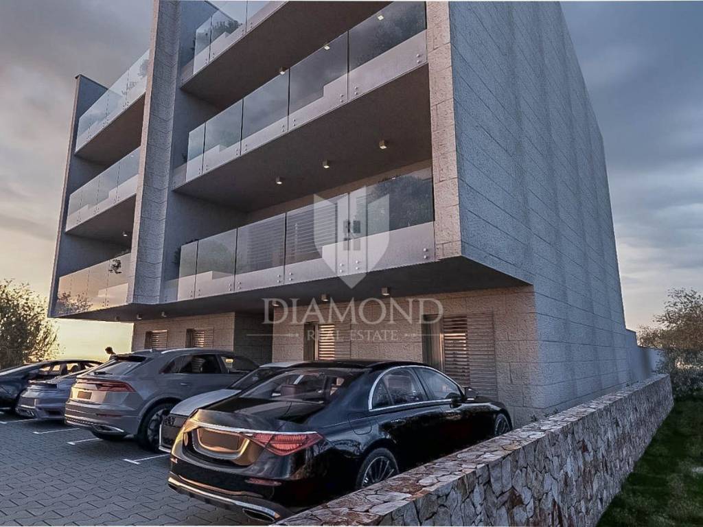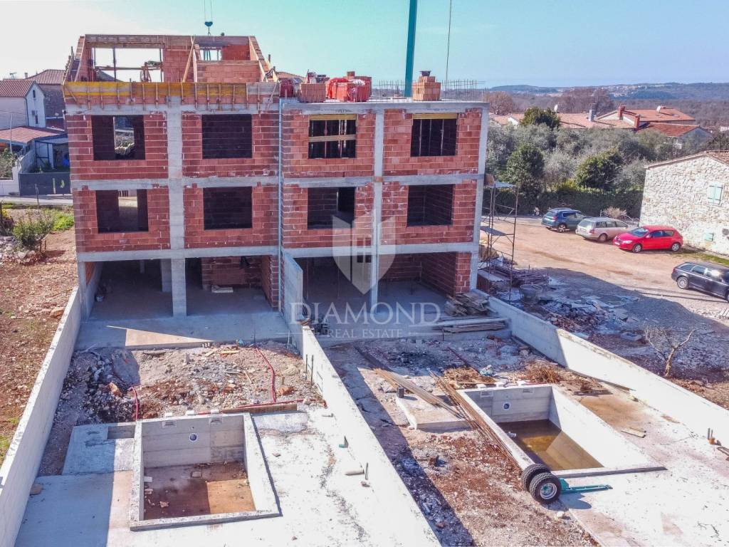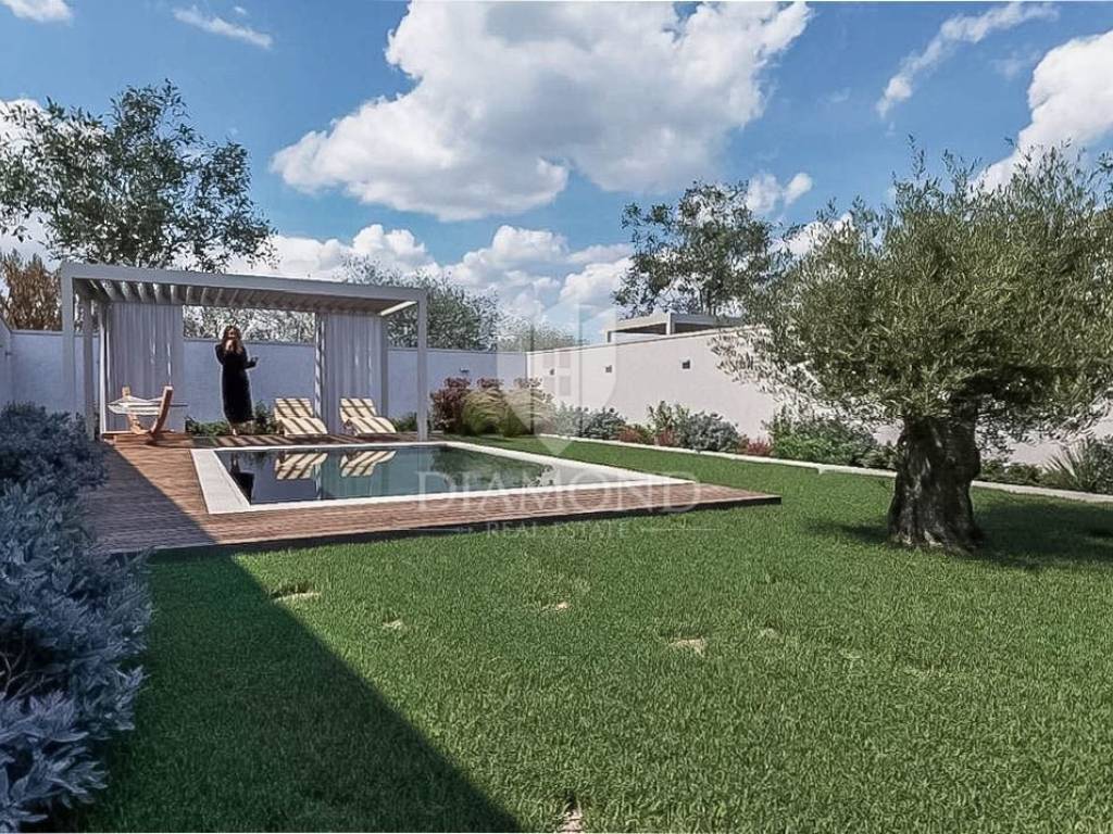 In a quiet place, only 2 kilometers from the sea, on a fertile plateau of 112 m above sea level with a view of the Alps, a fantastic apartment on the ground floor is for sale. The total net area of the apartment is 64.23m2. The apartment has a fenced yard of 139m2 with a 15m2 swimming pool and 2 parking spaces. The apartment will consist of a living room, dining room, kitchen, two bedrooms and a bathroom. The master bedroom has access to its own bathroom. The living room will lead directly to a covered terrace of 23 m2 and a private garden with a swimming pool and sun deck. Heating of the apartment is planned via air conditioning and electric underfloor heating. Construction has begun, it is being built with top-quality materials, and the completion of construction is planned by the end of 2025.