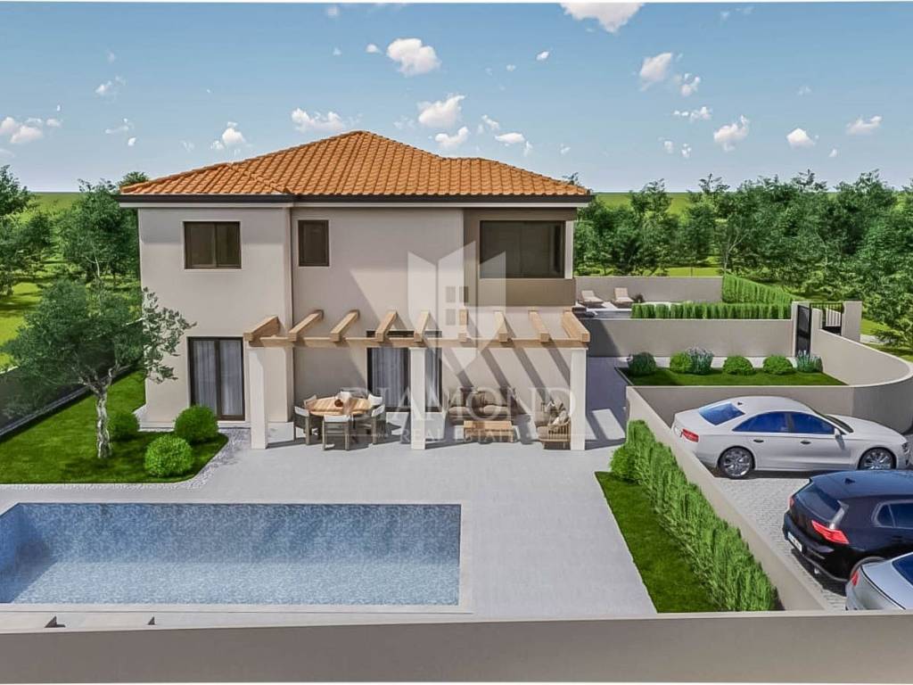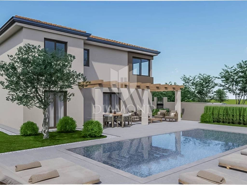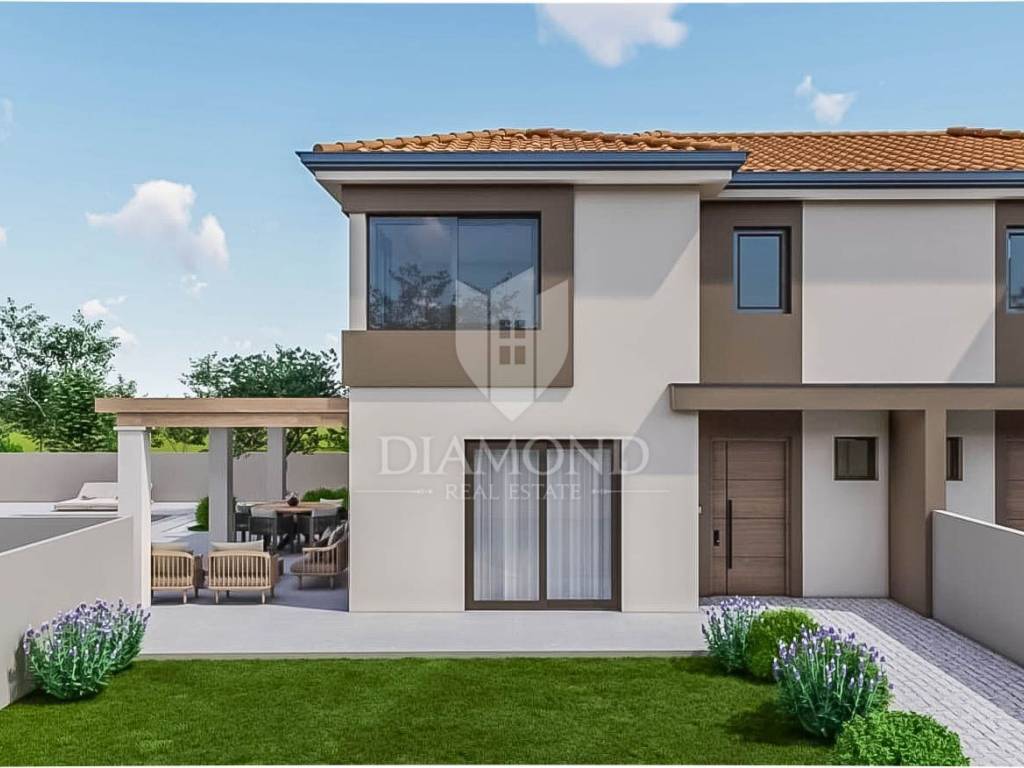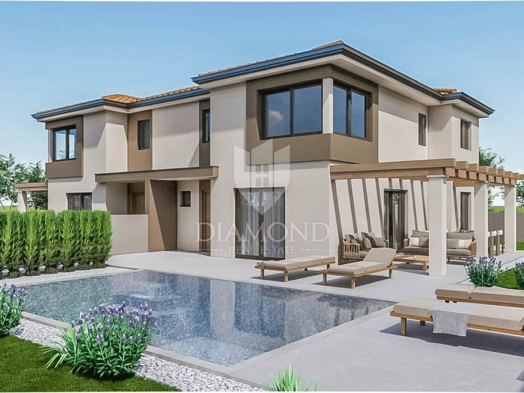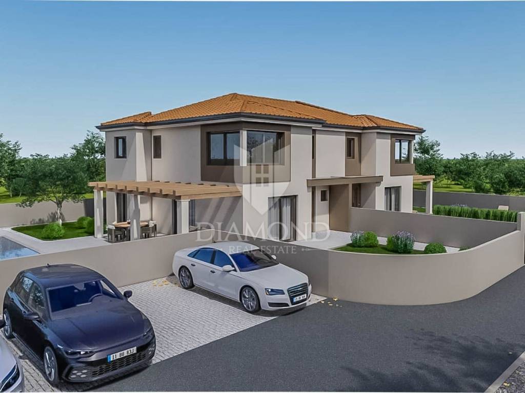Not far from the city of Poreč, in a well-known and desirable place on the west coast of Istria, surrounded by lush Mediterranean vegetation, the construction of this semi-detached house of superior design, content and quality begins. The house with its 137 m2 net area is spread over two floors, ground floor and first floor. On the ground floor of the house, there is an entrance hall that leads to a spacious living room with a dining room and a kitchen, as well as an exit to the terrace and a spacious fenced yard. There is one bedroom, a bathroom, a storage room and a toilet. The elegant staircase leads from the living room to the first floor, where there are two bedrooms, each with its own bathroom, and a comfortable sauna. All three bedrooms, with their concept and size, provide privacy and comfort. The first floor of the house offers a beautiful view of the surrounding landscape and its own swimming pool.