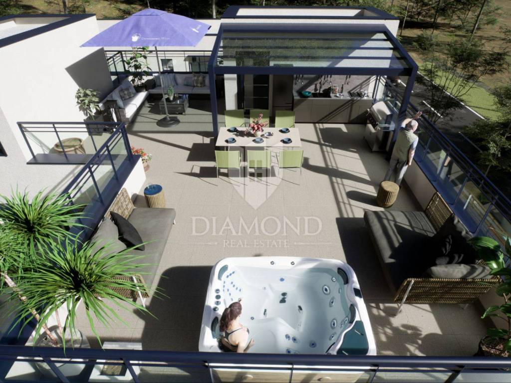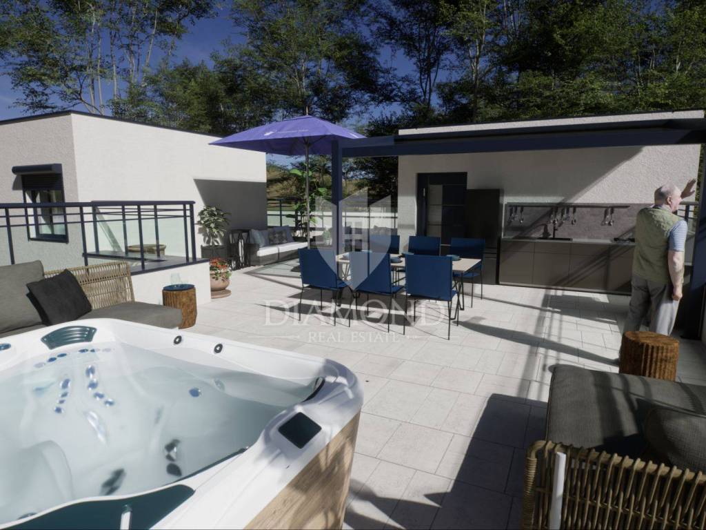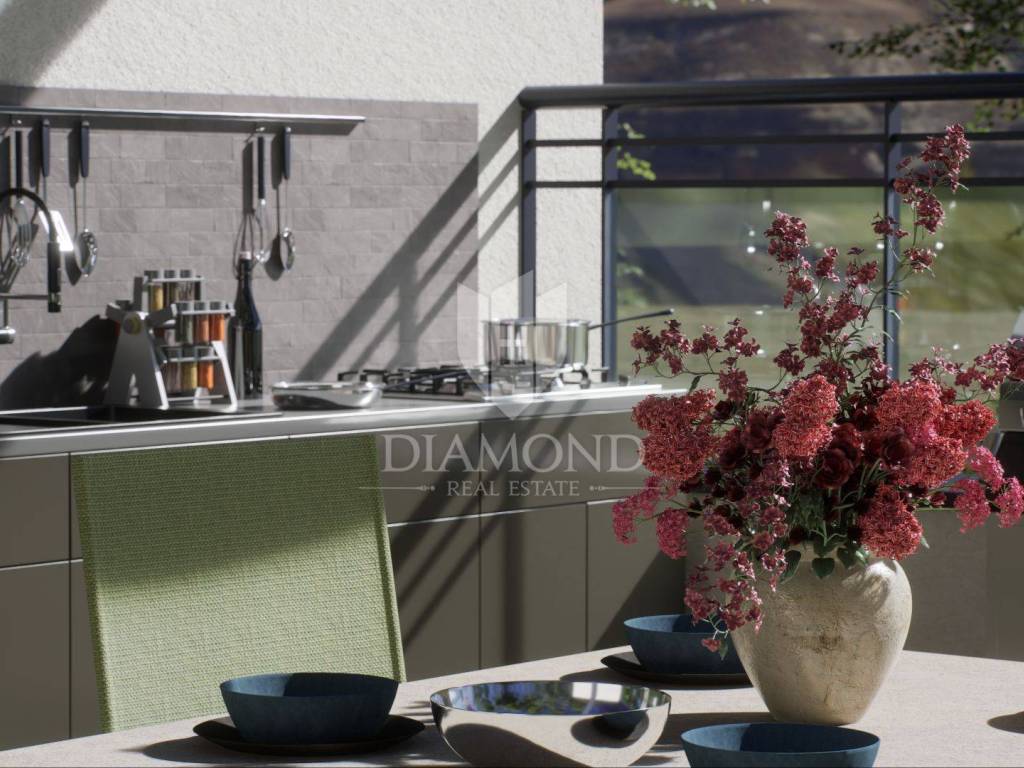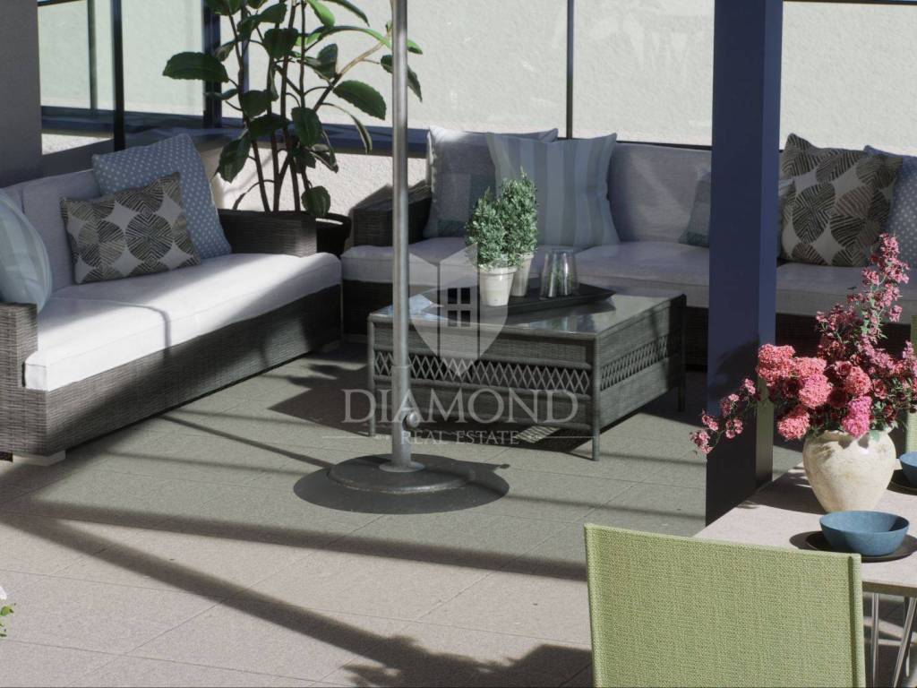 First floor apartment with private roof terrace and parking space - new construction in the suburbs of Poreč In a quiet and attractive settlement on the edge of Poreč, located just one kilometer from the sea and two kilometers from the city center, the construction of a modern residential building begins that will satisfy even the most demanding buyers. The first floor apartment offers the perfect combination of privacy, comfort and proximity to all important amenities, making it an excellent opportunity for living, vacation or investment. The apartment has been carefully designed to offer a spacious living room with dining room and kitchen in an open concept, while two bedrooms provide a quiet and comfortable space for relaxation. The master bedroom has its own bathroom, while the second bathroom is located right next to the second bedroom and living area. All rooms are air-conditioned, which allows for optimal temperature control throughout the year. What makes this property special is the large private roof terrace of 82.55 m², ideal for creating your own oasis of peace. There is the possibility of installing a jacuzzi, outdoor kitchen, sundeck or other amenities as desired, which further increases the quality of living and the value of the property. The entrance to the building and the internal staircase are also private and are used exclusively by the owners of this apartment, which further ensures a sense of exclusivity. This property is the perfect choice for those who want a combination of modern life, privacy and living space that can be adapted to individual wishes, all in an exceptional micro-location near the sea and the city. The apartment comes with one parking space, and the price is expressed with VAT included, which means that the buyer does not pay real estate transfer tax. Completion of construction is planned for 2026.
