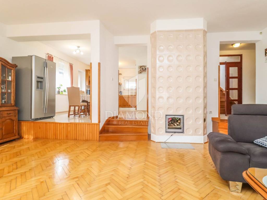 The house is detached and thoughtfully laid out for comfortable everyday living. The ground floor features an entrance area, bedroom, bathroom with shower and an additional room currently used as a laundry (with installations prepared for a WC). The heart of the home is the kitchen and spacious living room in warm tones, with plenty of wooden details and direct access to the garden. On the first floor there are three large bedrooms and a bathroom with bathtub. Two bedrooms open onto a large terrace overlooking the green surroundings – a perfect spot for morning coffee or an evening break. Comfort is enhanced by wooden parquet in the bedrooms and living room and solid wooden stairs that give the space timeless elegance. The outdoor area is designed for open-air enjoyment: an outdoor pool with new installations, a covered terrace for gatherings and a barbecue for long summer evenings. Additionally, the property includes a garage and a basement – practical spaces for storage and hobbies. The facade has been renovated, PVC windows have been installed and the overall impression is tidy, warm and ready for a new chapter.