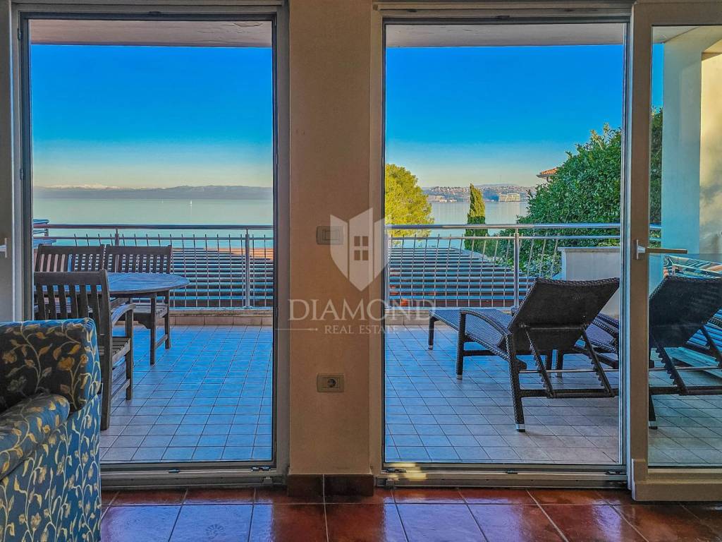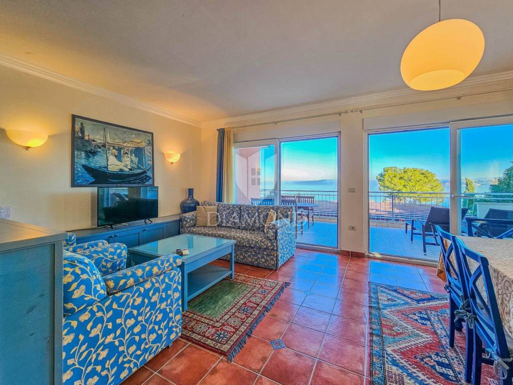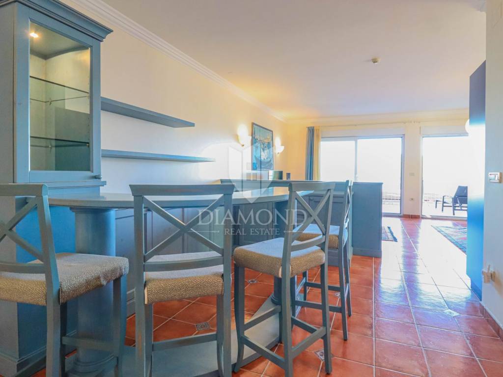 The apartment is located on the high ground floor of a residential building of a closed resort. The total area of the apartment is 119 m2. It consists of a living room with a kitchen and a dining room, a bathroom, 2 bedrooms, one of which is a master bedroom with its own bathroom, and a hallway. The living room leads to a spacious covered terrace with a view of the sea. The apartment is in excellent condition with heating and air conditioning. Has a storage room in the basement of the building. The parking lot is located in front of the building and the future owner can choose whether he wants covered parking at a price of 10,000 euros or a garage at a price of 20,000 euros.