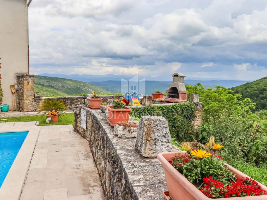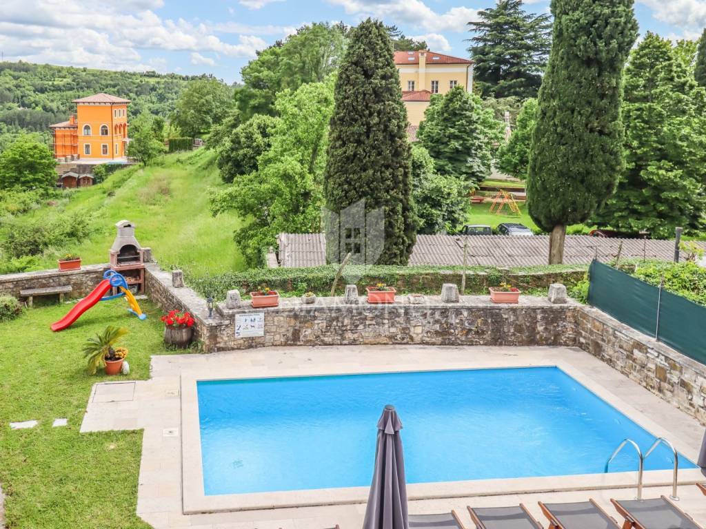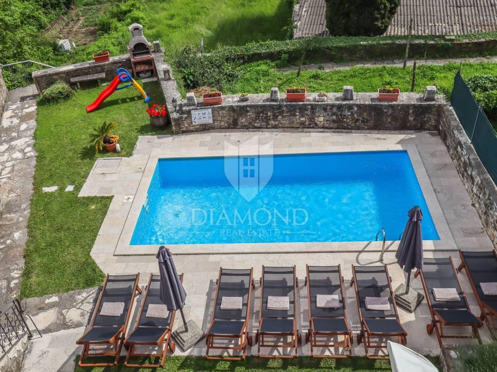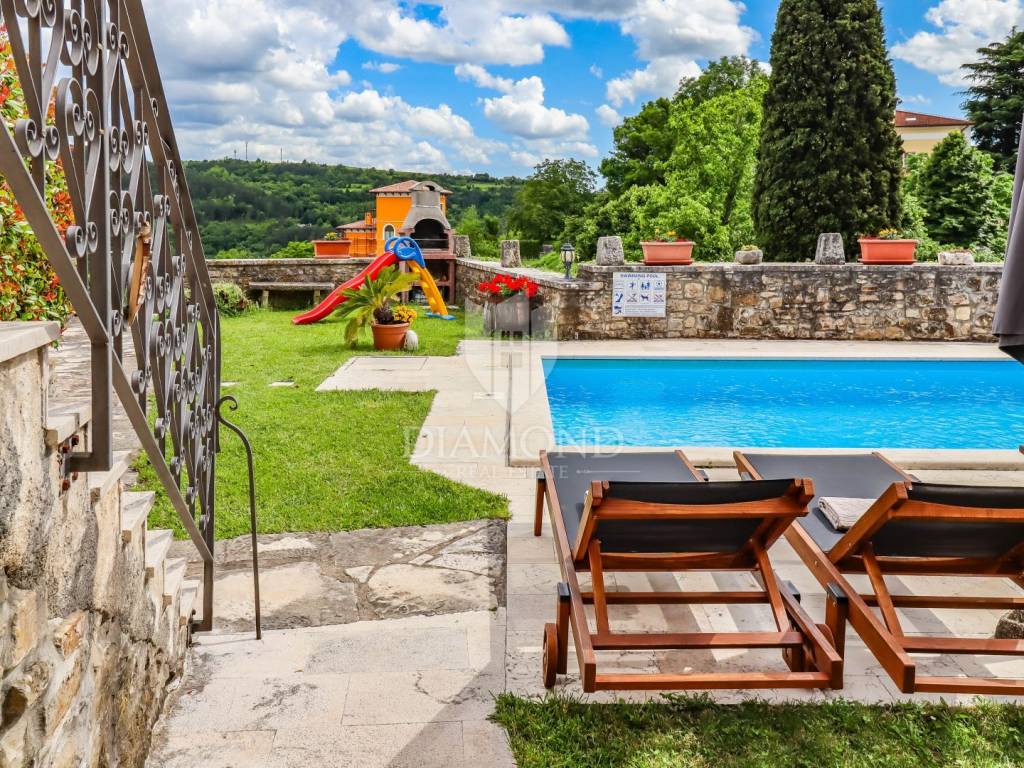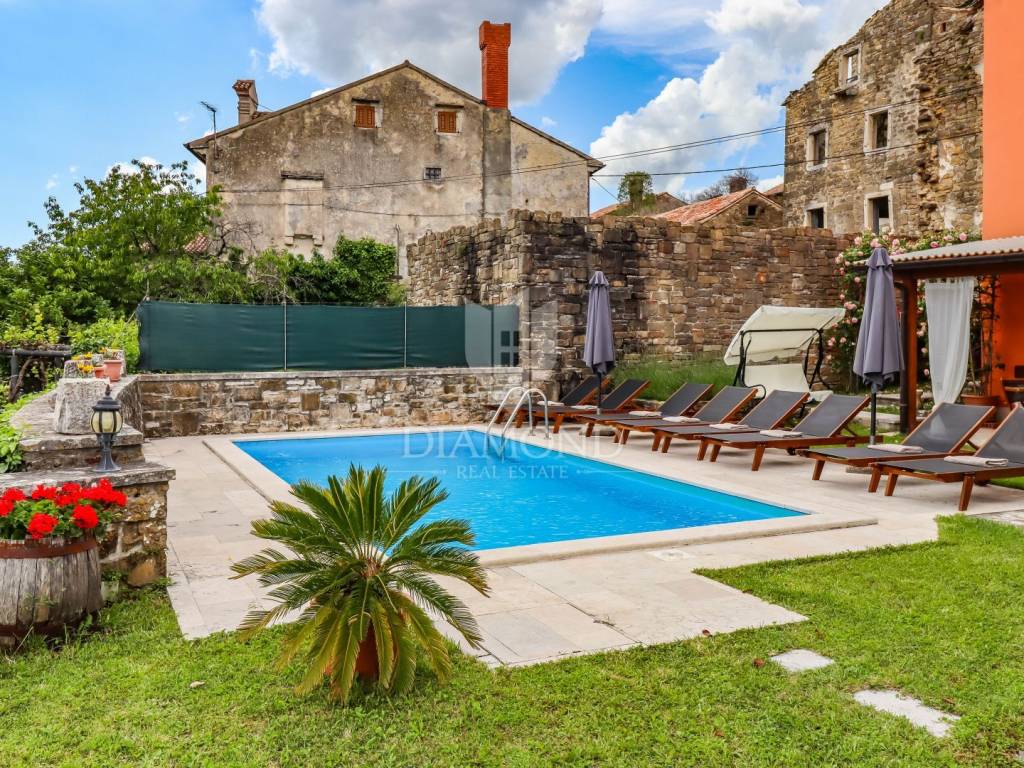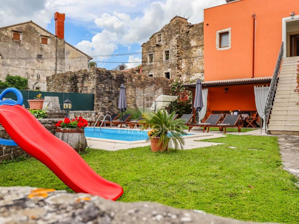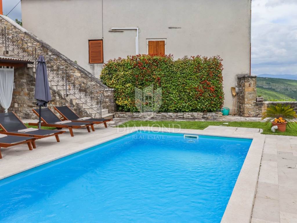 Istria, Buje, Surroundings A beautiful villa with a swimming pool and an unforgettable view of the Mirna river valley is for sale. It is located in a small and quiet settlement in the Istrian hills. Our villa consists of 3 bedrooms, a dining room with a living room, a kitchen, a terrace, 2 storage rooms, 1 toilet and a swimming pool with a sunbathing area. On the ground floor there is a kitchen from which we have an exit to the garden where there is a canopy with a large table and chairs, from the kitchen we take internal stairs to the dining room with a living room and a fireplace that gives us a pleasant feeling on cold days. On the first floor there is an entrance hall from which you enter two bedrooms with their own bathrooms, internal stairs lead to the second floor where there is one large room with a bathroom and a terrace of 16 m2 with a beautiful view of the Mirna Valley. The villa has a garden of approximately 250 m2 with its own pool of 24 m2, next to the pool there is a sun deck with deck chairs that provide the owners with a pleasant rest by the pool. Heating is by air conditioning and a wood-burning fireplace, and cooling is by air conditioning. The house was completely renovated in 2013 and there are no additional investments. The new owners can engage in tourist rentals in the summer season, the villa is already categorized and fulfills all the conditions for rent, the property is an opportunity for clients who are looking for a house to rent and who wanted to continue renting the property, thereby achieving a faster return on investment. It is located near various facilities, some of which are famous agrotourisms, famous wineries, restaurants, bicycle paths, promenades. The distance to Buje is 17 km, to the sea 30 km, to the border with Slovenia 20 km.