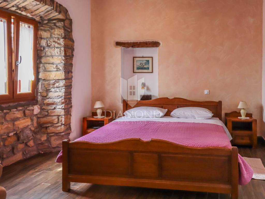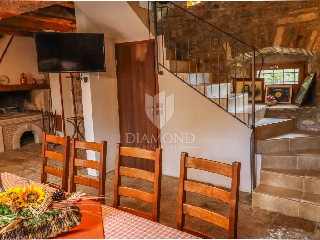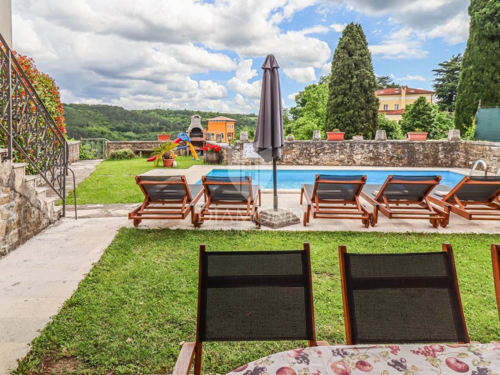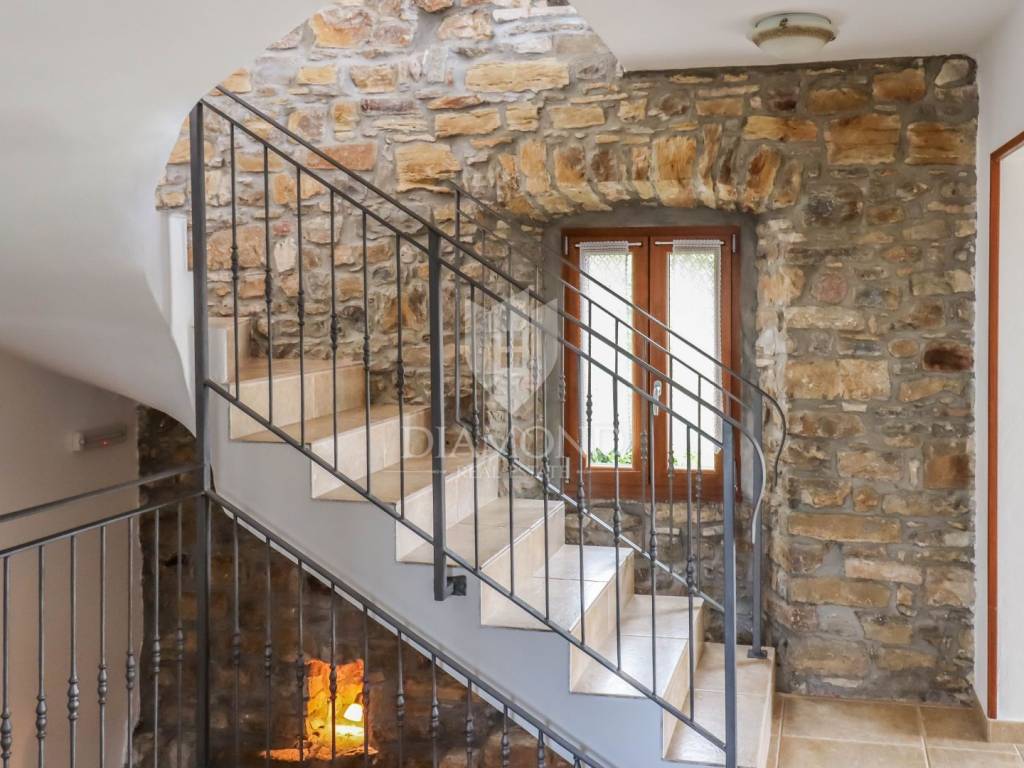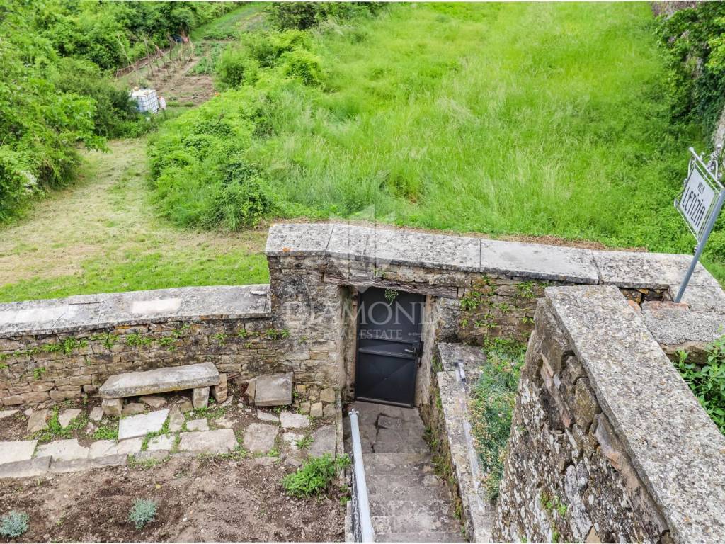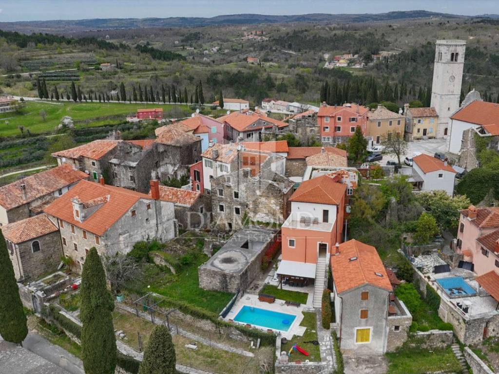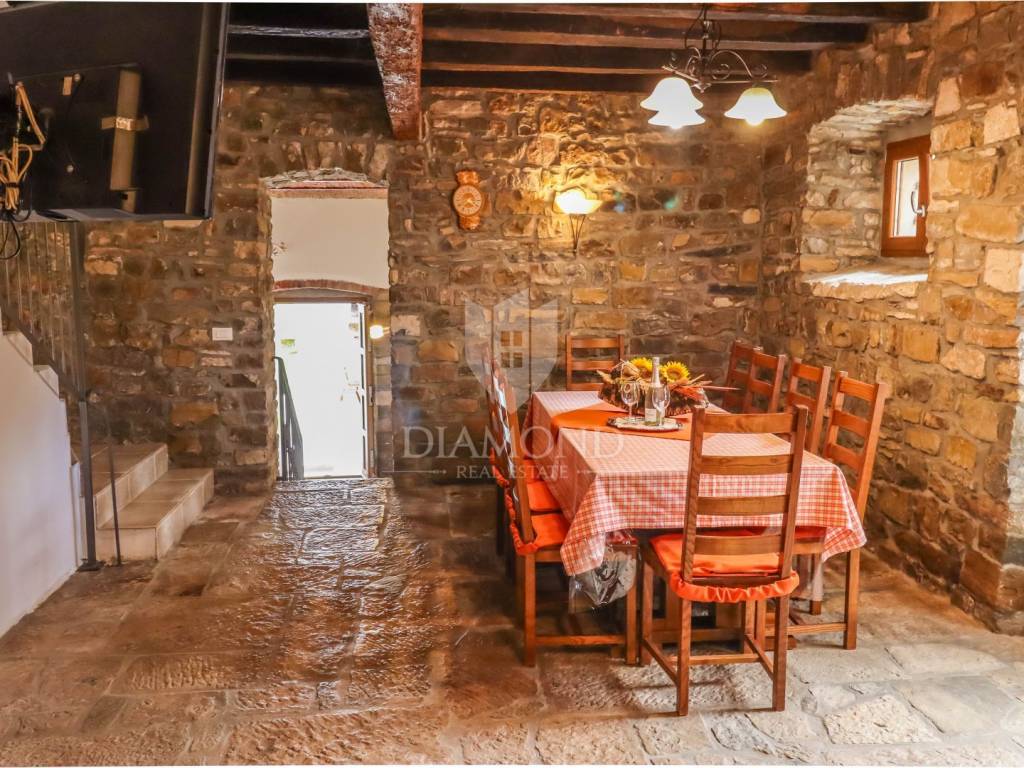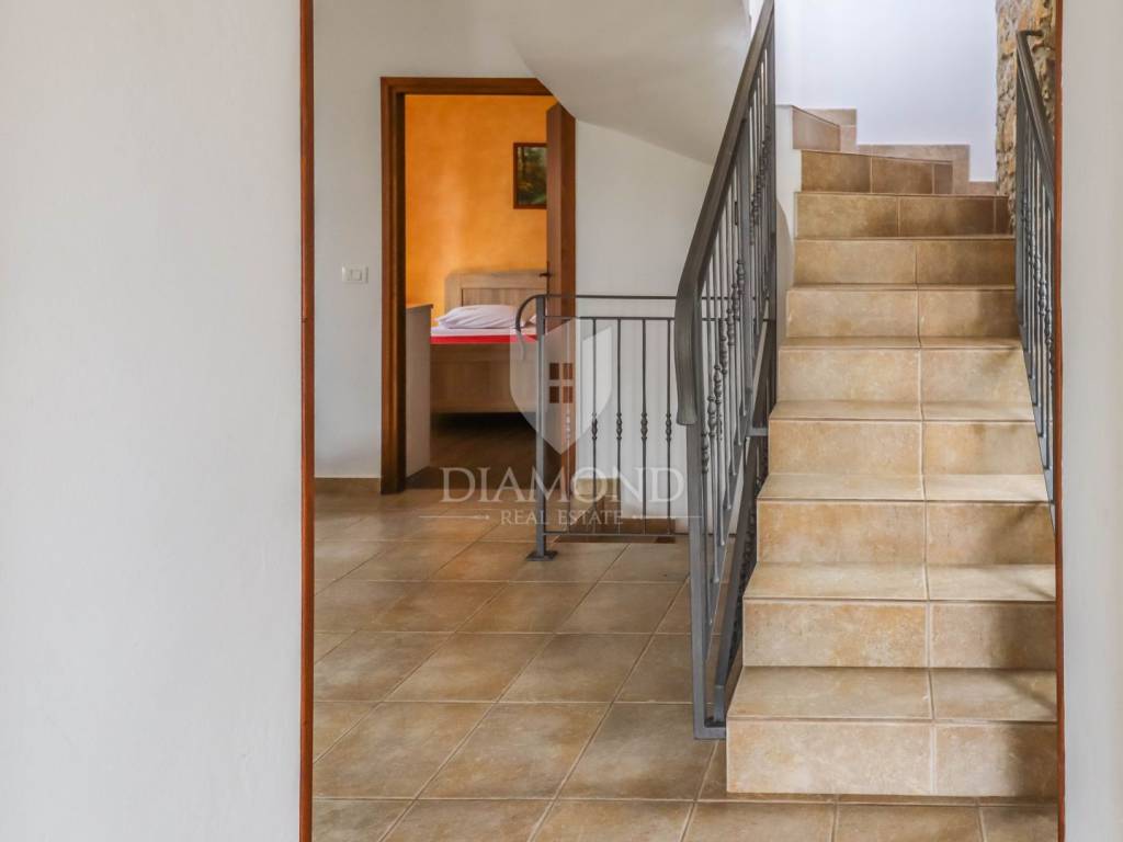 Istria, Buje, Surroundings A beautiful villa with a swimming pool and an unforgettable view of the Mirna river valley is for sale. It is located in a small and quiet settlement in the Istrian hills. Our villa consists of 3 bedrooms, a dining room with a living room, a kitchen, a terrace, 2 storage rooms, 1 toilet and a swimming pool with a sunbathing area. On the ground floor there is a kitchen from which we have an exit to the garden where there is a canopy with a large table and chairs, from the kitchen we take internal stairs to the dining room with a living room and a fireplace that gives us a pleasant feeling on cold days. On the first floor there is an entrance hall from which you enter two bedrooms with their own bathrooms, internal stairs lead to the second floor where there is one large room with a bathroom and a terrace of 16 m2 with a beautiful view of the Mirna Valley. The villa has a garden of approximately 250 m2 with its own pool of 24 m2, next to the pool there is a sun deck with deck chairs that provide the owners with a pleasant rest by the pool. Heating is by air conditioning and a wood-burning fireplace, and cooling is by air conditioning. The house was completely renovated in 2013 and there are no additional investments. The new owners can engage in tourist rentals in the summer season, the villa is already categorized and fulfills all the conditions for rent, the property is an opportunity for clients who are looking for a house to rent and who wanted to continue renting the property, thereby achieving a faster return on investment. It is located near various facilities, some of which are famous agrotourisms, famous wineries, restaurants, bicycle paths, promenades. The distance to Buje is 17 km, to the sea 30 km, to the border with Slovenia 20 km.