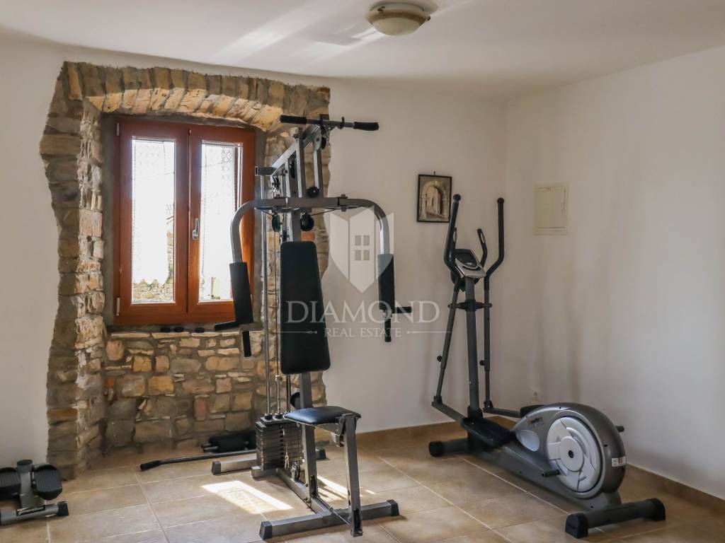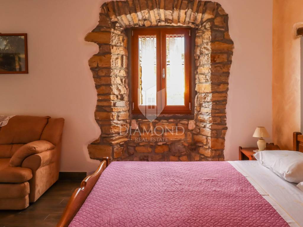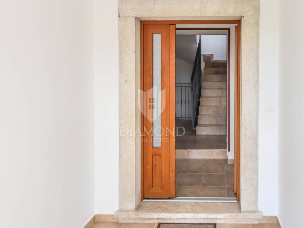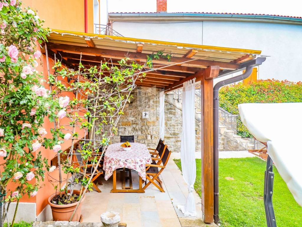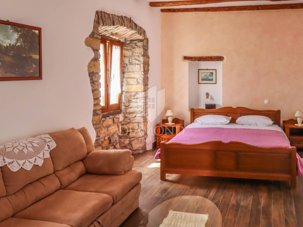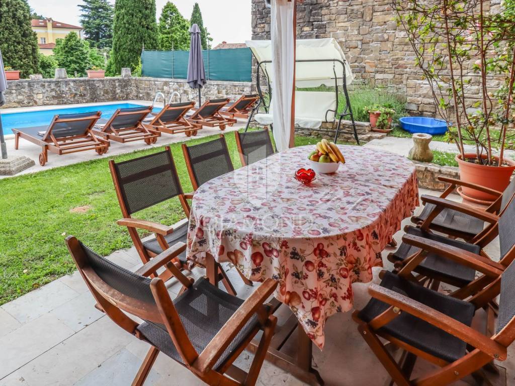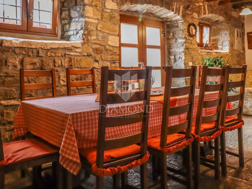 Istria, Buje, Surroundings A beautiful villa with a swimming pool and an unforgettable view of the Mirna river valley is for sale. It is located in a small and quiet settlement in the Istrian hills. Our villa consists of 3 bedrooms, a dining room with a living room, a kitchen, a terrace, 2 storage rooms, 1 toilet and a swimming pool with a sunbathing area. On the ground floor there is a kitchen from which we have an exit to the garden where there is a canopy with a large table and chairs, from the kitchen we take internal stairs to the dining room with a living room and a fireplace that gives us a pleasant feeling on cold days. On the first floor there is an entrance hall from which you enter two bedrooms with their own bathrooms, internal stairs lead to the second floor where there is one large room with a bathroom and a terrace of 16 m2 with a beautiful view of the Mirna Valley. The villa has a garden of approximately 250 m2 with its own pool of 24 m2, next to the pool there is a sun deck with deck chairs that provide the owners with a pleasant rest by the pool. Heating is by air conditioning and a wood-burning fireplace, and cooling is by air conditioning. The house was completely renovated in 2013 and there are no additional investments. The new owners can engage in tourist rentals in the summer season, the villa is already categorized and fulfills all the conditions for rent, the property is an opportunity for clients who are looking for a house to rent and who wanted to continue renting the property, thereby achieving a faster return on investment. It is located near various facilities, some of which are famous agrotourisms, famous wineries, restaurants, bicycle paths, promenades. The distance to Buje is 17 km, to the sea 30 km, to the border with Slovenia 20 km.