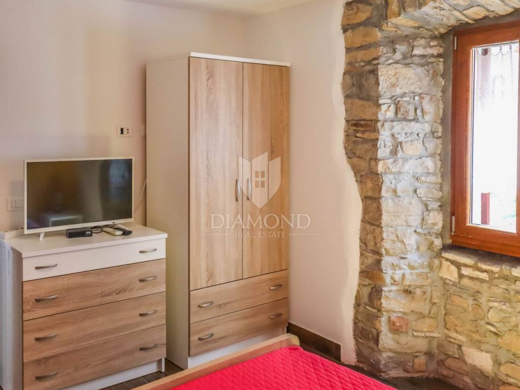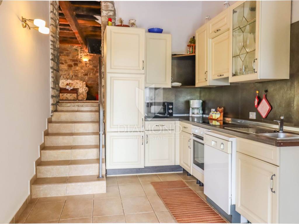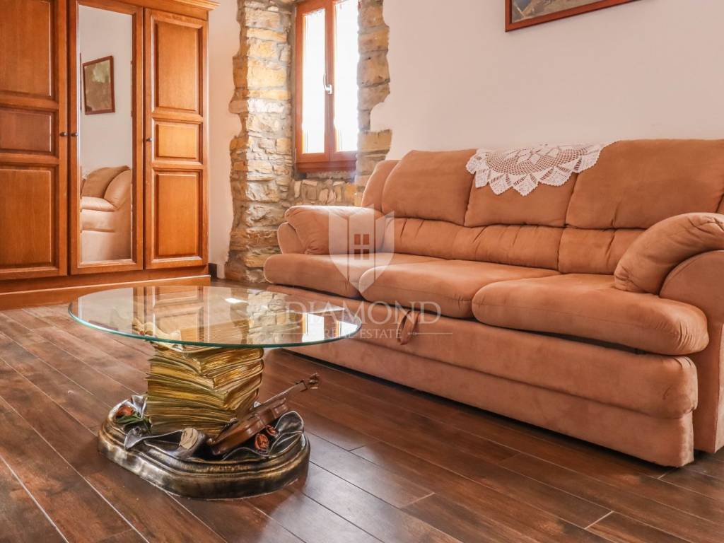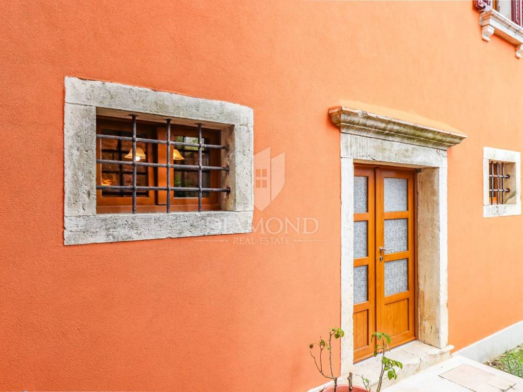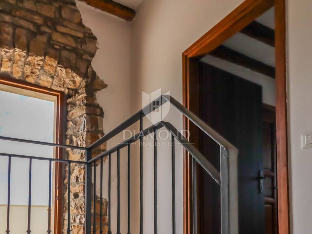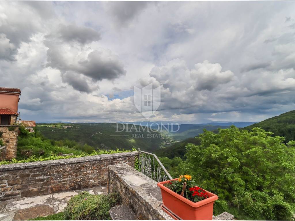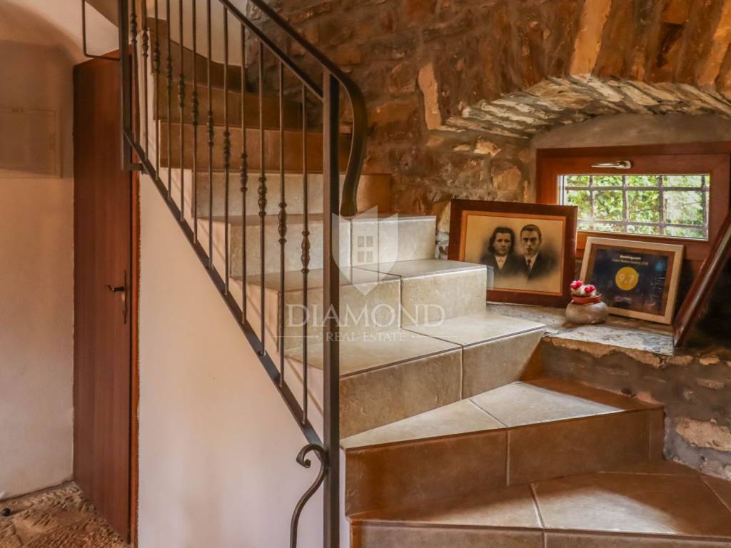 Istria, Buje, Surroundings A beautiful villa with a swimming pool and an unforgettable view of the Mirna river valley is for sale. It is located in a small and quiet settlement in the Istrian hills. Our villa consists of 3 bedrooms, a dining room with a living room, a kitchen, a terrace, 2 storage rooms, 1 toilet and a swimming pool with a sunbathing area. On the ground floor there is a kitchen from which we have an exit to the garden where there is a canopy with a large table and chairs, from the kitchen we take internal stairs to the dining room with a living room and a fireplace that gives us a pleasant feeling on cold days. On the first floor there is an entrance hall from which you enter two bedrooms with their own bathrooms, internal stairs lead to the second floor where there is one large room with a bathroom and a terrace of 16 m2 with a beautiful view of the Mirna Valley. The villa has a garden of approximately 250 m2 with its own pool of 24 m2, next to the pool there is a sun deck with deck chairs that provide the owners with a pleasant rest by the pool. Heating is by air conditioning and a wood-burning fireplace, and cooling is by air conditioning. The house was completely renovated in 2013 and there are no additional investments. The new owners can engage in tourist rentals in the summer season, the villa is already categorized and fulfills all the conditions for rent, the property is an opportunity for clients who are looking for a house to rent and who wanted to continue renting the property, thereby achieving a faster return on investment. It is located near various facilities, some of which are famous agrotourisms, famous wineries, restaurants, bicycle paths, promenades. The distance to Buje is 17 km, to the sea 30 km, to the border with Slovenia 20 km.