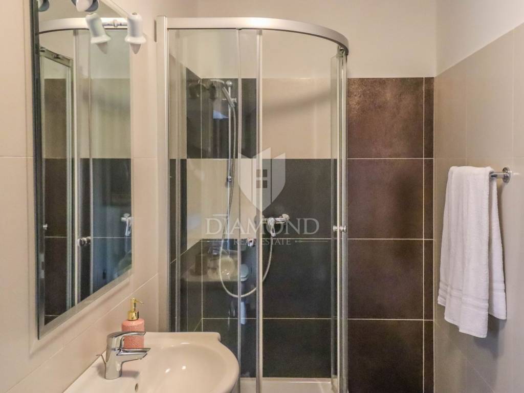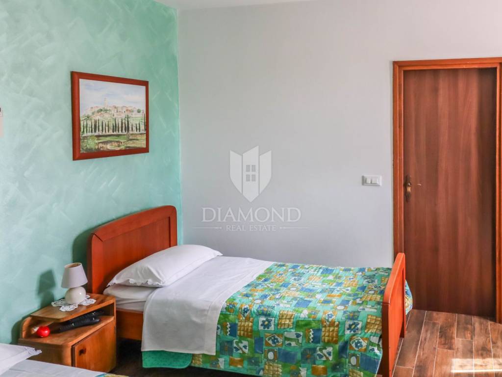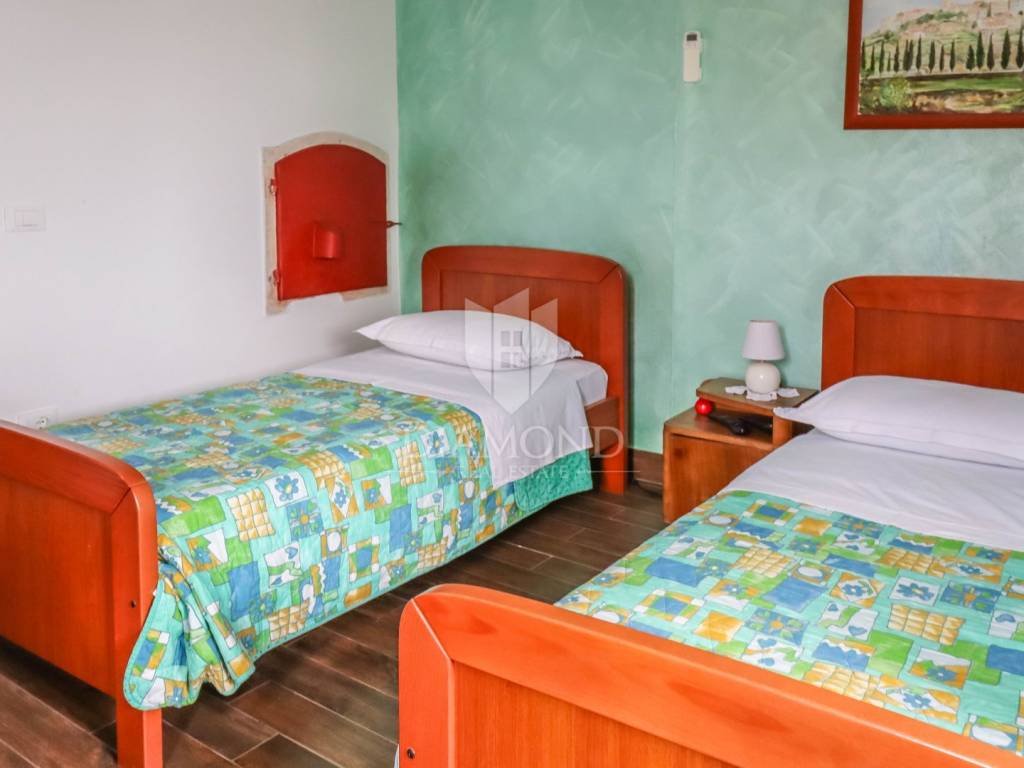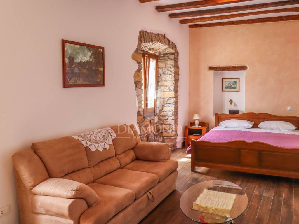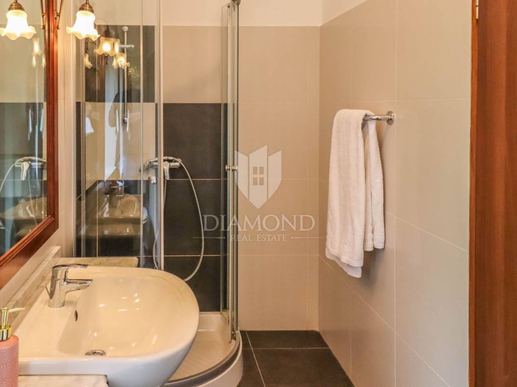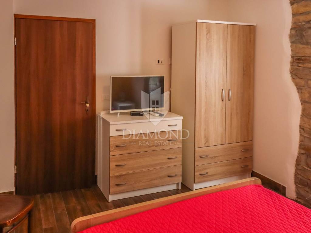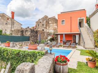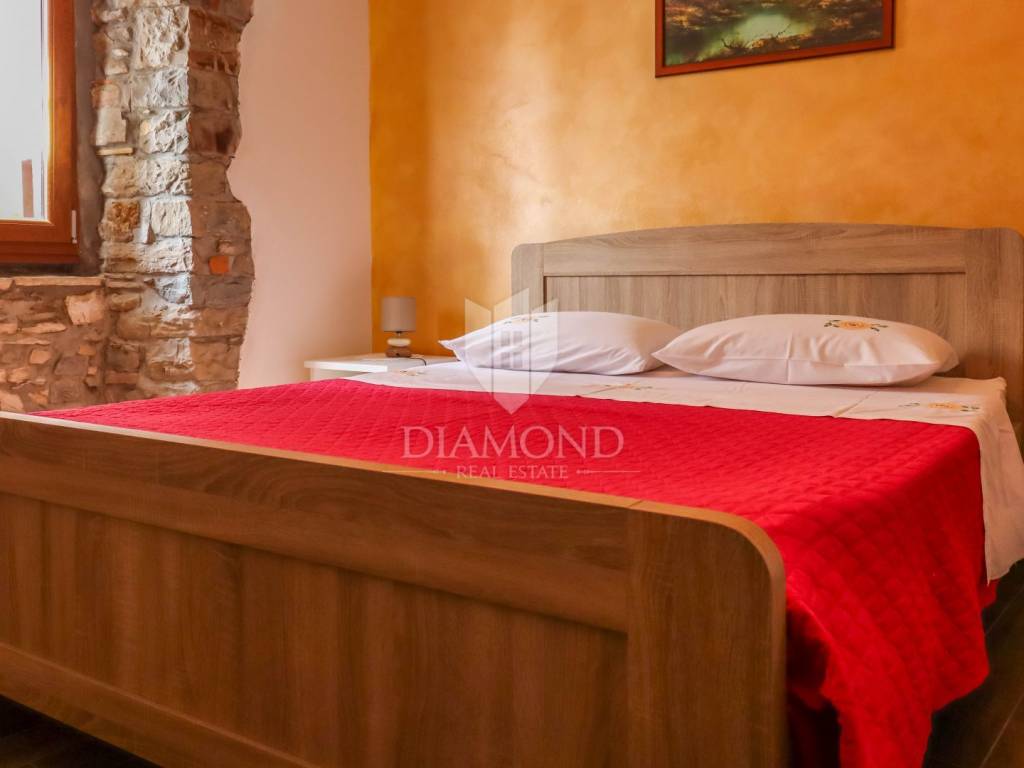 Istria, Buje, Surroundings A beautiful villa with a swimming pool and an unforgettable view of the Mirna river valley is for sale. It is located in a small and quiet settlement in the Istrian hills. Our villa consists of 3 bedrooms, a dining room with a living room, a kitchen, a terrace, 2 storage rooms, 1 toilet and a swimming pool with a sunbathing area. On the ground floor there is a kitchen from which we have an exit to the garden where there is a canopy with a large table and chairs, from the kitchen we take internal stairs to the dining room with a living room and a fireplace that gives us a pleasant feeling on cold days. On the first floor there is an entrance hall from which you enter two bedrooms with their own bathrooms, internal stairs lead to the second floor where there is one large room with a bathroom and a terrace of 16 m2 with a beautiful view of the Mirna Valley. The villa has a garden of approximately 250 m2 with its own pool of 24 m2, next to the pool there is a sun deck with deck chairs that provide the owners with a pleasant rest by the pool. Heating is by air conditioning and a wood-burning fireplace, and cooling is by air conditioning. The house was completely renovated in 2013 and there are no additional investments. The new owners can engage in tourist rentals in the summer season, the villa is already categorized and fulfills all the conditions for rent, the property is an opportunity for clients who are looking for a house to rent and who wanted to continue renting the property, thereby achieving a faster return on investment. It is located near various facilities, some of which are famous agrotourisms, famous wineries, restaurants, bicycle paths, promenades. The distance to Buje is 17 km, to the sea 30 km, to the border with Slovenia 20 km.