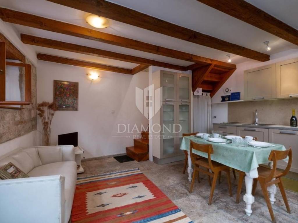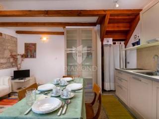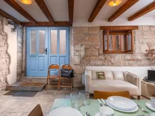 The house is located just a few steps from the sea, yet in a quiet and less frequented street, ensuring privacy and peace even during the peak tourist season. This is an autochthonous stone house that has been completely renovated and carefully maintained over the years. With a total area of 84 m², it is arranged over two floors. The ground floor features a cozy living room connected to the kitchen, as well as an additional room that once served as a cellar and is now arranged as a relaxation area, particularly pleasant during the summer months due to its natural coolness. The upper floor offers two bedrooms and a spacious bathroom, designed to provide maximum comfort.