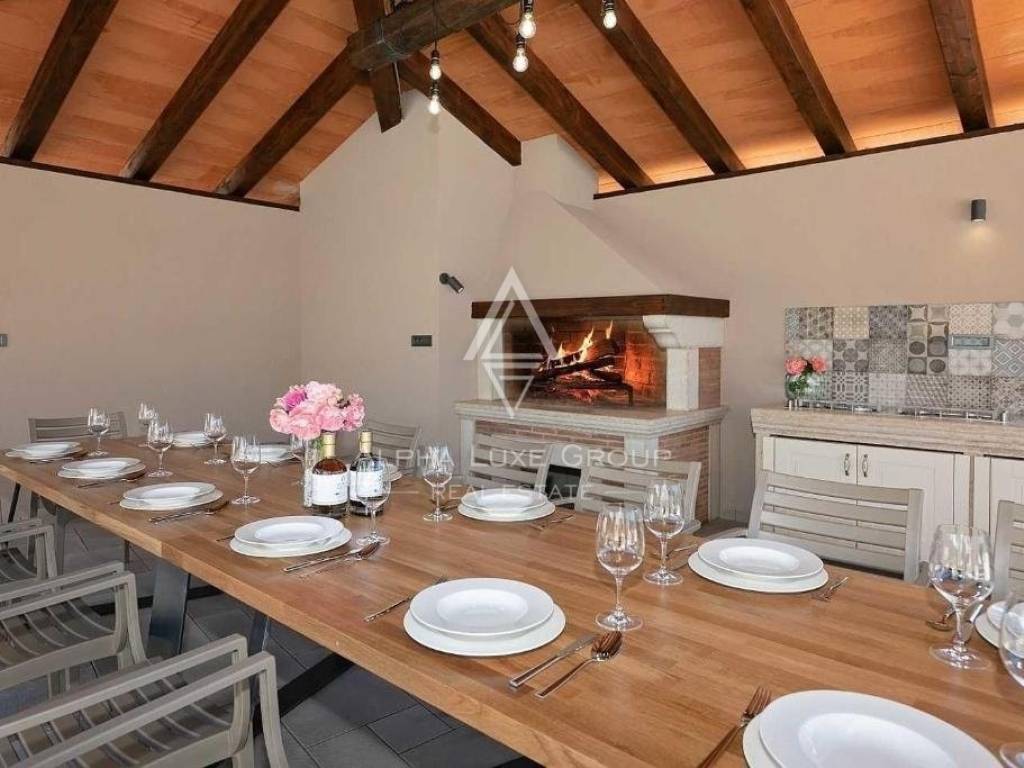 A garden filled with carefully maintained flora, a swimming pool with a jacuzzi, a summer kitchen with a covered terrace, and parking in the yard. The garden plot has an open view of nature and greenery and is completely fenced for privacy purposes.
