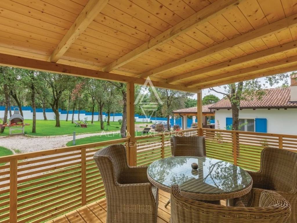 The spacious and beautifully landscaped garden is fenced, which provides complete peace and privacy. It has a mobile home, barbecue, outdoor shower, children's playground, and four parking spaces.