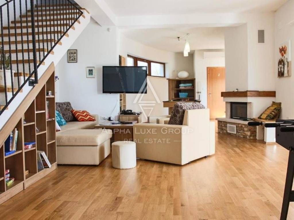 The house is fully air-conditioned, has the first phase of underfloor heating, has a fireplace, swimming pool with sun deck, landscaped spacious garden of 2000 m2 with lawn, children's playground and parking for several cars.