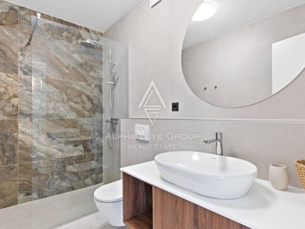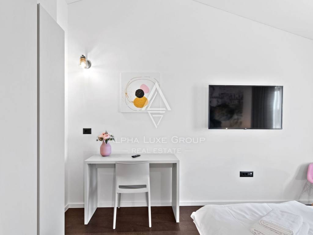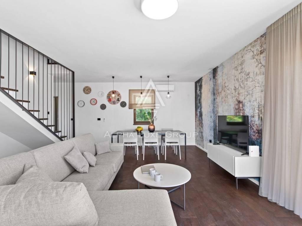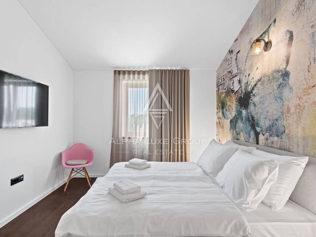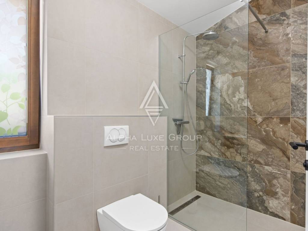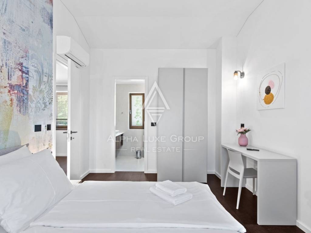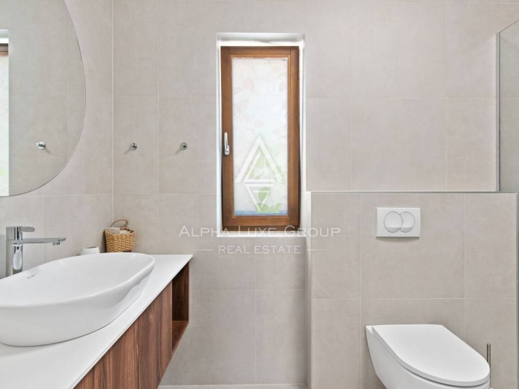 The villa, with its spacious 198 m2 layout, is set in a tranquil rural backdrop, perfect for those seeking peace. It features four elegant bedrooms each accompanied by modern bathrooms, alongside an open-plan living room, kitchen, and dining area that exemplify contemporary living. The construction incorporates high-quality materials, and the residence comes fully furnished and equipped, with underfloor heating and air-conditioned rooms for year-round comfort.