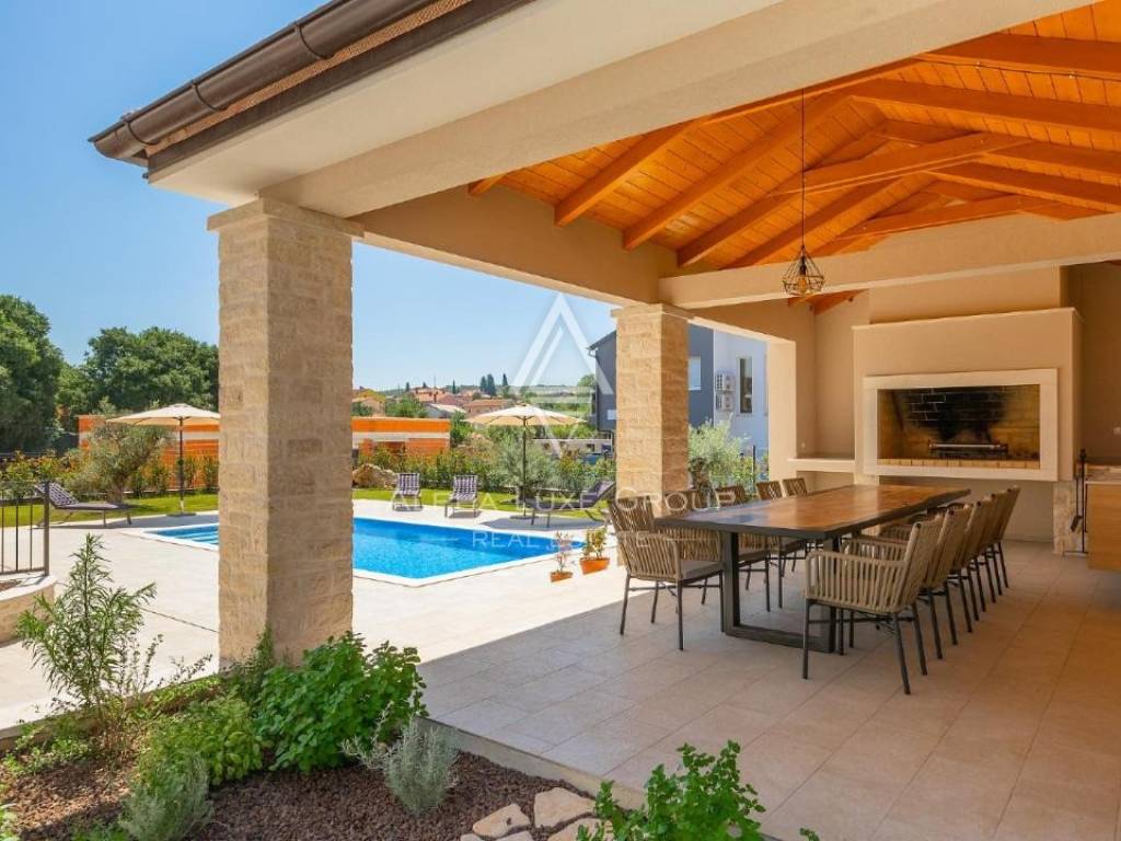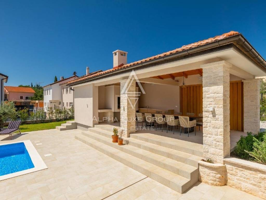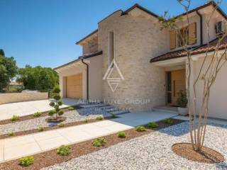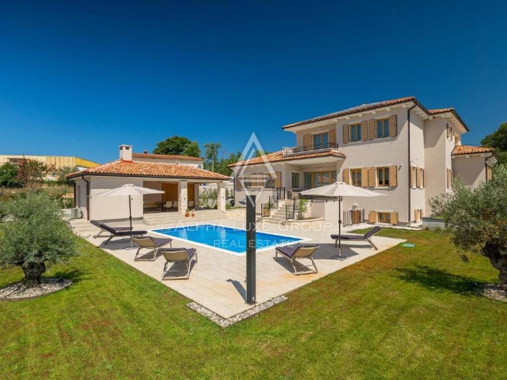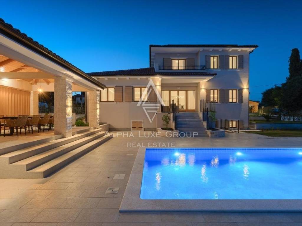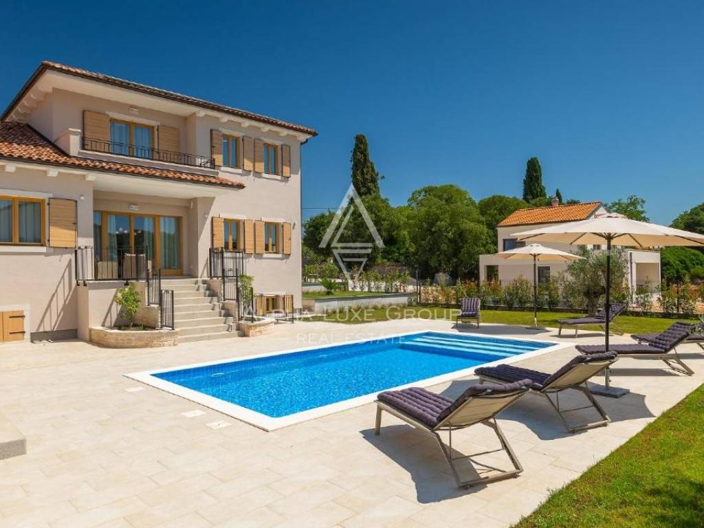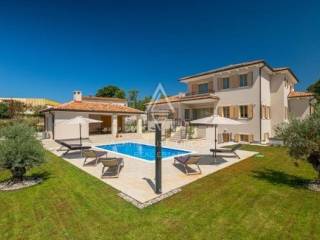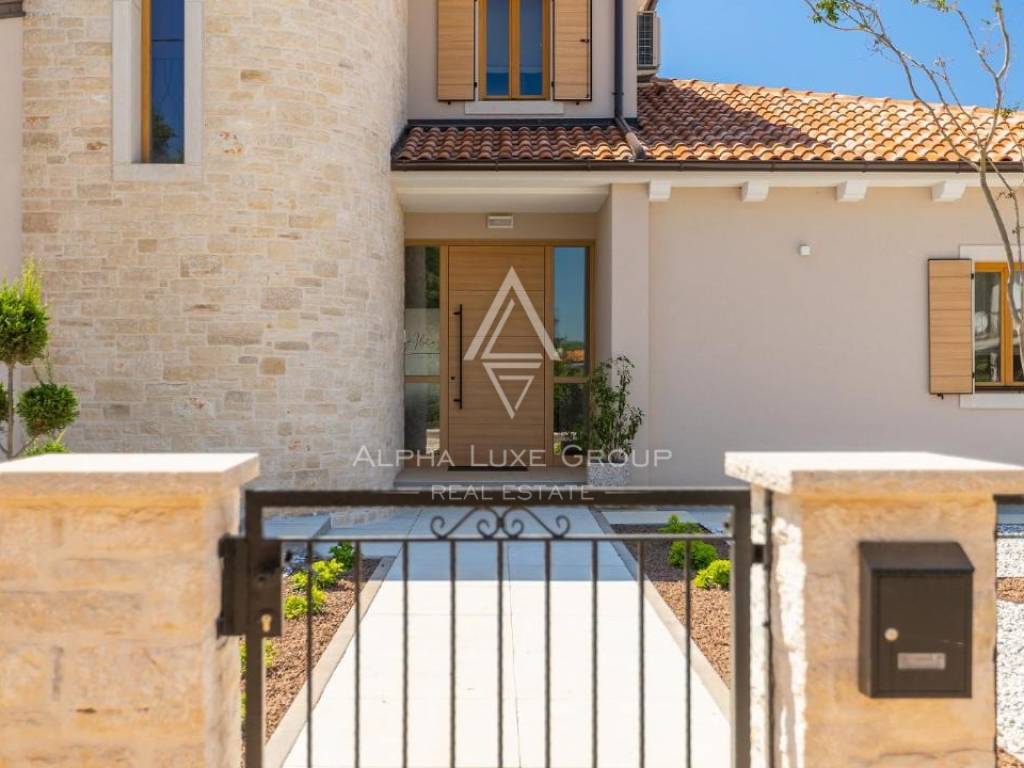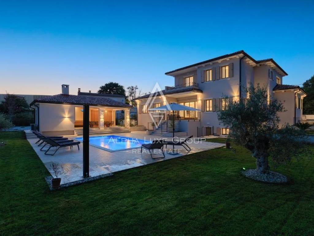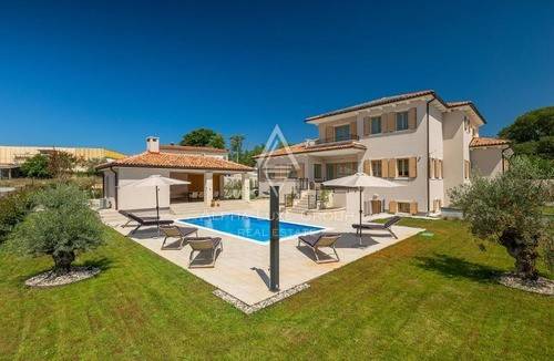 Located on the western coast of Istria near the renowned town of Rovinj, this Mediterranean inspired villa offers an exceptional combination of refined living, generous interior volumes and premium leisure amenities. Positioned on a landscaped plot of 1208 m², the residence extends across 438 m² of net usable space distributed over three levels, each designed for comfort and high quality living.