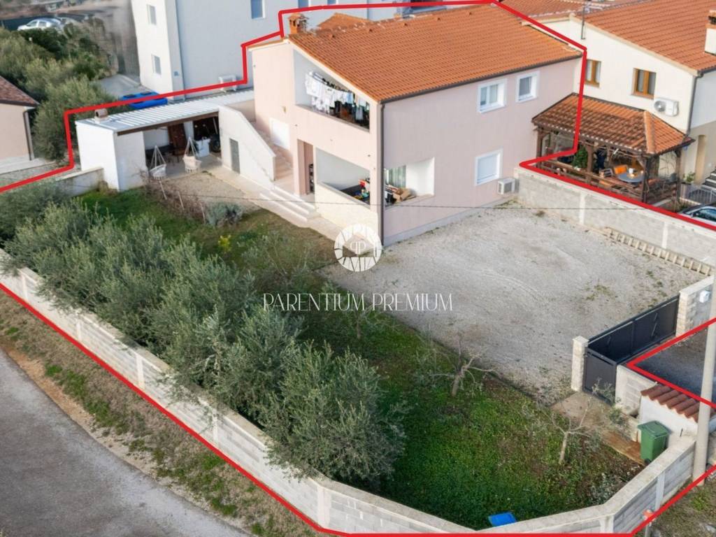 Istria, PorečA house with two registered apartments is for sale, located in a quiet area near Poreč, featuring a spacious garden, olive grove, and an open traditional cellar.The house extends over the ground floor and first floor, with a total living area of 157.35 m², situated on a landscaped plot of 330 m², with an additional 25 m² open cellar.The ground-floor apartment, with a surface area of 75.30 m², consists of an entrance area, two bedrooms, a bathroom, a kitchen with dining area, and a living room with access to a covered terrace, ideal for outdoor living.The first-floor apartment, with a total area of 82.05 m², has a separate entrance and its own staircase, ensuring complete privacy. It comprises an entrance hallway, three bedrooms, a bathroom, and a spacious living room with kitchen and dining area, leading to a large covered terrace, perfect for morning coffee or evening relaxation.Heating and cooling are provided via air-conditioning units, while an additional heating option is available through a chimney for a pellet or wood-burning stove. The first phase of installations for central heating radiators has also been completed throughout the house.In front of the house there is a beautifully landscaped garden with an olive grove, three parking spaces, and an electric entrance gate.A special atmosphere is created by the open cellar with a fireplace, designed as a space for social gatherings, barbecues, and enjoyment with family and friends. The house also includes a boiler room and a storage room for practical use.The property is sold fully furnished.This house represents an excellent opportunity for family living, permanent residence, or as a secure rental investment.
