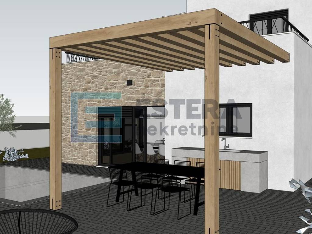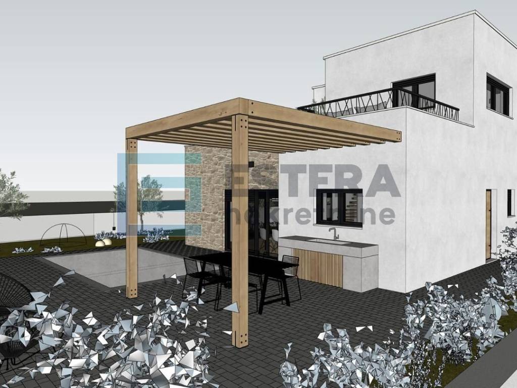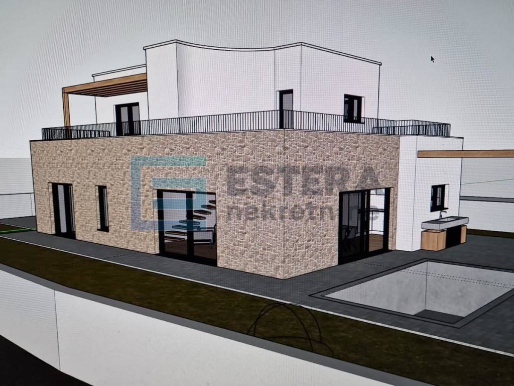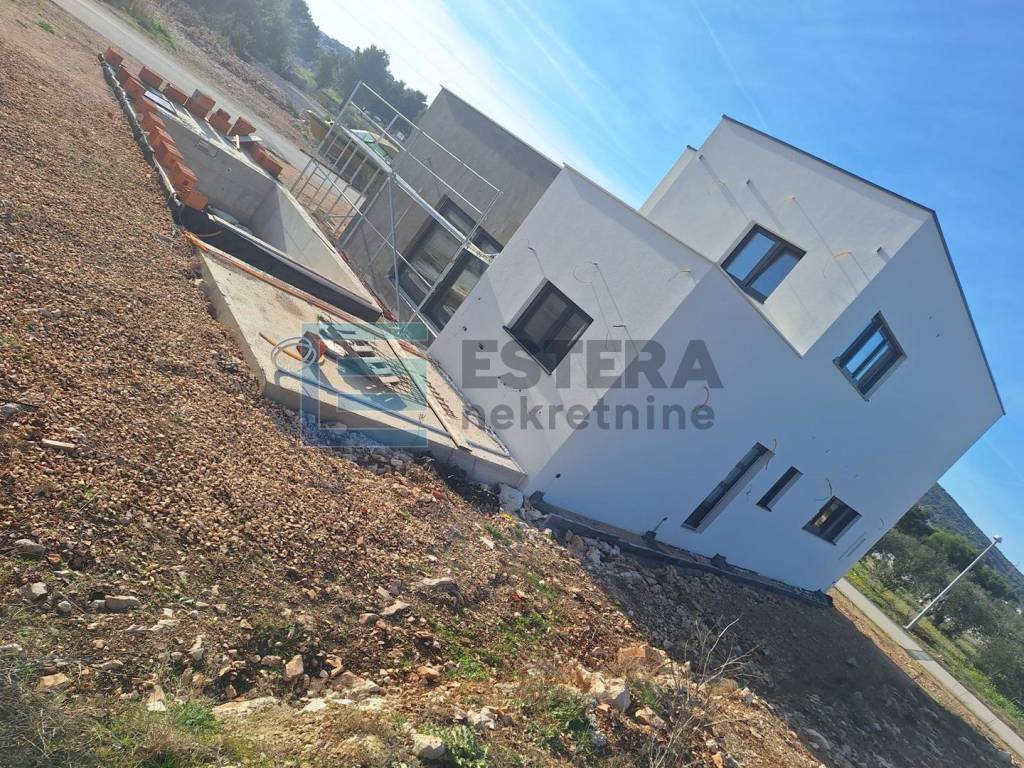Opis: Na prodaju moderna vila s bazenom u gradu Vodice, jednom od najpopularnijih turističkih mjesta na Jadranu. Kuća se gradi na zemljištu 497 m2, ukupne neto površine 176,40 m2 raspoređene na dvije etaže.