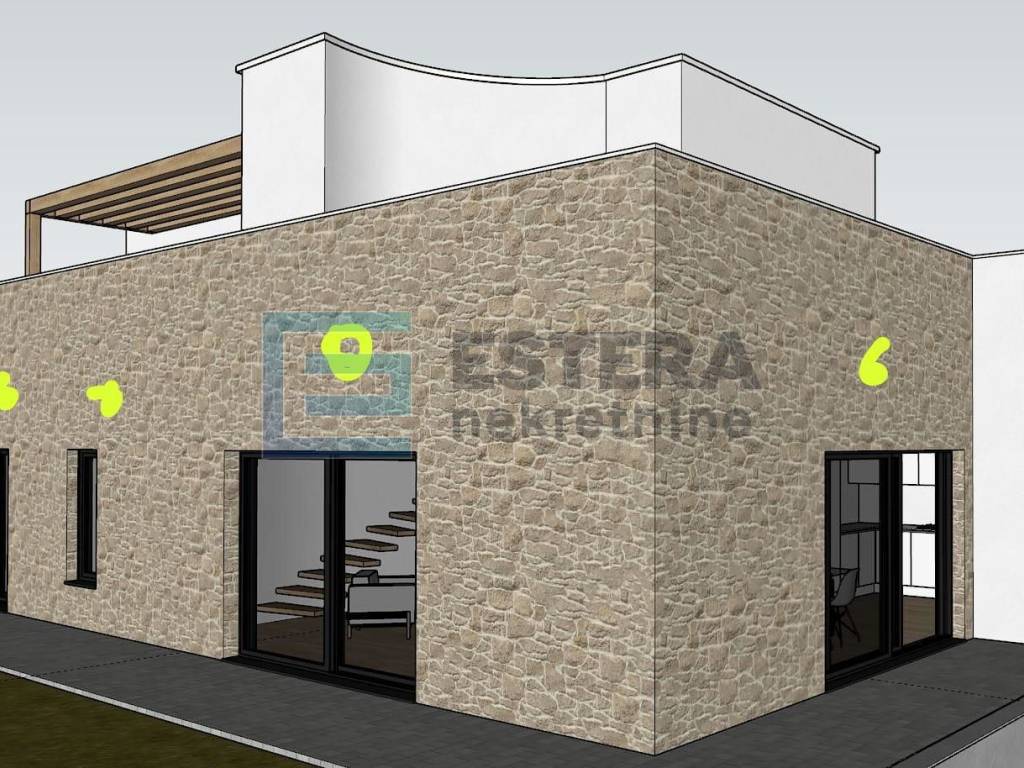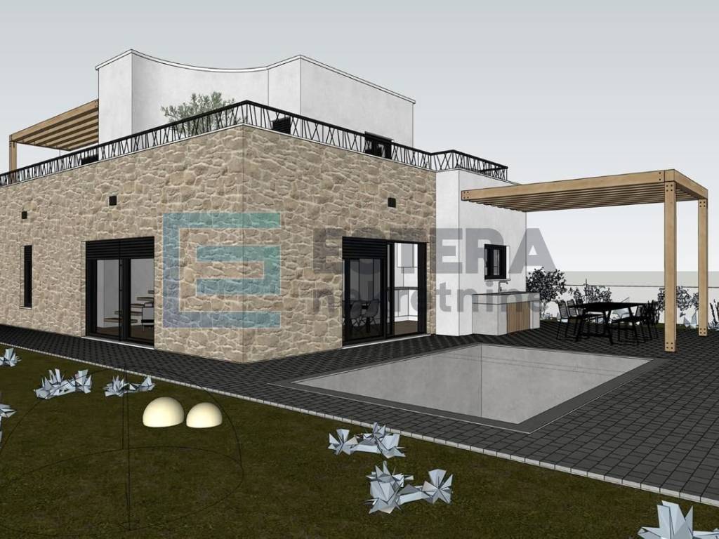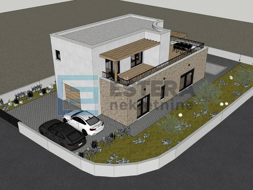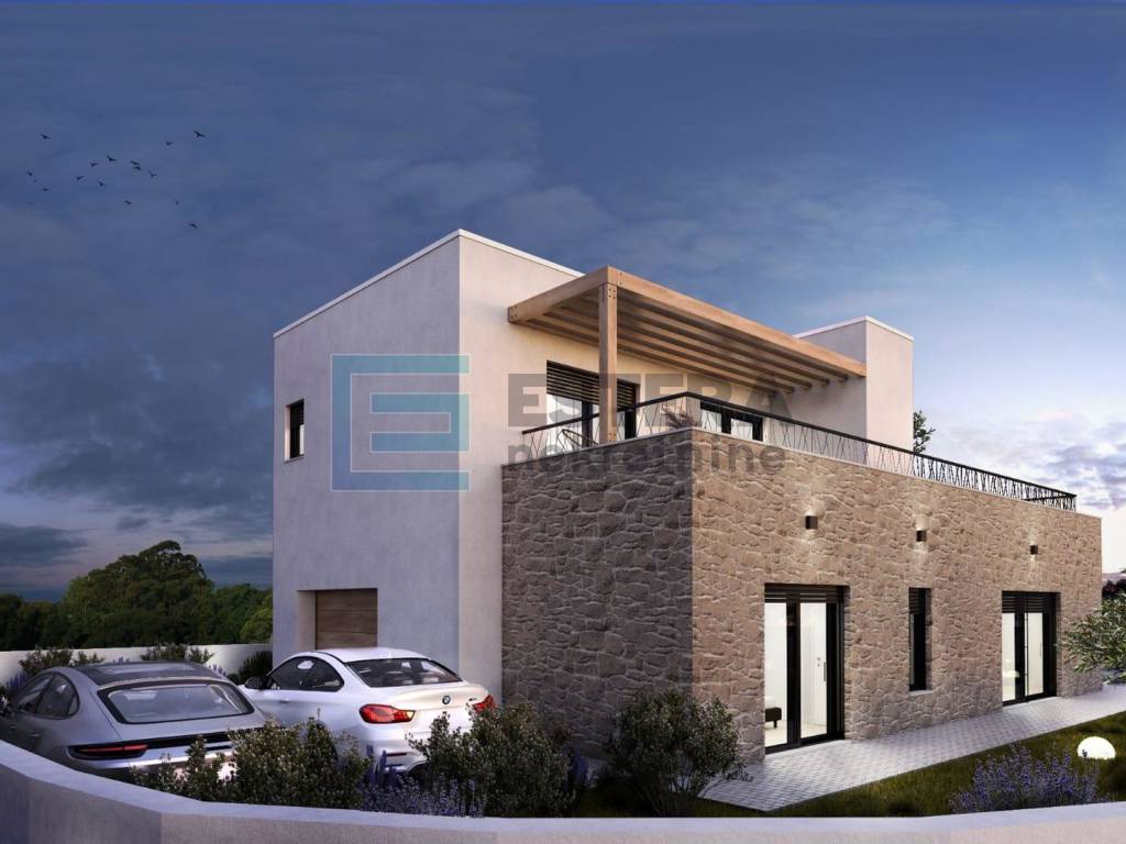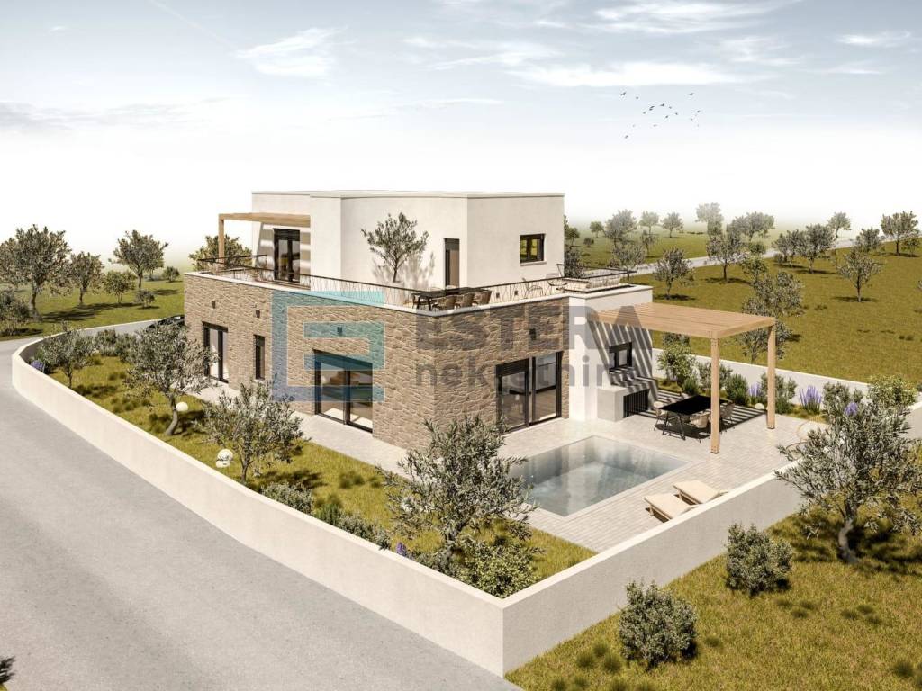 Opis: Na prodaju moderna vila s bazenom u gradu Vodice, jednom od najpopularnijih turističkih mjesta na Jadranu. Kuća se gradi na zemljištu 497 m2, ukupne neto površine 176,40 m2 raspoređene na dvije etaže.