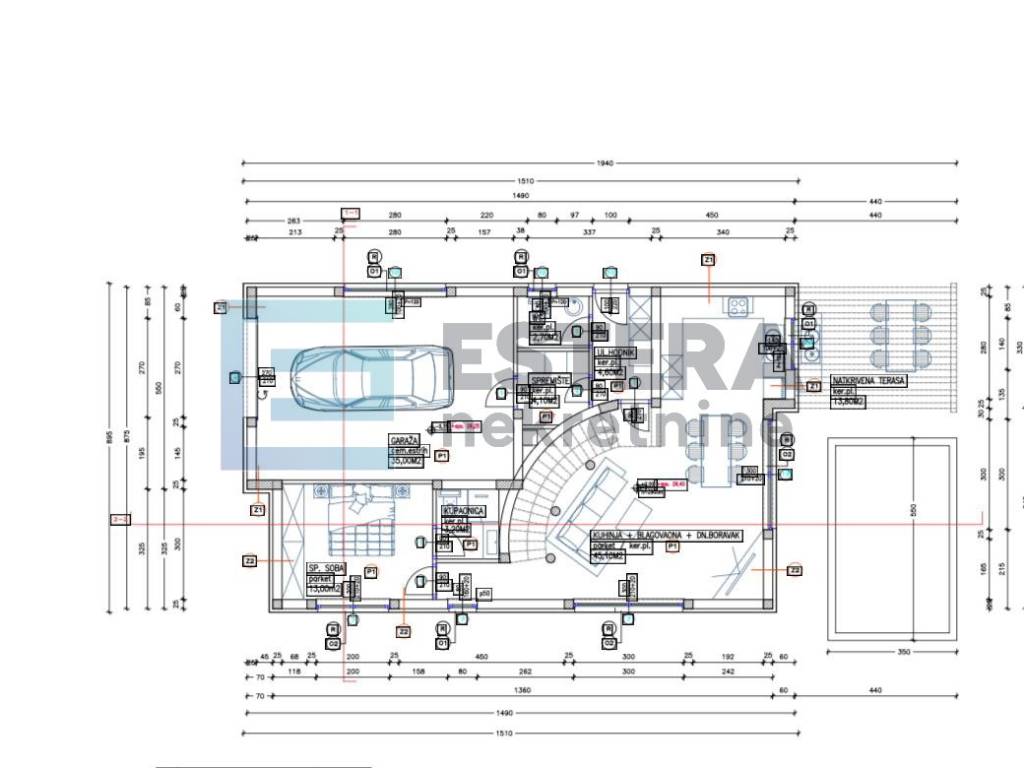 - Bazen 19,40 m2, vanjski tuš, predviđena vanjska kuhinja, roštilj, veliki natkriveni prostor za druženje, 3 parkirna mjesta.