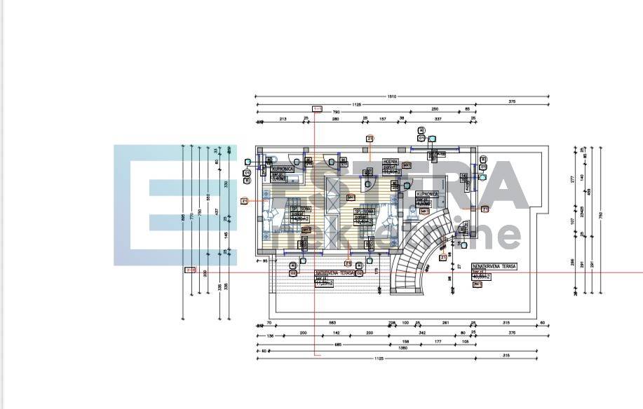 - I kat (61,80 m2): hodnik, 2 spavaće sobe svaka s vlastitom kupaonicom i izlazom na terase — natkrivena terasa cca 11 m2 i nenatkrivena terasa cca 40 m2 (terase povezane; predviđena ljetna kuhinja).
