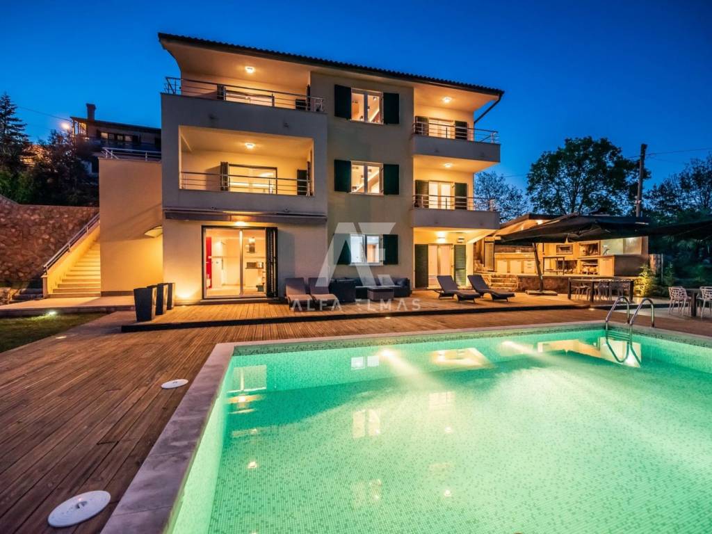 Opatija, surroundings, luxury villa with a swimming pool with a magnificent view of the beauty of the city and the blue Adriatic Sea, total living area 404m2, located on a plot of 1500m2. The property has a basement, ground floor and first floor. This beautiful, luxurious villa consists of three separate apartments, each floor has a living room, dining room and kitchen, two bedrooms and a bathroom are located on the ground floor, and on the first and second floor there are four bedrooms and two bathrooms each. Each floor of the villa has underfloor heating, an air conditioning system, a modern kitchen equipped with top-quality appliances where the future owners will surely enjoy preparing delicious delicacies for family and friends, a dining area and, above all, a comfortable living room ideal for afternoon and evening relaxation. The luxurious interior of the villa in the vicinity of Opatija is dominated by a rich spectrum of muted, neutral, golden and milky tones, giving it a dose of warmth, character and charm. The combination of innovative lighting fixtures and decorative details creates an interesting spatial dynamic in which the future owners will feel comfortable and relaxed. In the 1500 m2 large, completely fenced yard of the villa, there is a spacious swimming pool, measuring 5 m x 8 m. In the beautifully landscaped yard, there is also a summer kitchen with a charcoal/wood grill and an outdoor dining table with which the future owners and their friends will surely spend many pleasant moments.