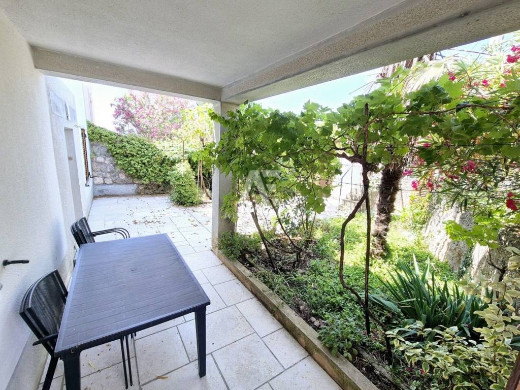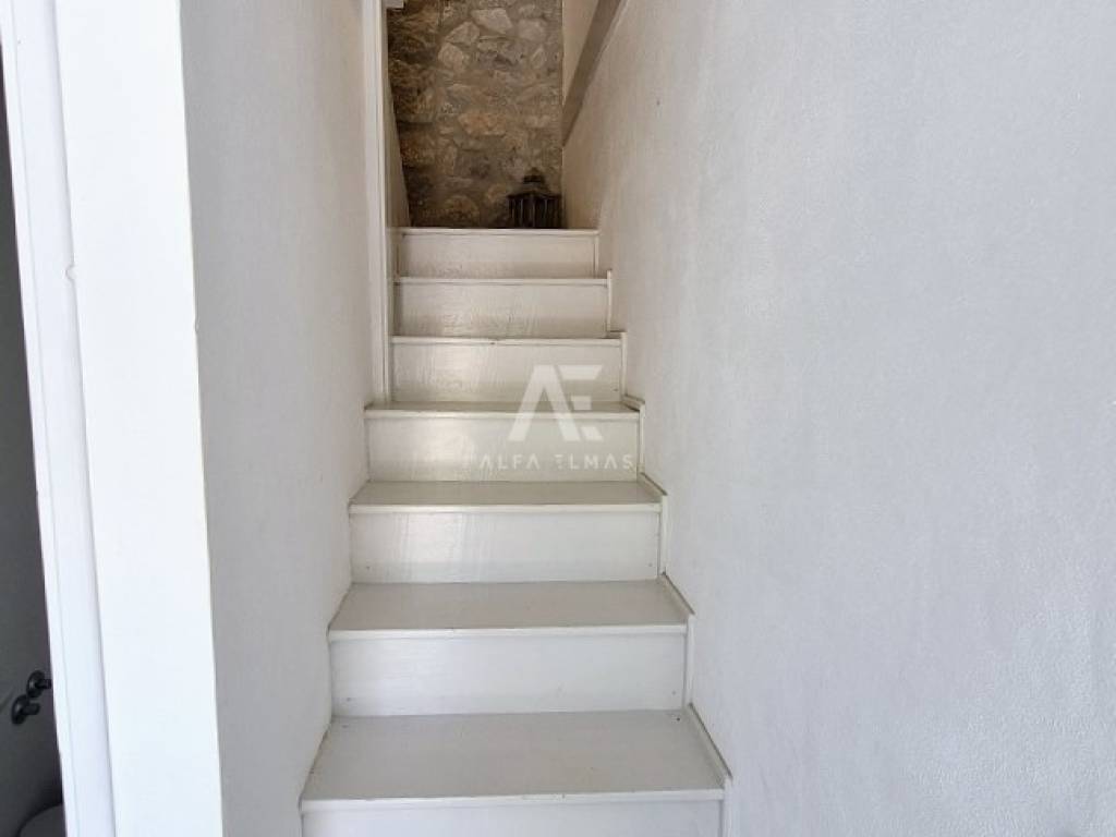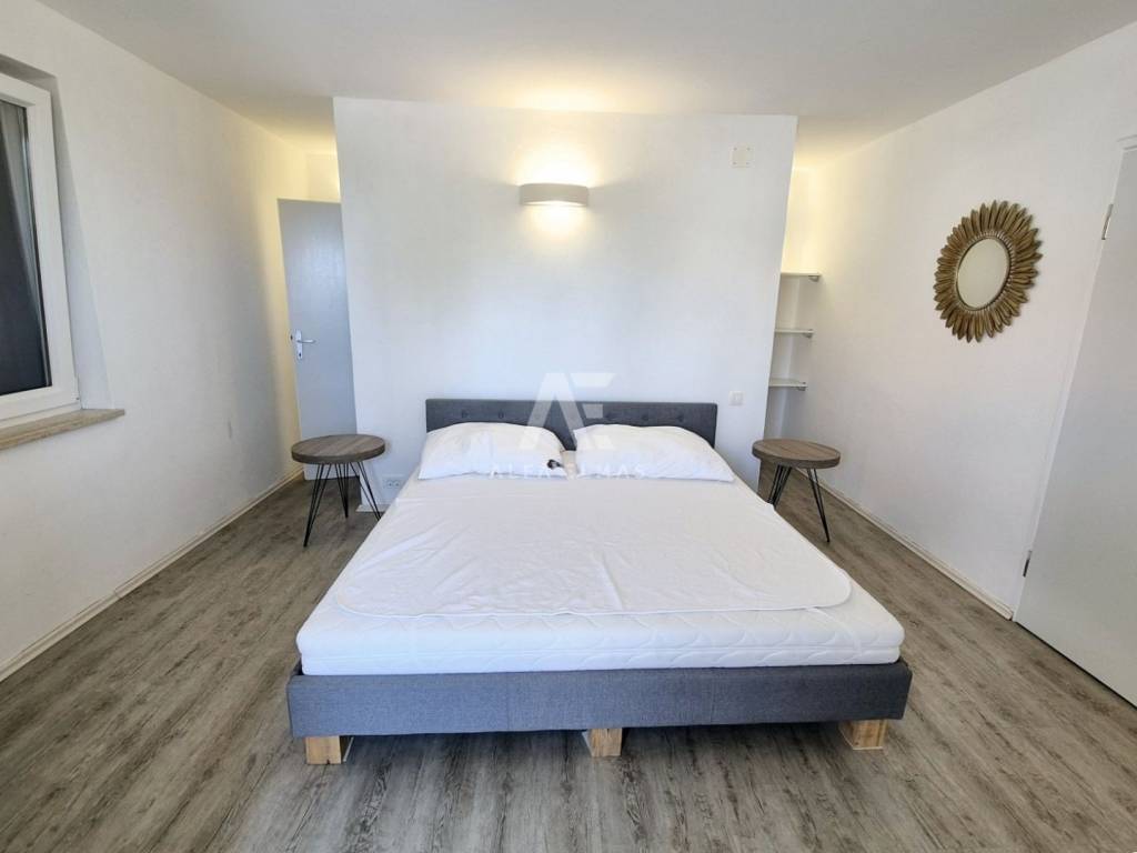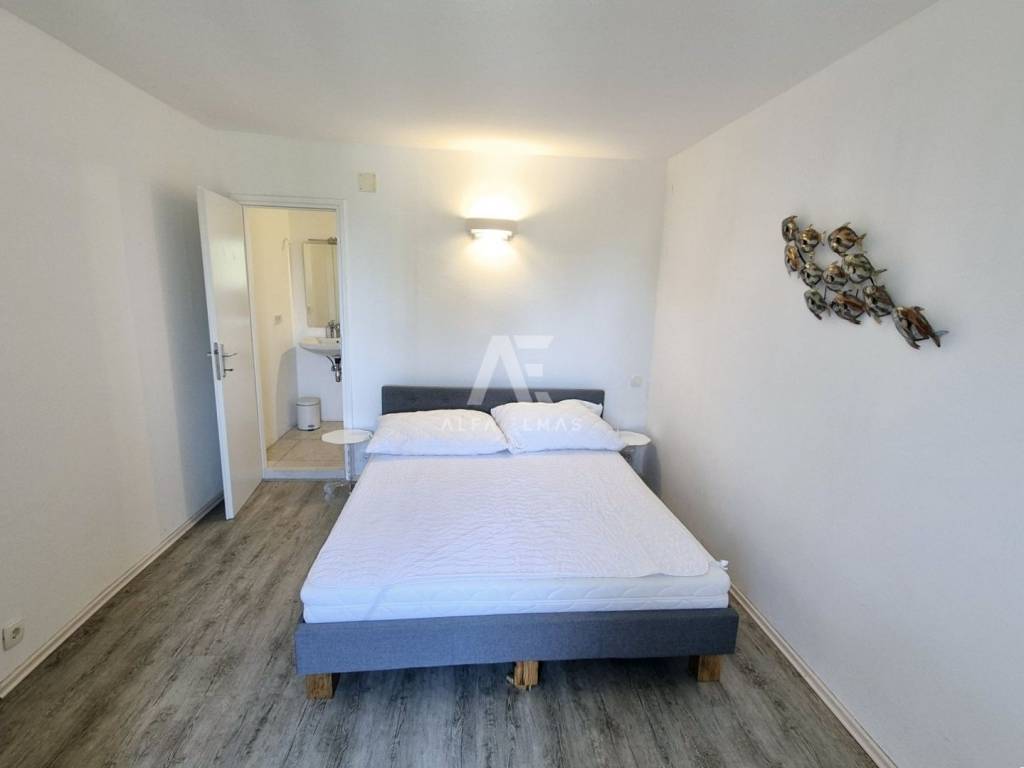 The larger residential unit is spread over two floors. On the ground floor there is a furnished and fully equipped kitchen, while an internal staircase with wooden treads leads to the first floor. There are two spacious bedrooms, each with its own bathroom and wardrobe. One of the rooms has access to a southwest-oriented terrace with a beautiful sea view. This residential unit has a total area of ​​76 m².
