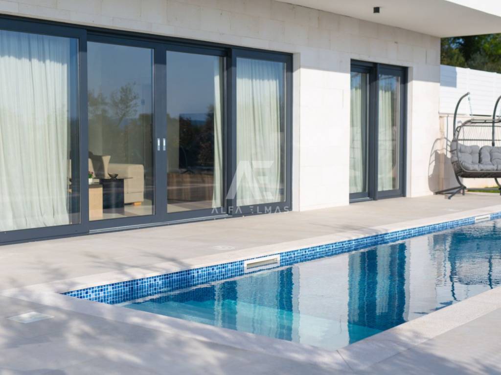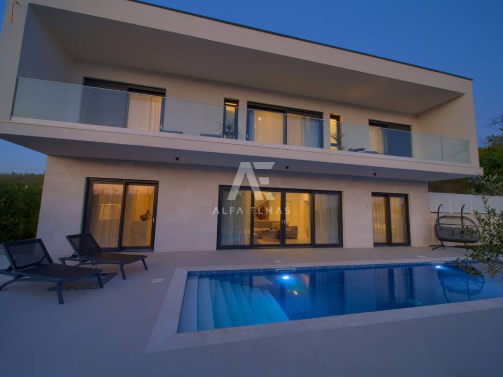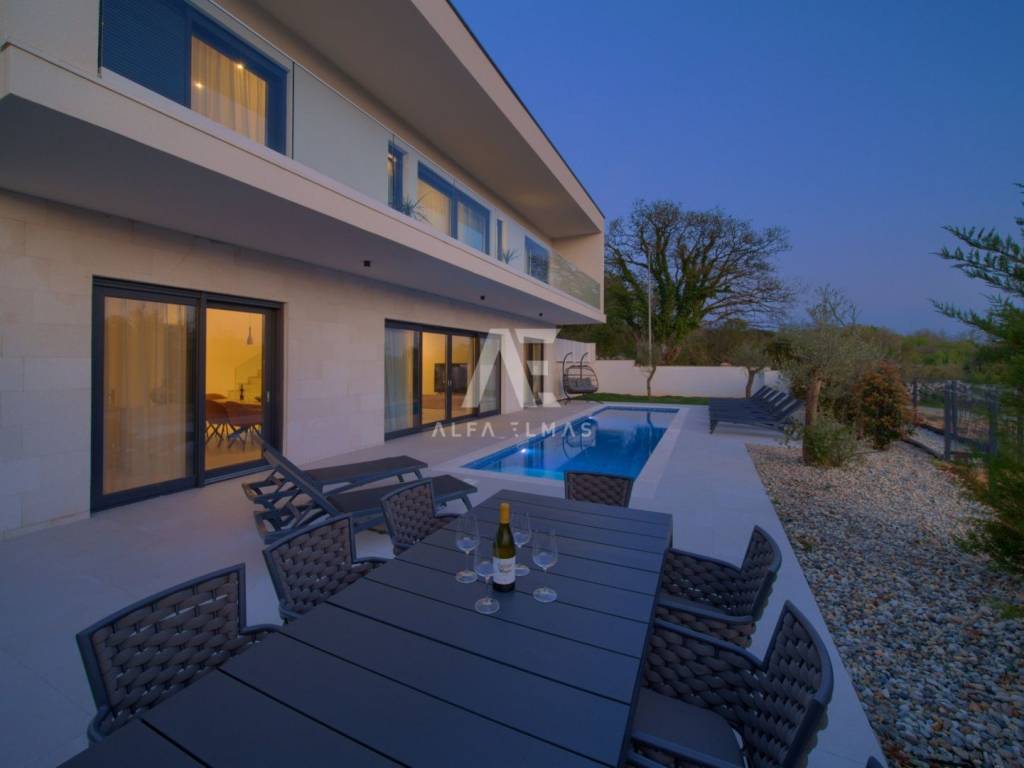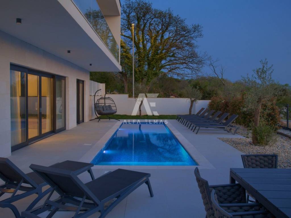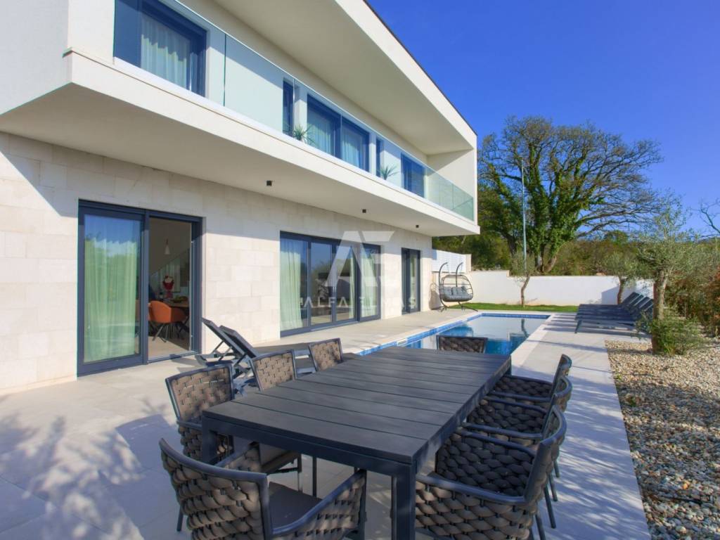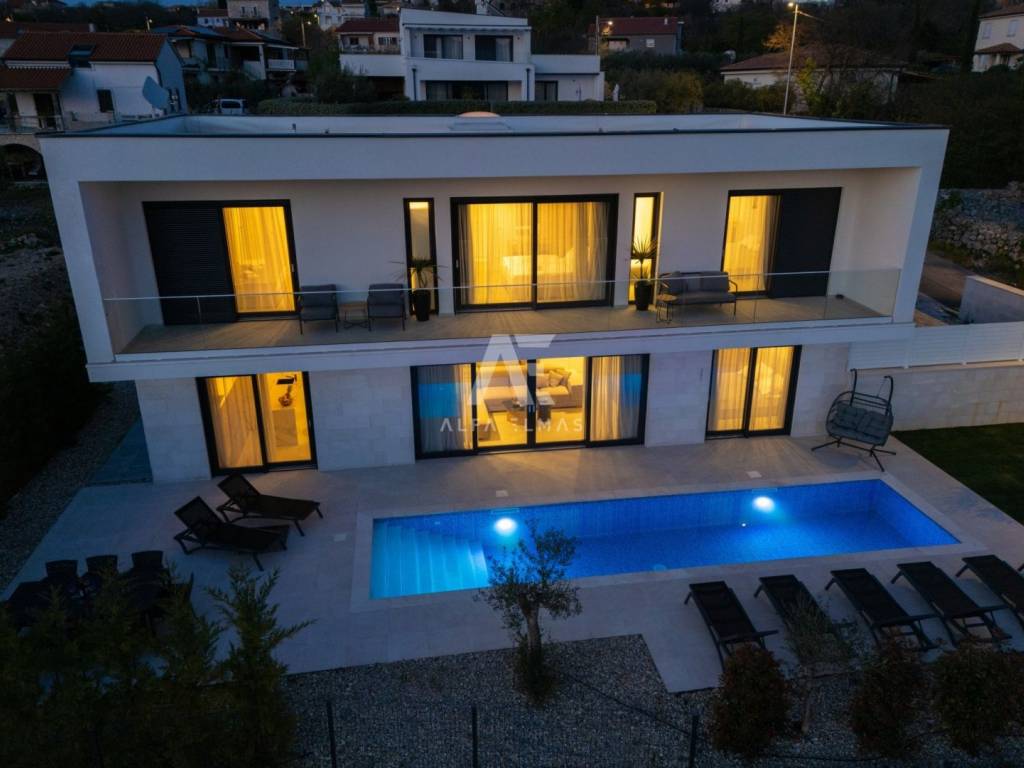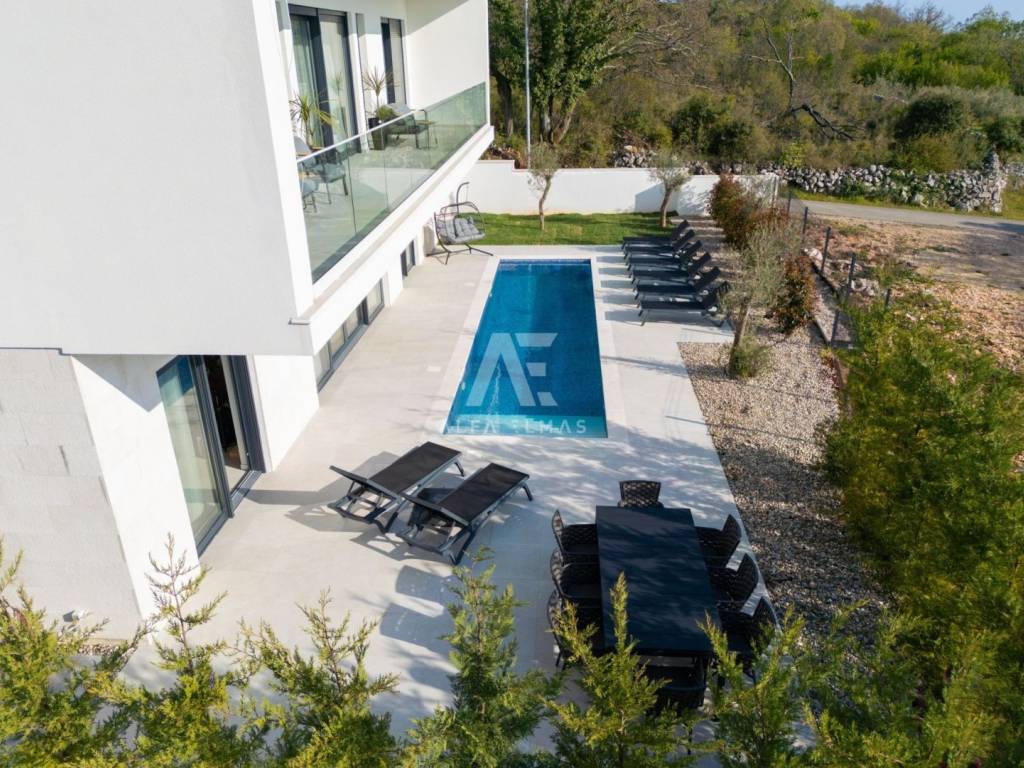 Krk, the surrounding area is located Villa. A spacious and elegant Villa of modern architecture in an enviable location with a panoramic view of the sparkling Adriatic Sea. In its 245 m2 of living space, the fully air-conditioned Villa extends over the basement, ground floor and first floor. At the same time, it has 4 airy bedrooms, each of which has its own bathroom with a walk-in shower. One bedroom located on the ground floor with access to the terrace. The remaining three bedrooms with their own bathrooms are located on the first floor of the villa and have access to the balcony. The spacious ground floor is full of natural light, while it will consist of a kitchen, dining room and living room. A separate toilet is also available on this floor. From the ground floor of the Villa there is an exit to a large terrace with a large pool. The future owners can enjoy the unsurpassed view from the pool or from the comfortable deck chairs that surround it. If you want to stay outdoors, you can prepare meals in the summer kitchen with a grill on the terrace while you can enjoy them in the outdoor dining area. High-quality construction, modern architecture and top-quality equipment. The villa will be equipped with PVC carpentry, blinds, high-quality ceramic floor coverings and sanitary facilities, electric underfloor heating throughout the house. The villa is located on a completely fenced plot of 910 m2. The villa has built-in parking for 2 vehicles and is located 1000m from the sea, landscaped beaches and accompanying facilities. The documentation is in order.