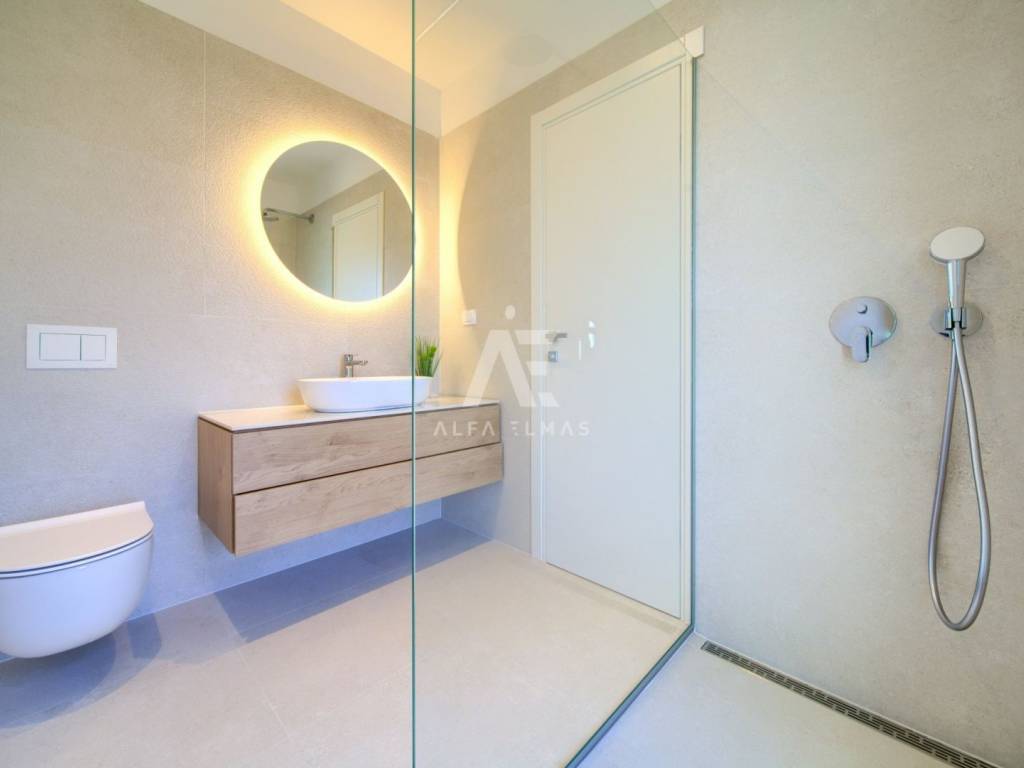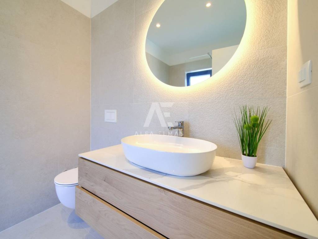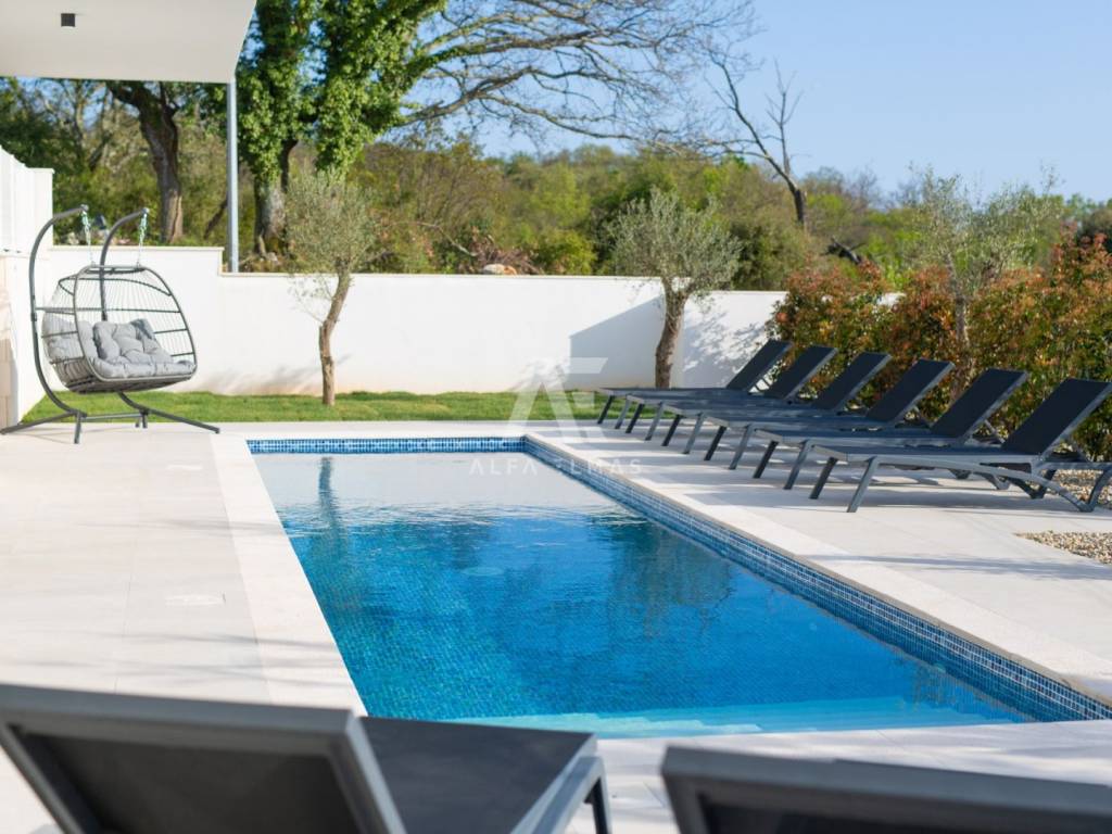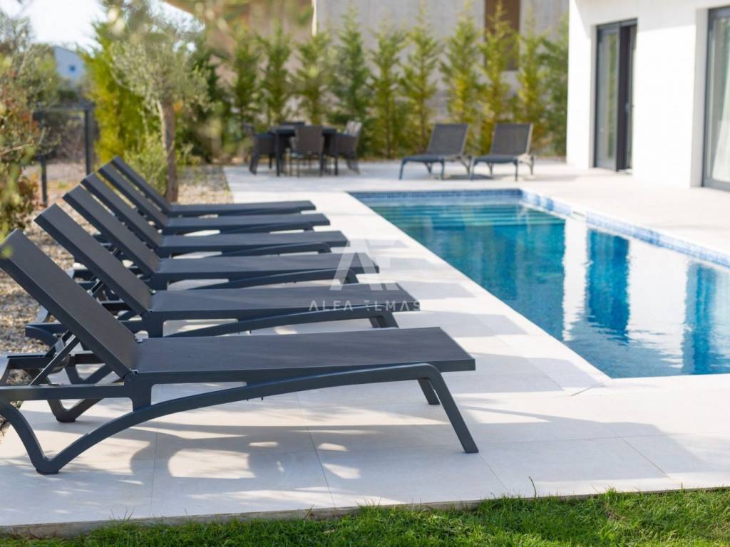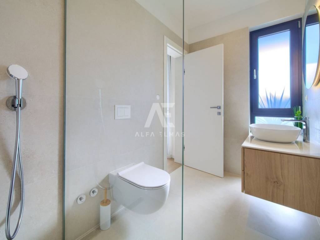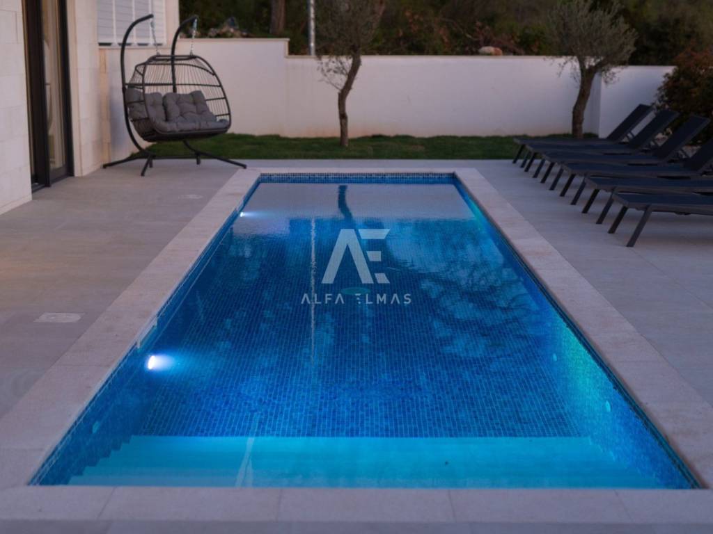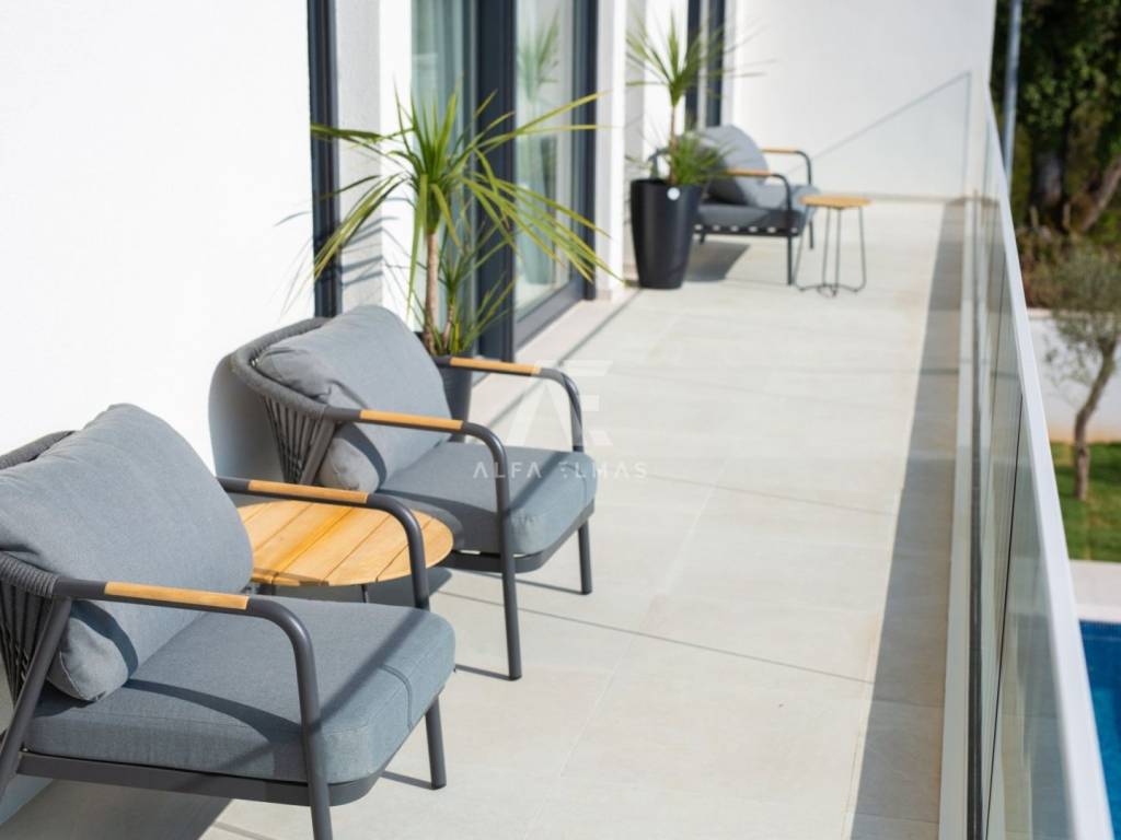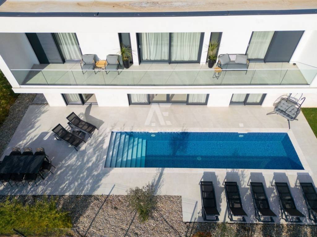Krk, the surrounding area is located Villa. A spacious and elegant Villa of modern architecture in an enviable location with a panoramic view of the sparkling Adriatic Sea. In its 245 m2 of living space, the fully air-conditioned Villa extends over the basement, ground floor and first floor. At the same time, it has 4 airy bedrooms, each of which has its own bathroom with a walk-in shower. One bedroom located on the ground floor with access to the terrace. The remaining three bedrooms with their own bathrooms are located on the first floor of the villa and have access to the balcony. The spacious ground floor is full of natural light, while it will consist of a kitchen, dining room and living room. A separate toilet is also available on this floor. From the ground floor of the Villa there is an exit to a large terrace with a large pool. The future owners can enjoy the unsurpassed view from the pool or from the comfortable deck chairs that surround it. If you want to stay outdoors, you can prepare meals in the summer kitchen with a grill on the terrace while you can enjoy them in the outdoor dining area. High-quality construction, modern architecture and top-quality equipment. The villa will be equipped with PVC carpentry, blinds, high-quality ceramic floor coverings and sanitary facilities, electric underfloor heating throughout the house. The villa is located on a completely fenced plot of 910 m2. The villa has built-in parking for 2 vehicles and is located 1000m from the sea, landscaped beaches and accompanying facilities. The documentation is in order.