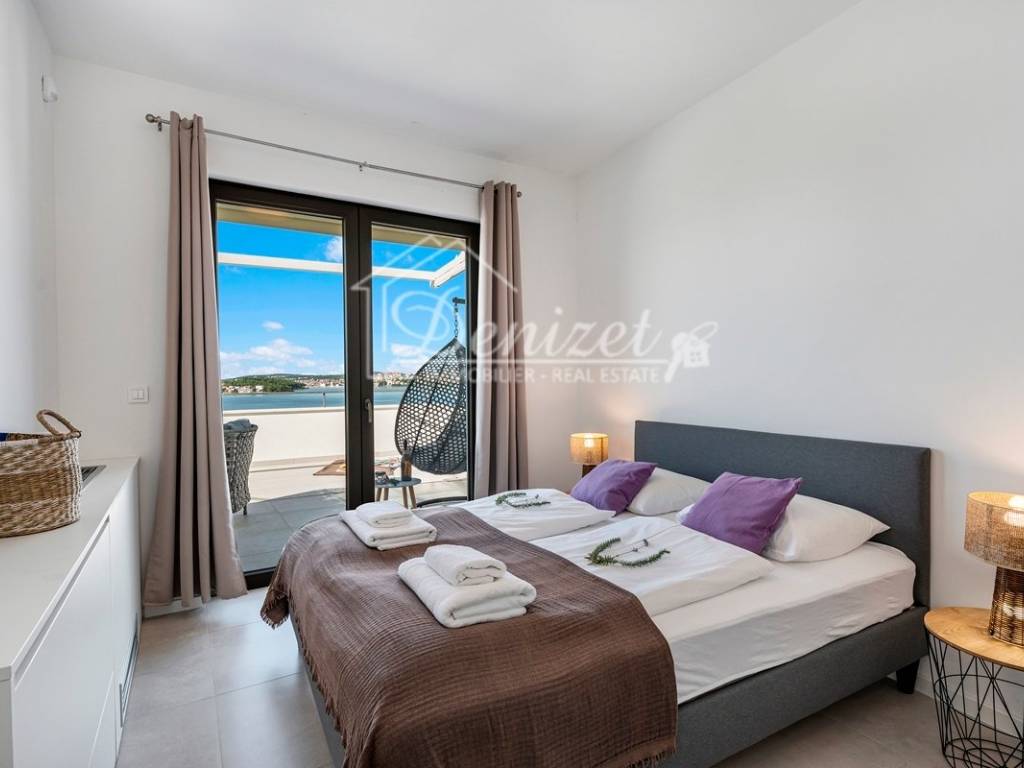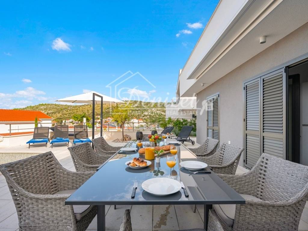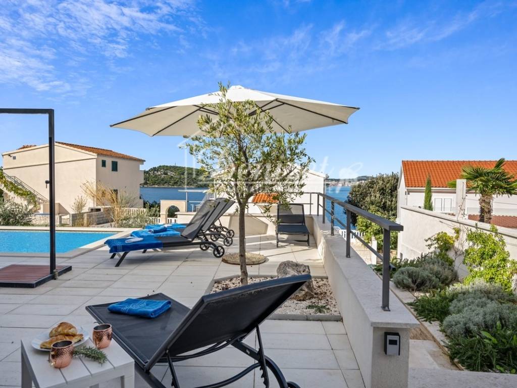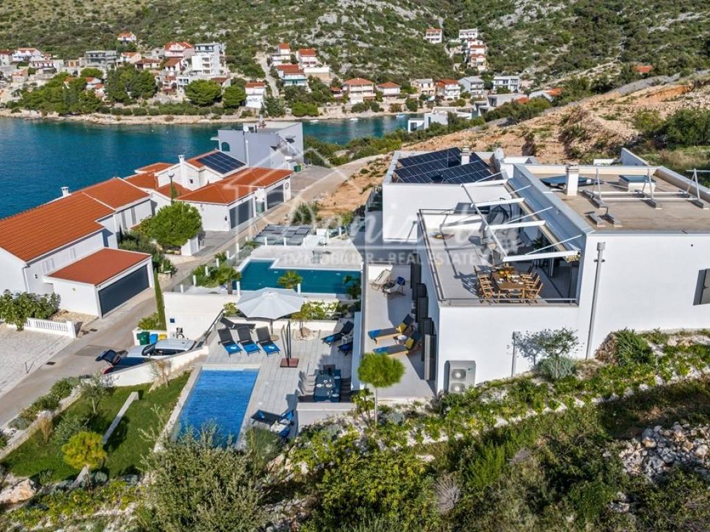 An exclusive villa is for sale, located just 100 meters from the sea in a peaceful area near Rogoznica. The villa is situated on a plot of 626 m² with net living space of 164 m², along with an additional 100 m² of spacious terraces.
