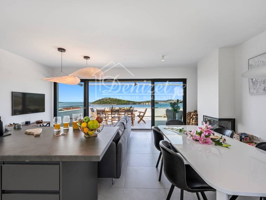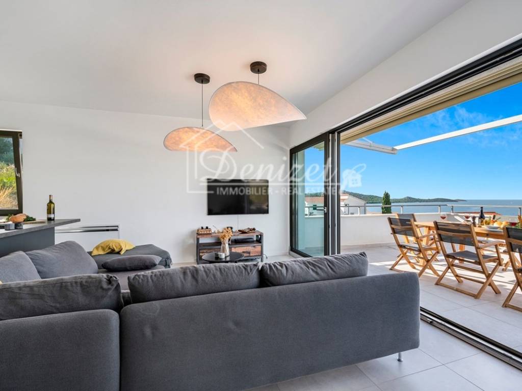 On the first floor, there is a large living room with a kitchen and dining area, a bathroom, and an additional bedroom. Both the living area and the bedroom open onto a large terrace offering an impressive panoramic view of the sea and nearby islands.
