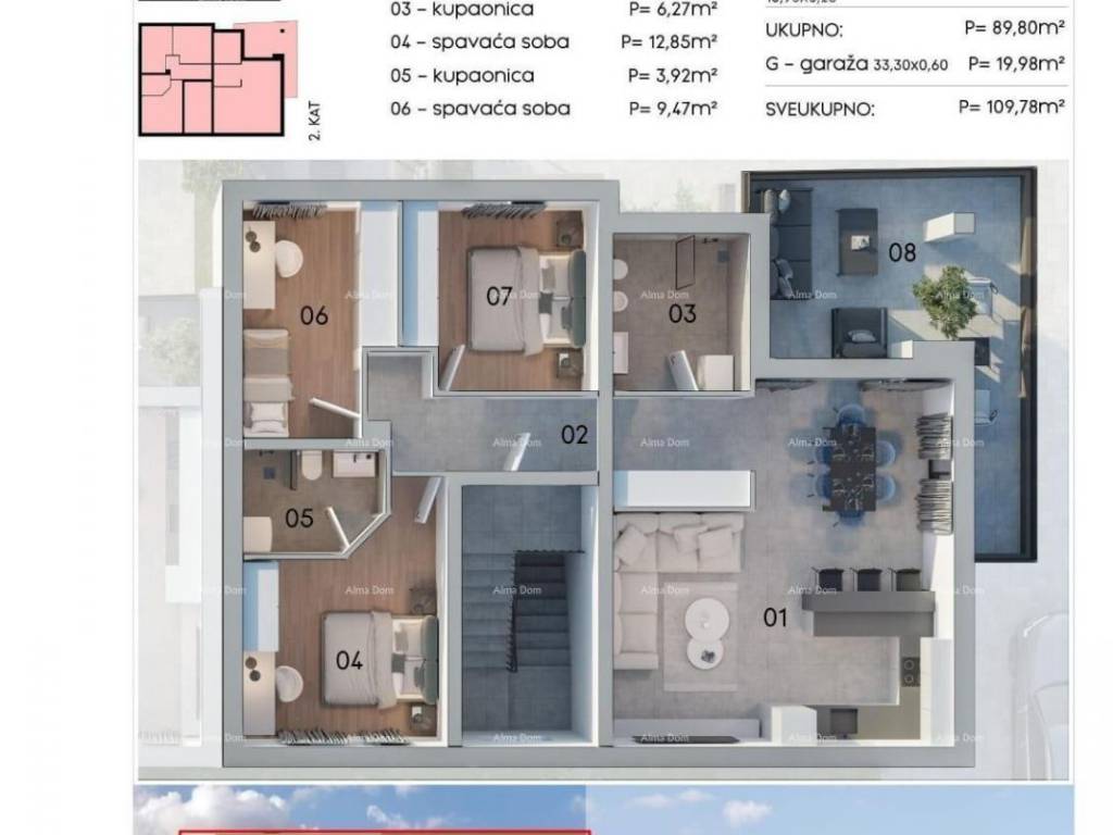 In the heart of Pula, just 600 meters from the center and 1000 meters from the sea, a spacious 110 m² apartment is available. Located on the second floor of a three-story building, this modern apartment features three comfortable bedrooms, two living rooms, and a kitchen, making it ideal for family living. Built in 2026, it guarantees a contemporary approach to construction standards, while the air conditioning ensures a pleasant atmosphere throughout the year. With a parking space, this apartment represents the perfect combination of comfort and practicality, ideal for living in the beautiful city of Pula. Excellent location, close to Pula City Mall. Reservations are being accepted. The company is VAT registered, and the buyer is exempt from paying property transfer tax.INFO: azra@almadominvest.com+385 91 6115706jelena@alma-nekretnine.com+385 98 32 32 64