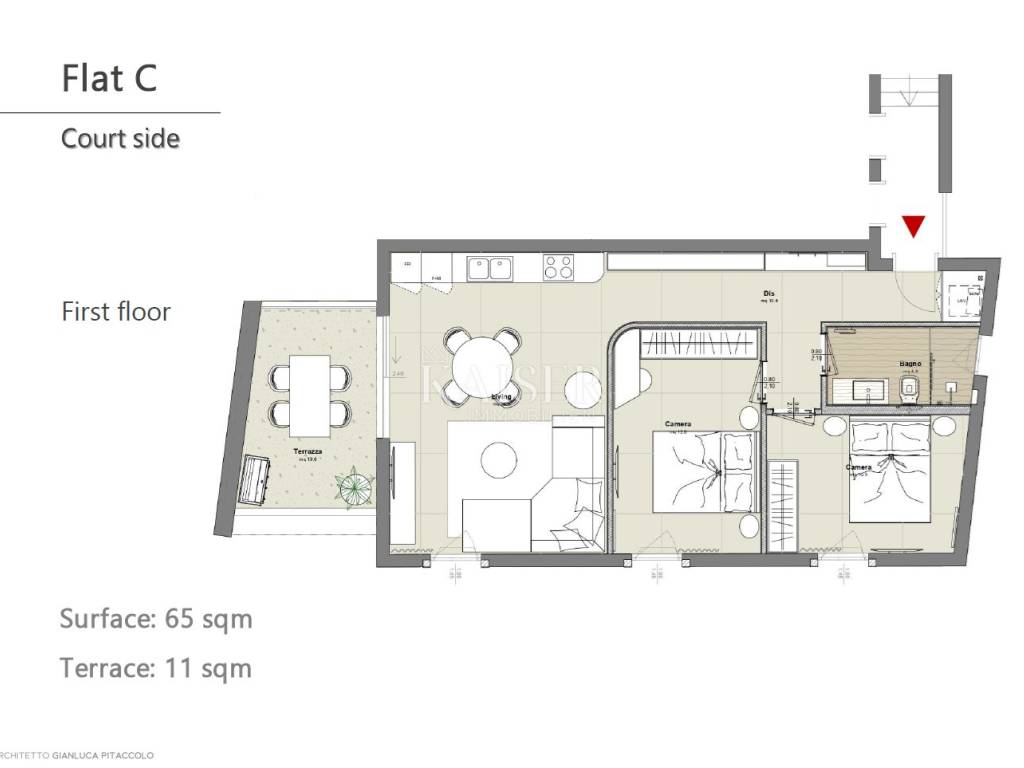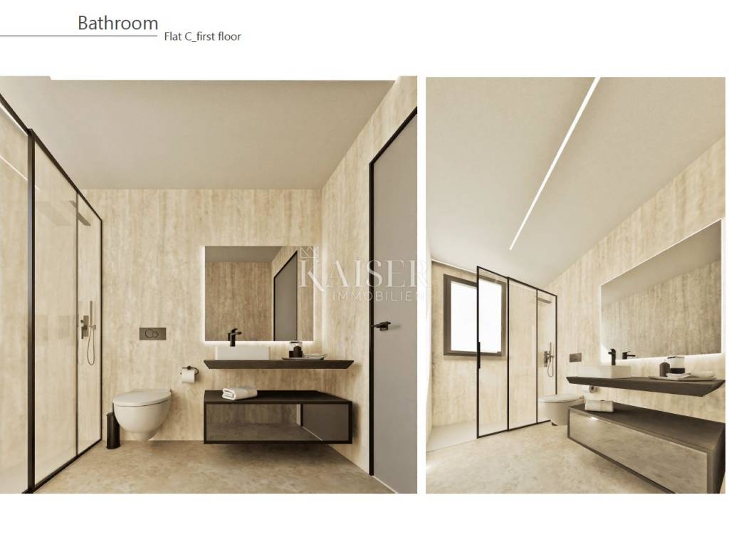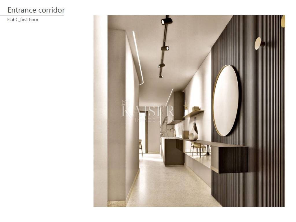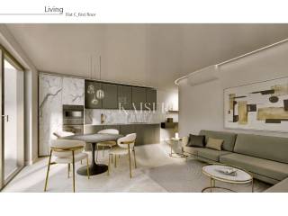 Apartment C on the first floor of a building with a total of 3 apartments offers an apartment with a net area of 74m2, consisting of a living area of 65m2 and a beautiful terrace of 11m2. The apartment has a spacious living room with a dining room and kitchen, two bedrooms and a luxuriously decorated bathroom. The apartment is decorated using the highest quality Italian flooring, coverings and materials selected by top Italian architects and designers.