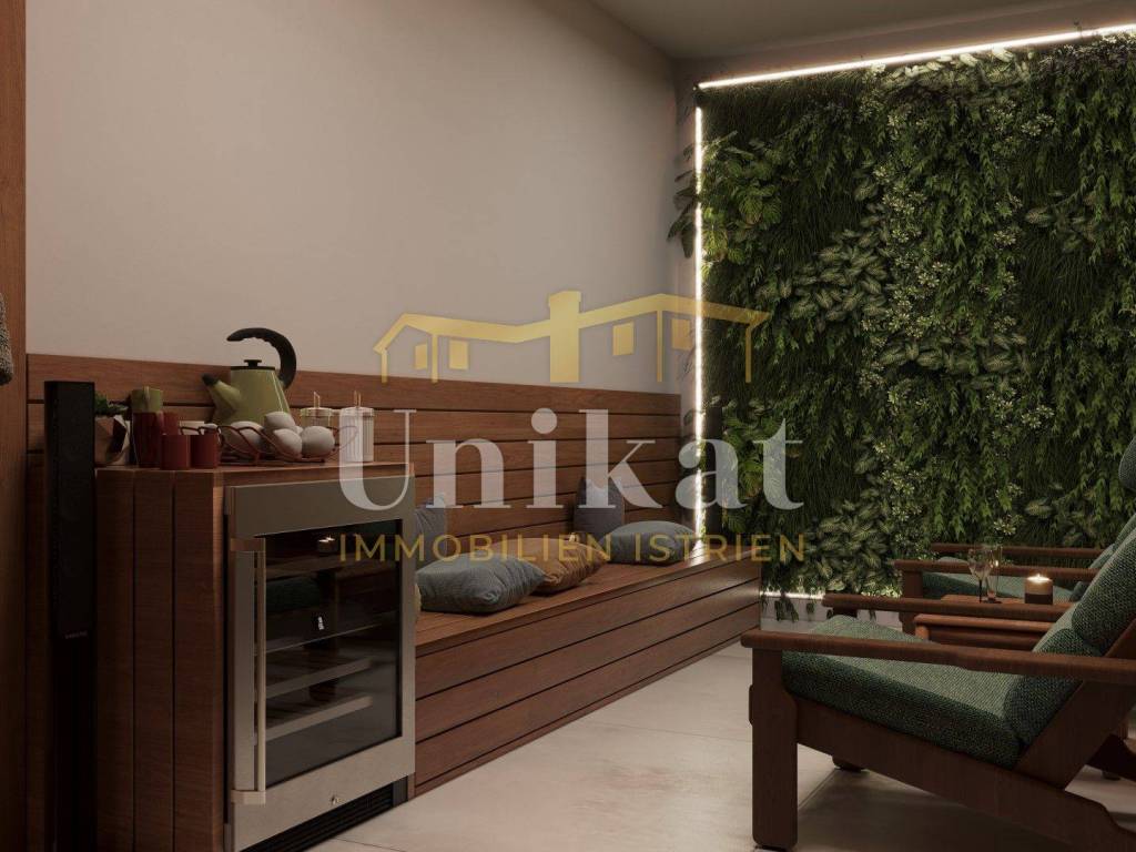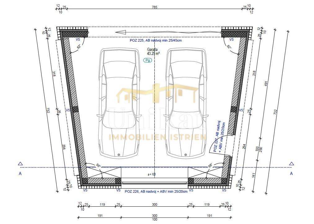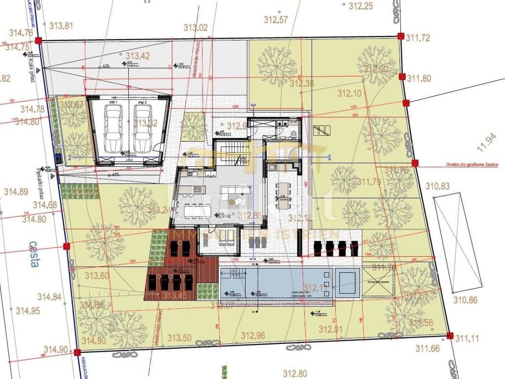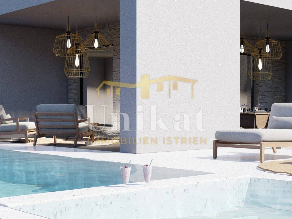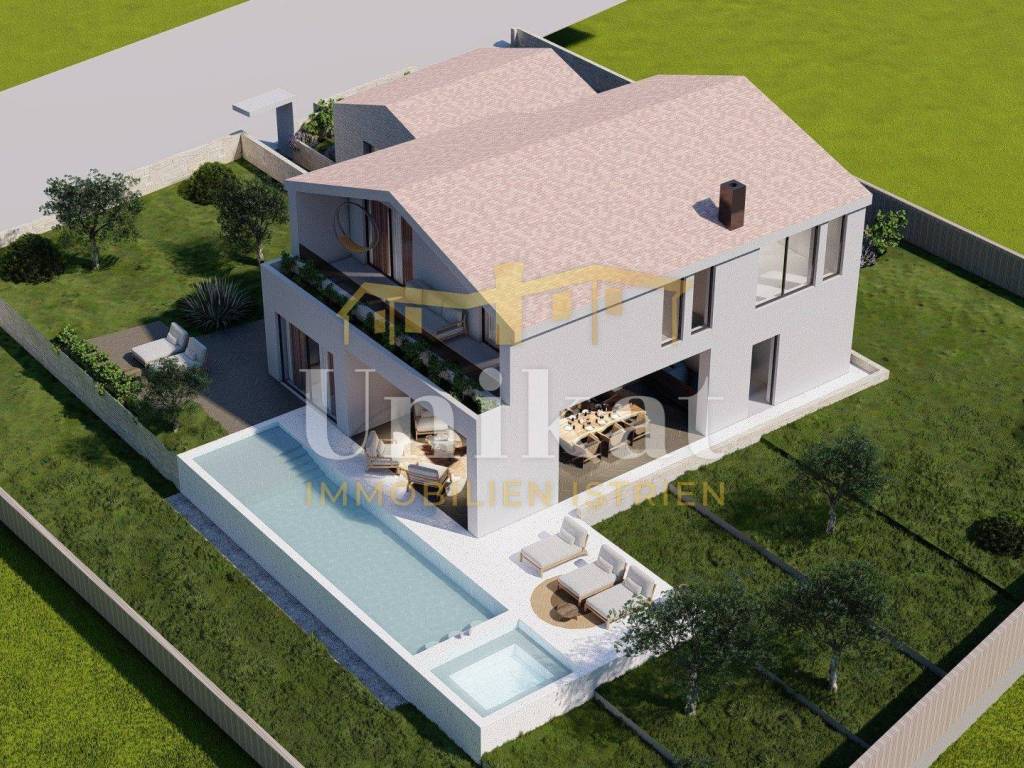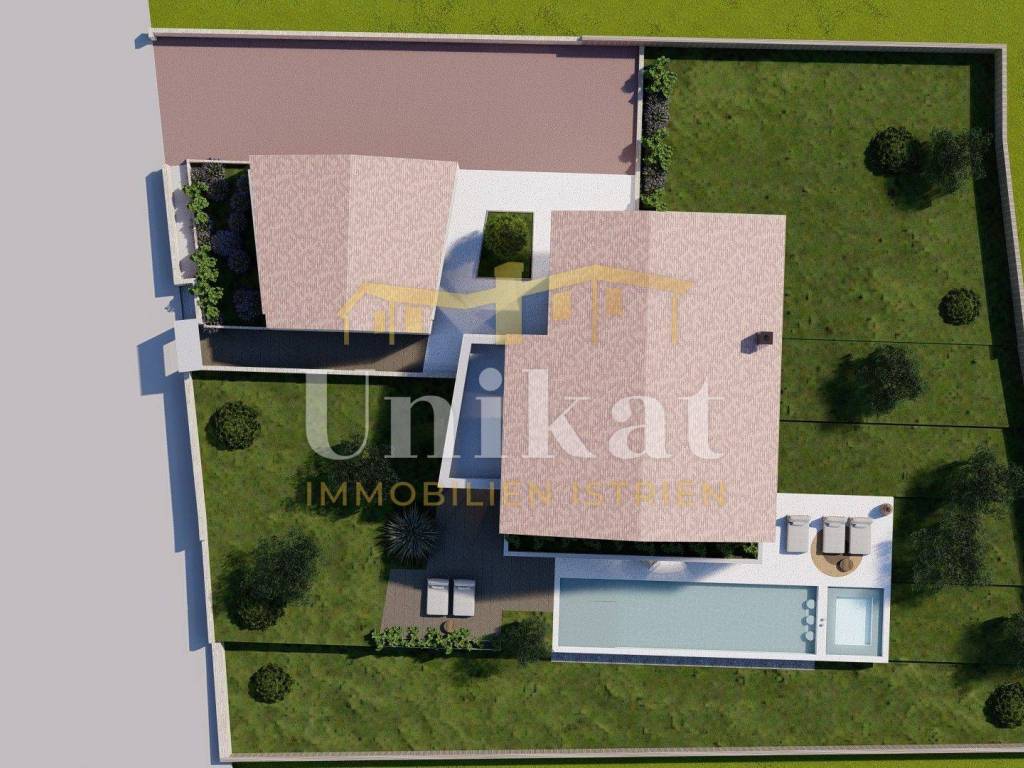 Jardín y parcela: Delante de la casa está planificado un garaje para dos vehículos, y en el otro lado de la casa habría una piscina con solárium. El resto del terreno estará ajardinado.