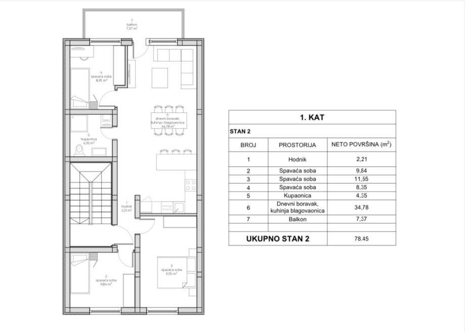 Stan je u na 1.katu i sastoji se od hodnika, dnevnog boravka s kuhinjom i blagovaonicom,