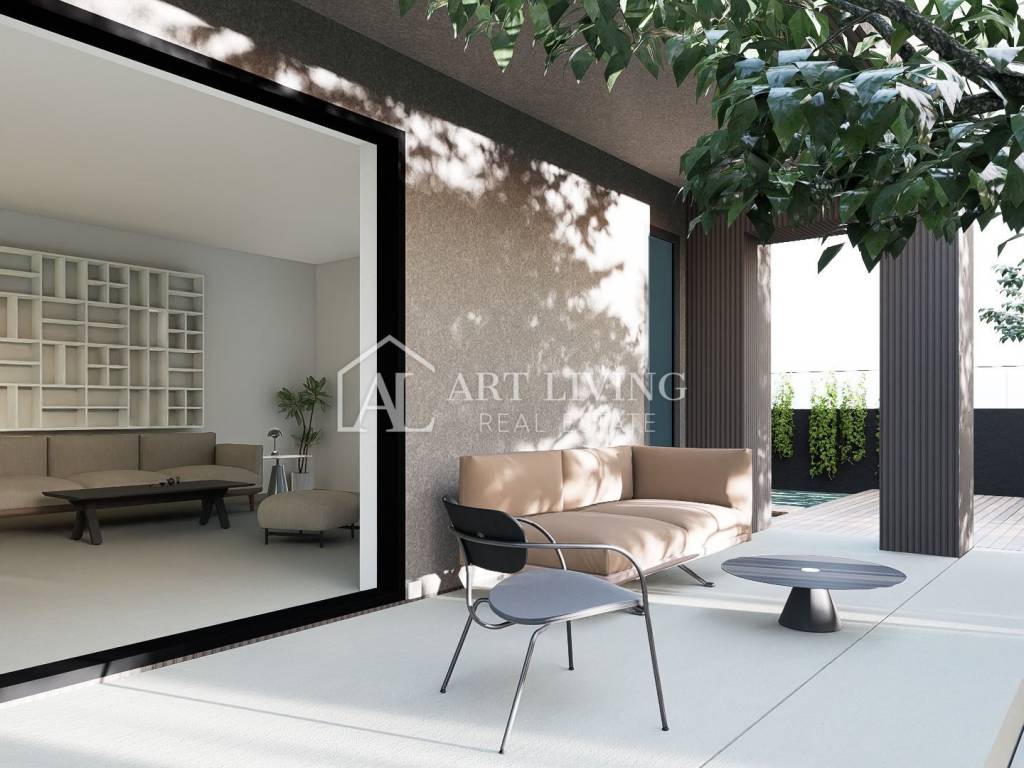 In a small village just a few minutes’ drive from Poreč, this modern and thoughtfully designed house with a swimming pool is situated, surrounded by nature.