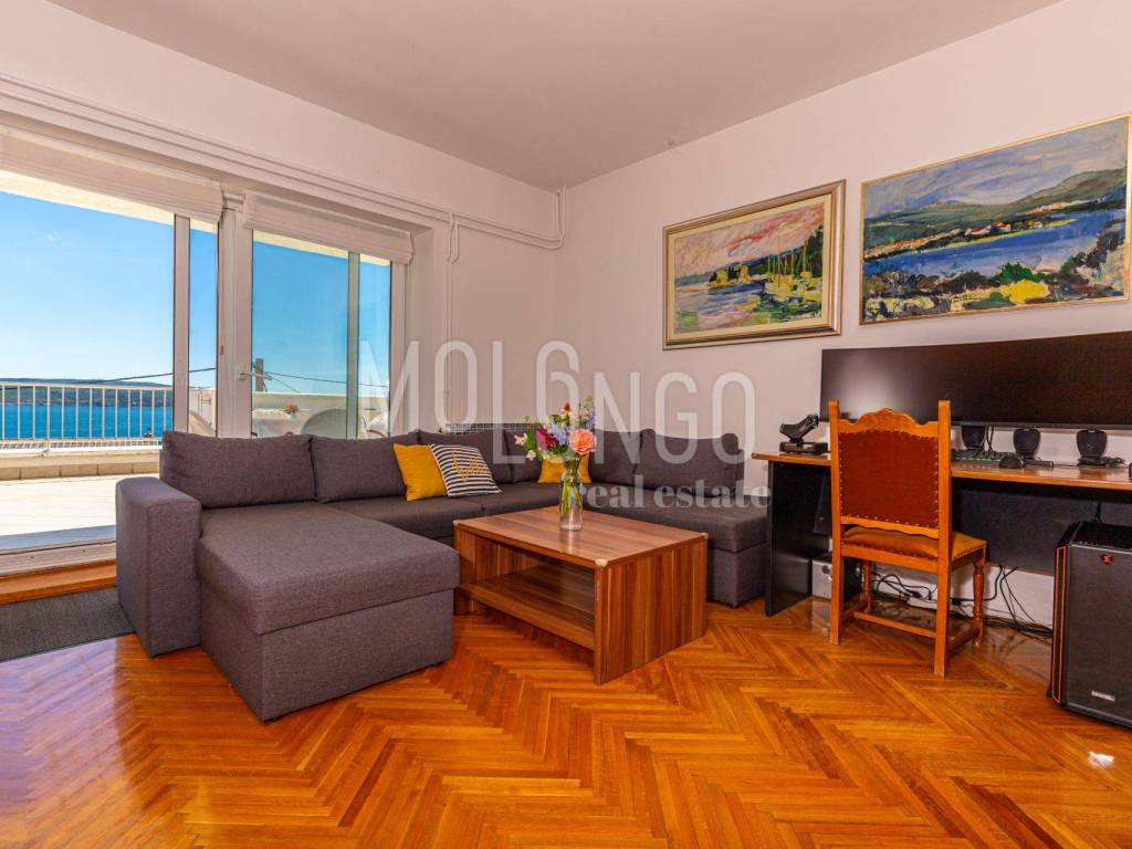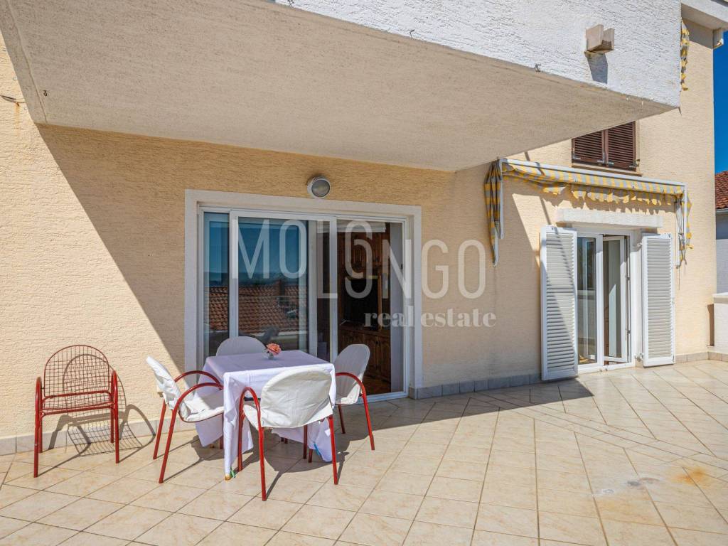 On the first floor there is a spacious apartment with a living room, 2 bedrooms, kitchen and dining room, 2 bathrooms with toilets and a huge terrace with a panoramic view of the sea.