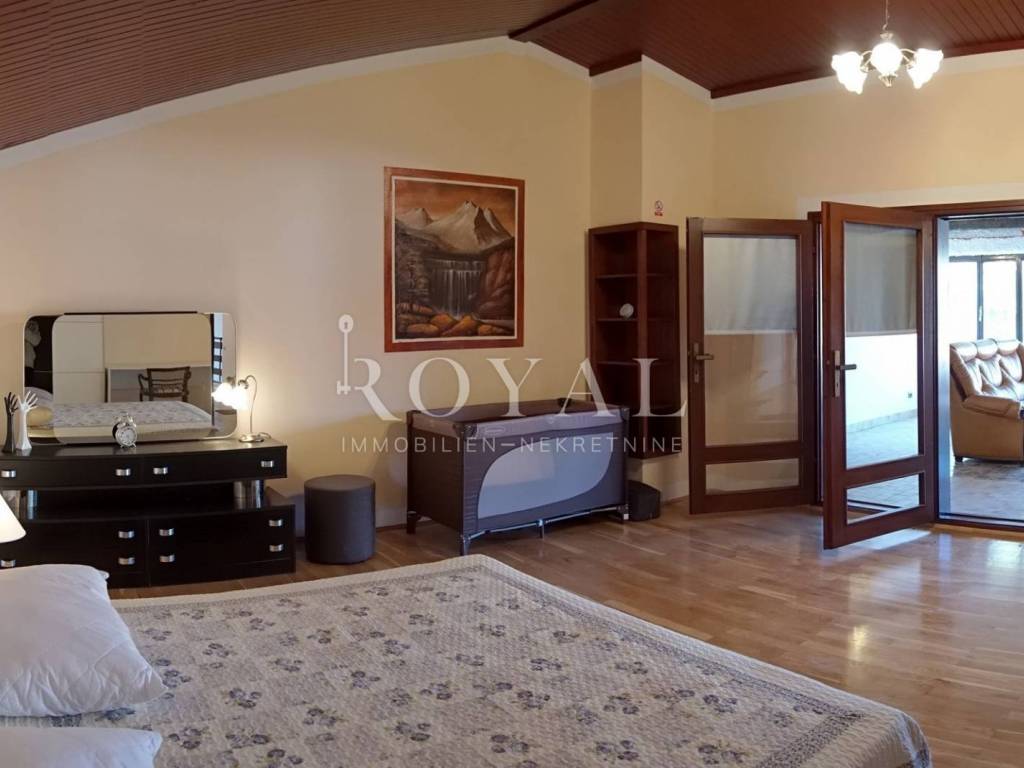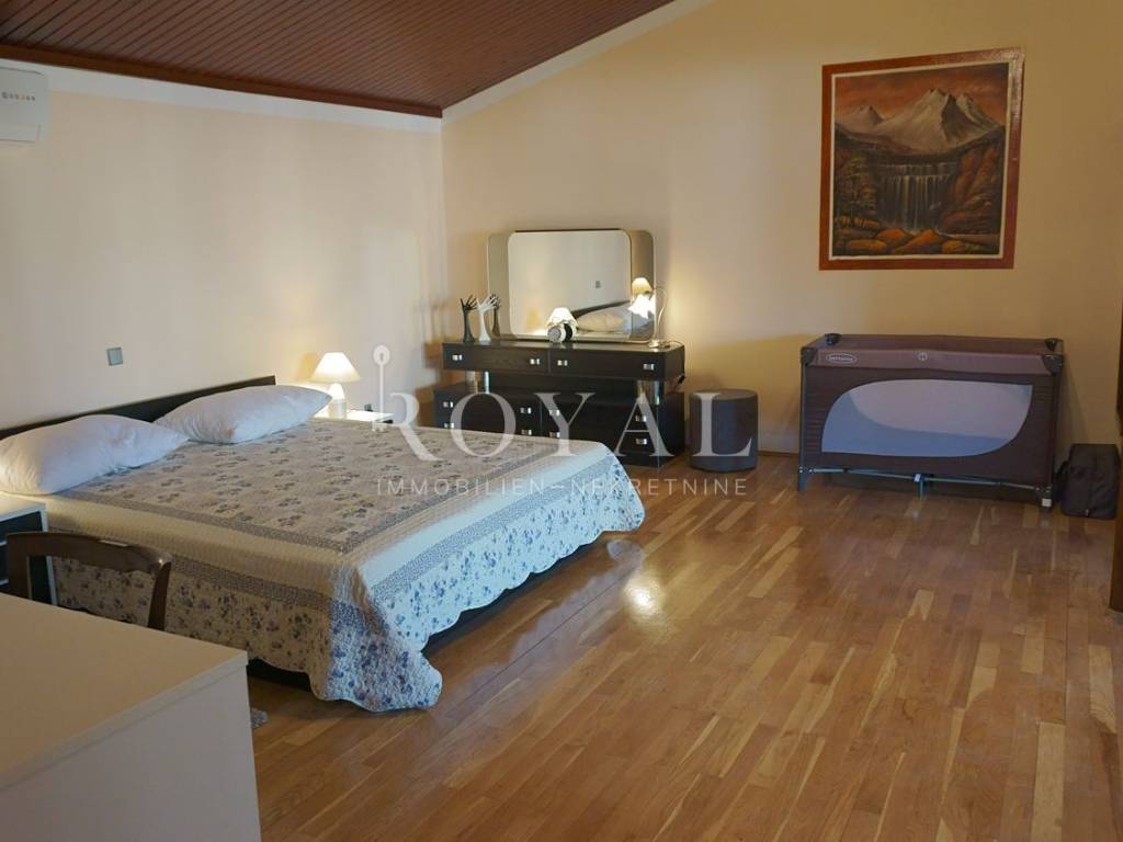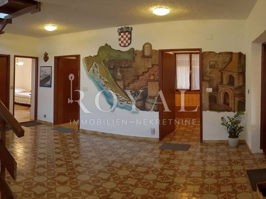 • Glavna zgrada s dvije etaže (6 spavaćih soba, 4 kupaonice, 2 dnevna boravka, kuhinja, aula, trijem, pomoćne prostorije), svaka etaža površine 149,02 m2