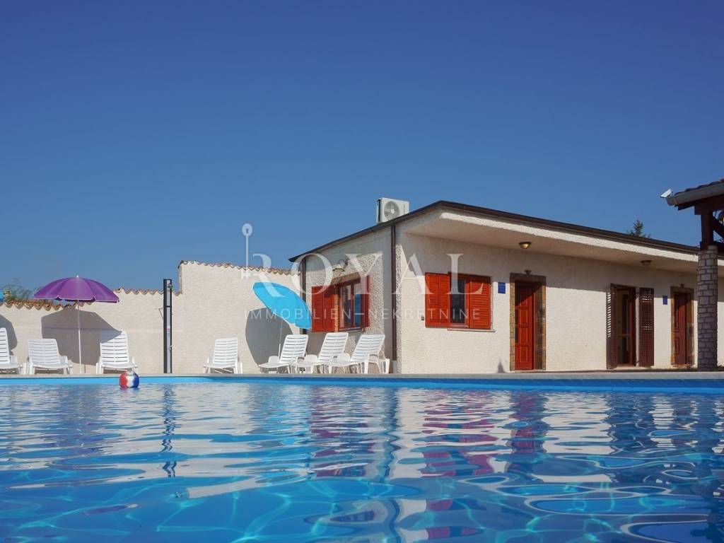 • Vanjski bazen (60 m2 x 1.5 m) sa platoom za malu djecu, osvijetljen iznutra i izvana, strojarnica, šetnica (široka 2 m) popločana kamenim pločicama sa suncobranima, stolovima, stolicama i solarnim tušem