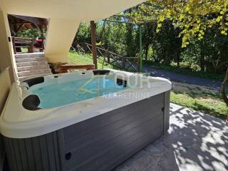 The lower ground floor features a smaller apartment with a living room, kitchen, and bathroom, and access to a covered terrace with a jacuzzi and views of unspoiled nature. On the first floor, there is a second apartment with a spacious living area and an open terrace. The attic holds two rooms with a balcony – one with a double bed, the other with two single beds – perfect for relaxing after a day spent outdoors.
