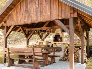 The landscaped yard includes a wooden gazebo with a barbecue, an outdoor storage space, a maintained lawn, and a forest backdrop. Just 400 meters from the Kupa River, the location offers peace, fresh air, and pristine nature throughout the year.