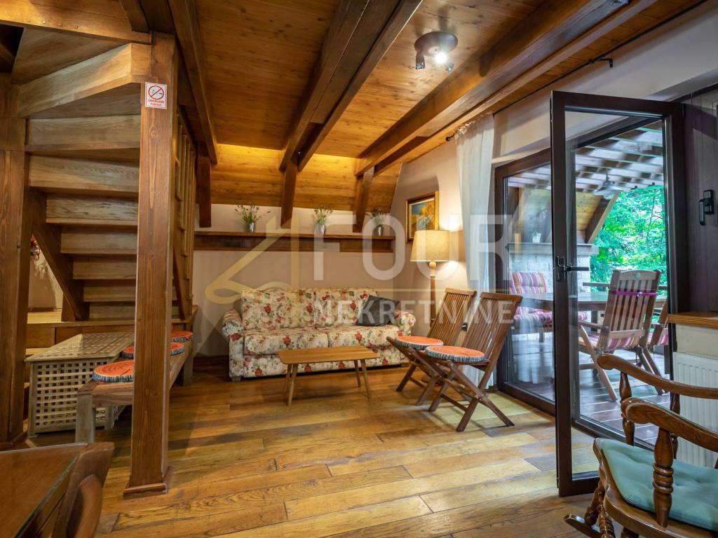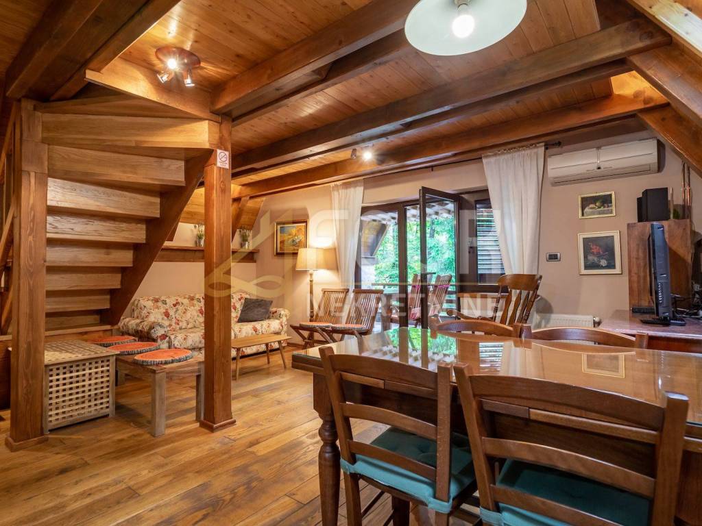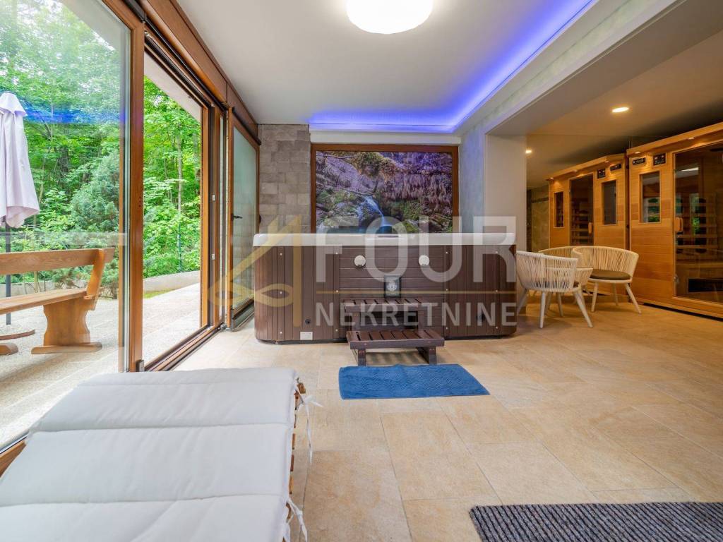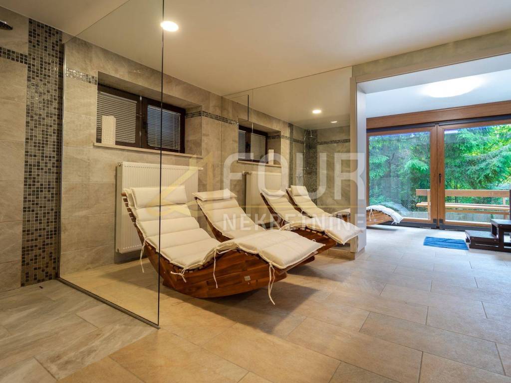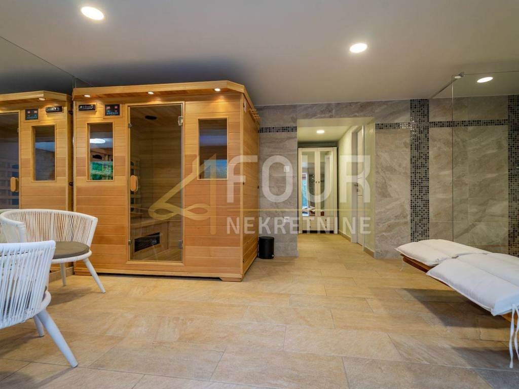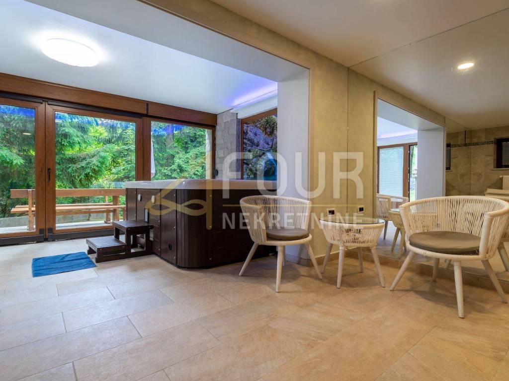 The wellness area on the ground floor, with an infrared sauna, a hydromassage pool and sun loungers, provides the perfect space for relaxation and enjoyment. The ground floor also contains a bathroom with a shower, bidet and toilet, and the wellness area leads to a spacious terrace ideal for relaxing in the fresh air. The garden with a barbecue provides additional space for socializing and spending pleasant moments with family and friends.