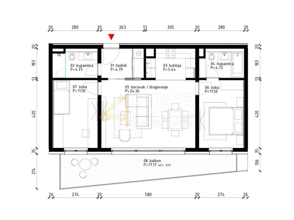 It is equipped with the latest technology and high-quality materials. The building is built with reinforced concrete construction with partition walls made of calcium-silicate boards, while some parts are made of double Knauf. The facade is insulated with 15 cm of rock wool, ensuring excellent thermal insulation. Three-layer Weizer oak parquet is installed throughout the apartment, except in the bathroom, kitchen and entrance hall, where there is porcelain ceramics. Daikin air/air heat pumps with a parapet system are used for heating and cooling.
