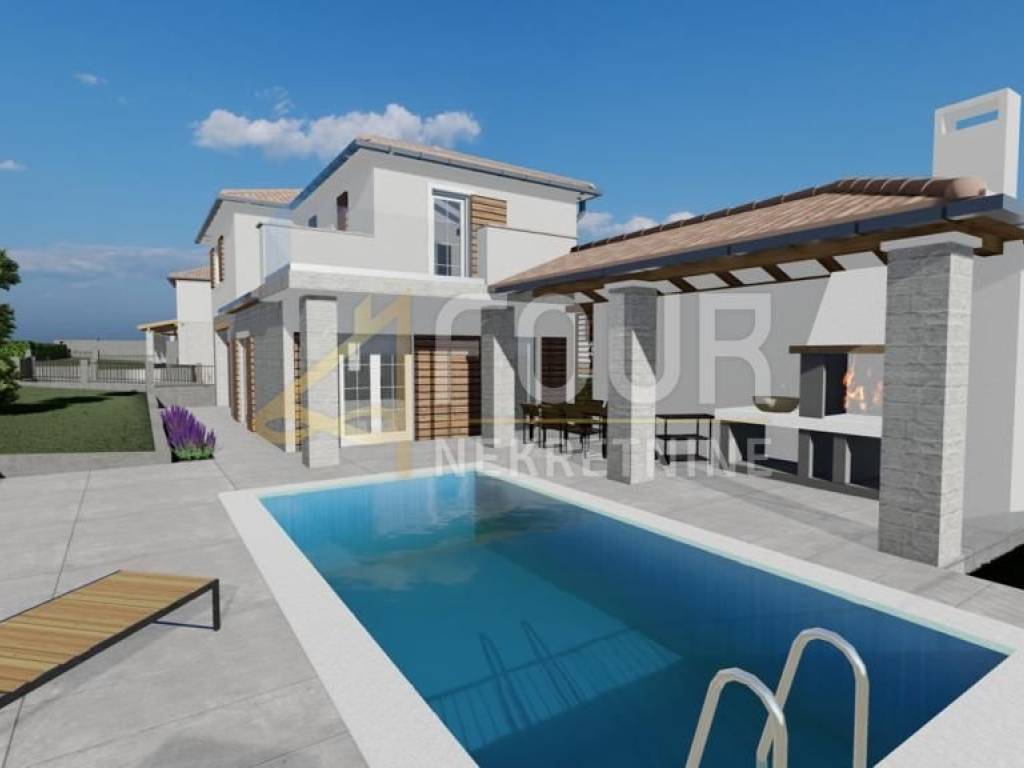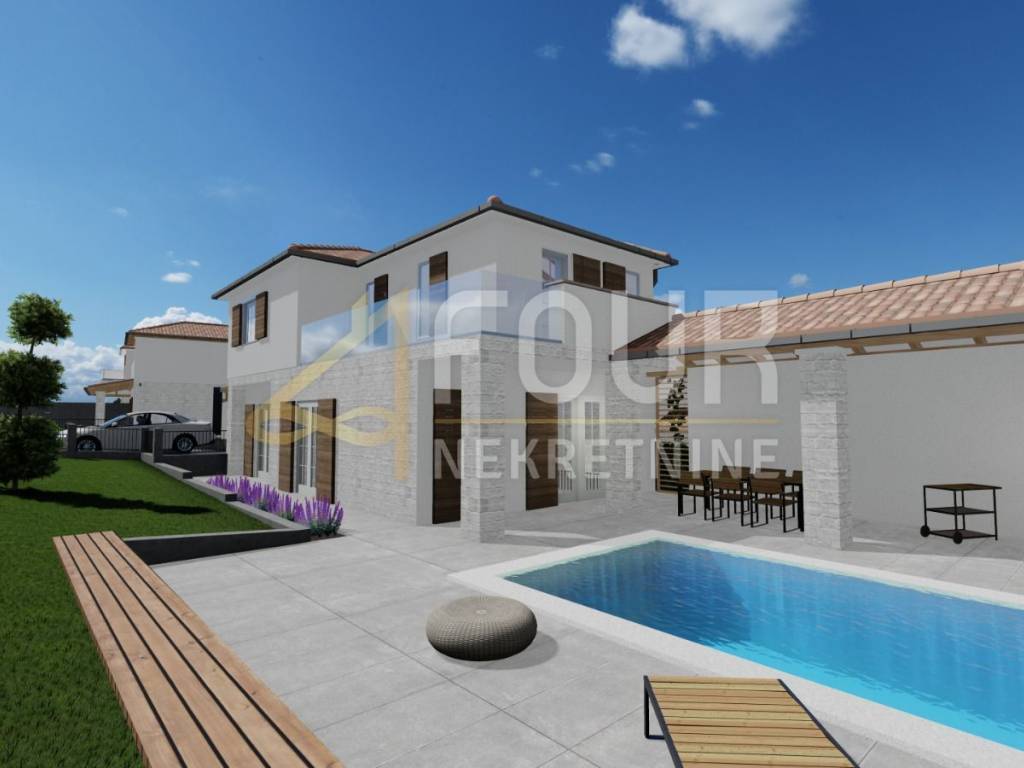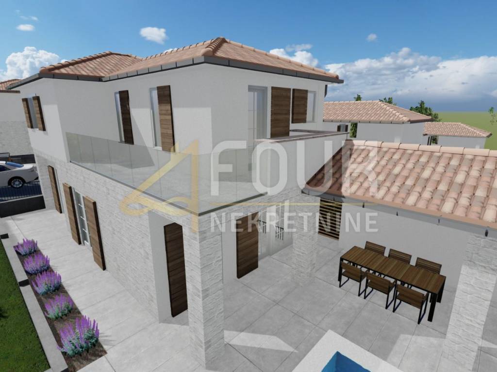 We offer a villa of 125 m2 in a quiet location in the heart of Istria. On the ground floor of the house there is a bedroom with its own bathroom, toilet, kitchen and living room with access to a large covered terrace with summer kitchen and swimming pool. On the first floor there is a bedroom with its own bathroom and a covered terrace that can be converted into a bedroom. The villa has a fenced yard and 2 parking spaces.