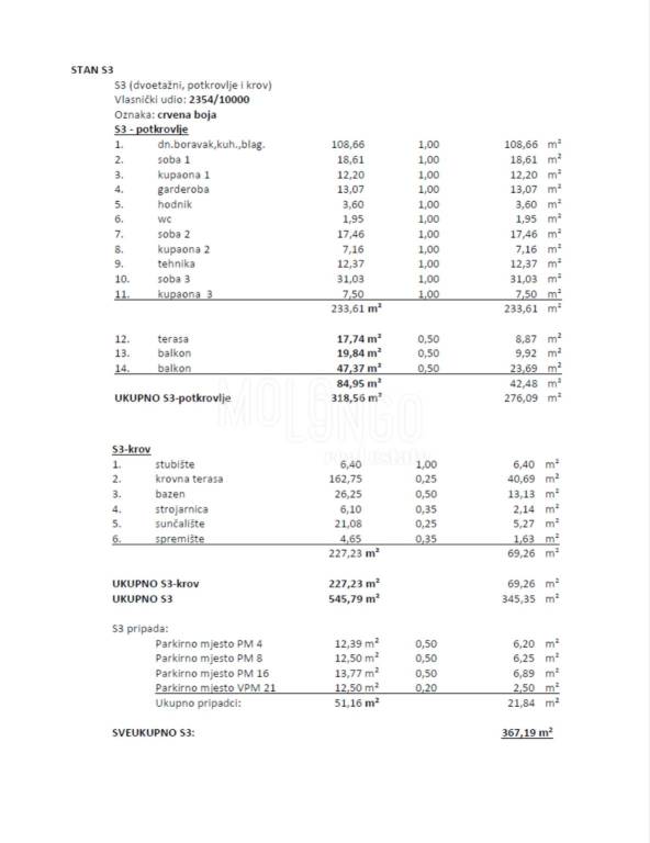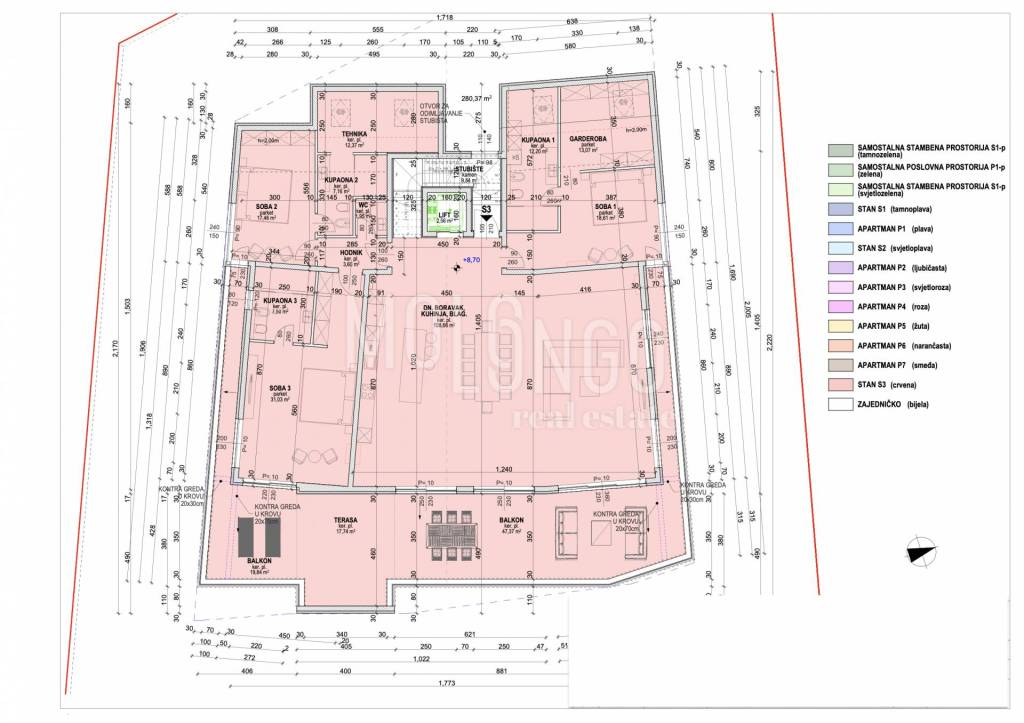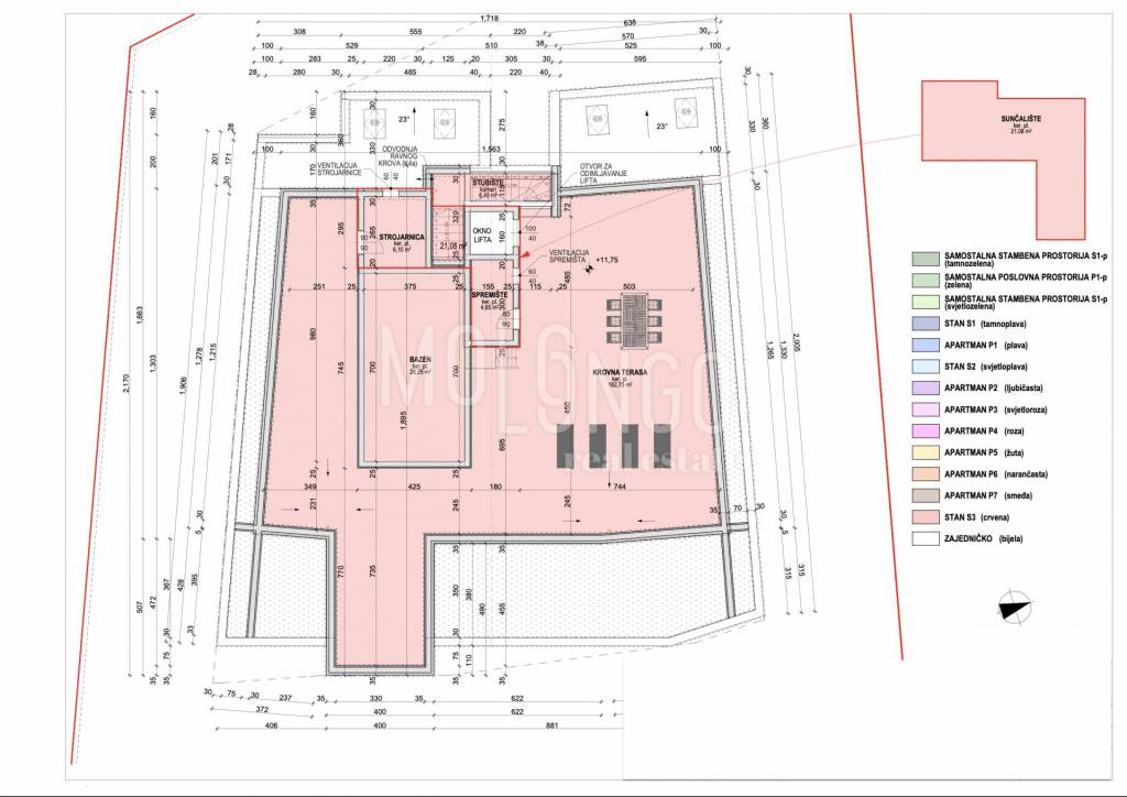 The apartment consists of a comfortable living room with a kitchen and dining room, three bedrooms with large bathrooms, a corridor, a toilet, a terrace and two balconies. The apartment also has a roof terrace where there is a 26.25 m2 swimming pool, an engine room, a sun deck and a storage room on the roof.