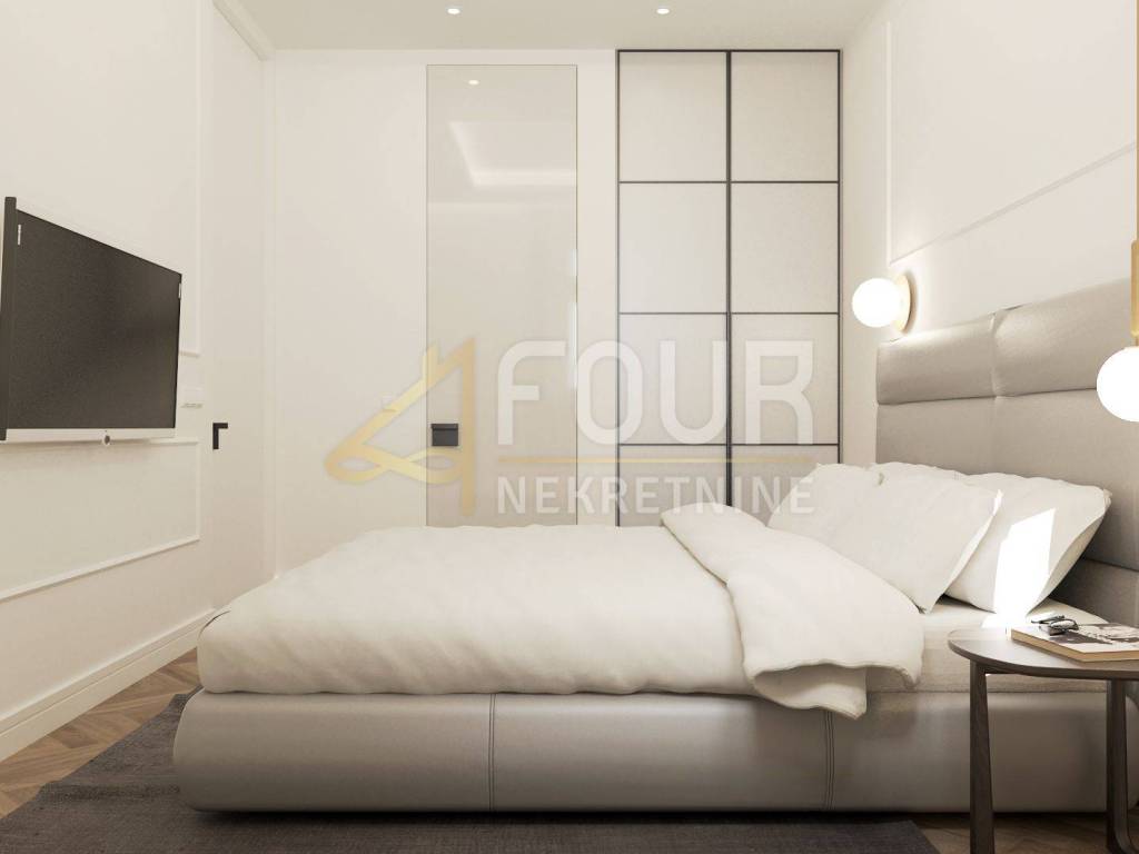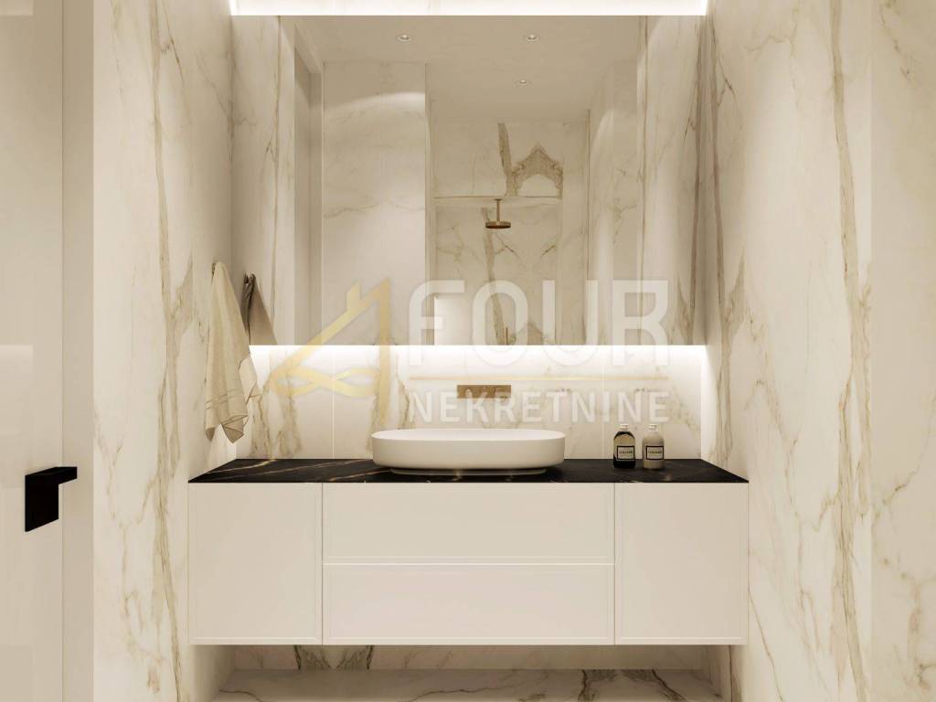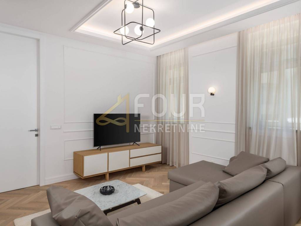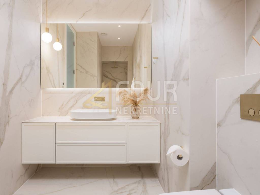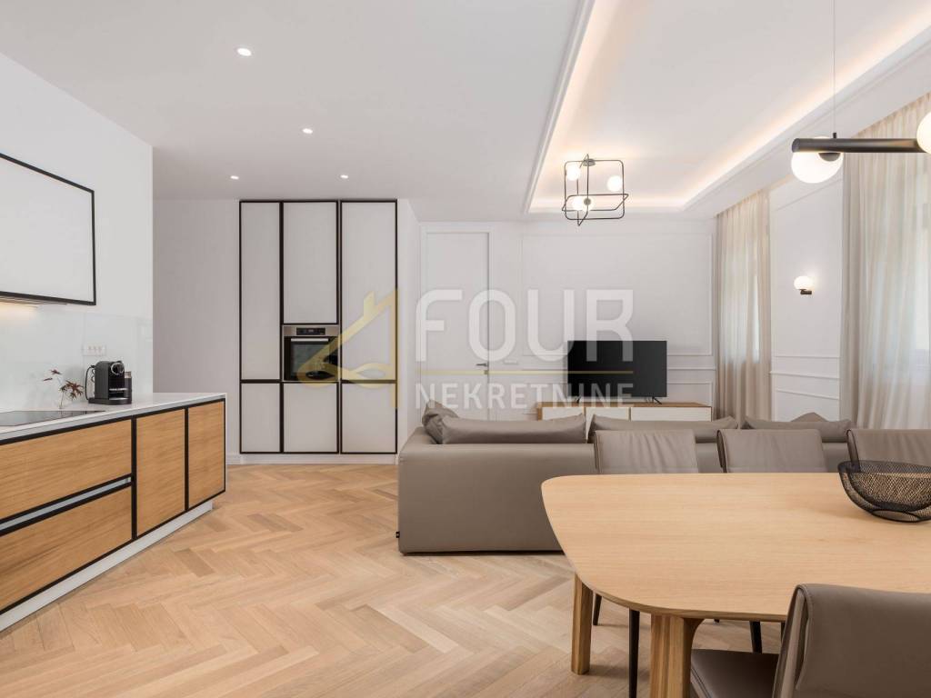 An extremely elegant apartment is for sale, which fully justifies the status of a top property with its quality and design. It is located on the ground floor and covers over ninety square meters, with high ceilings that give the space a sense of wide breath and classic Opatija sophistication.