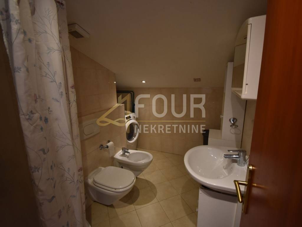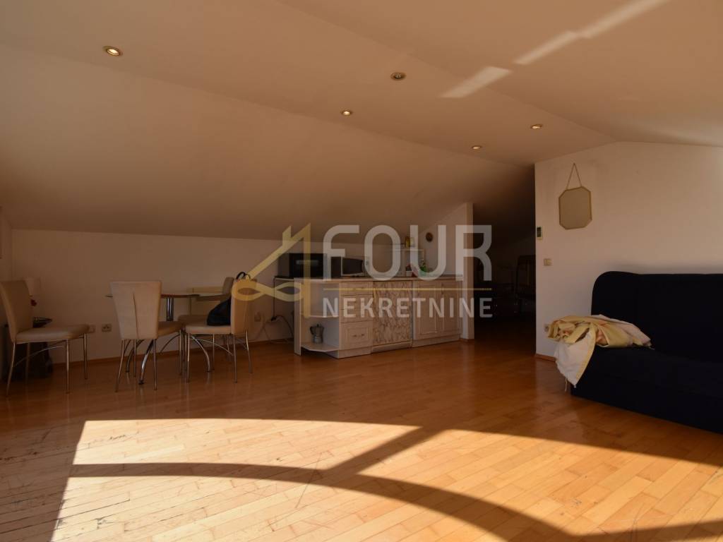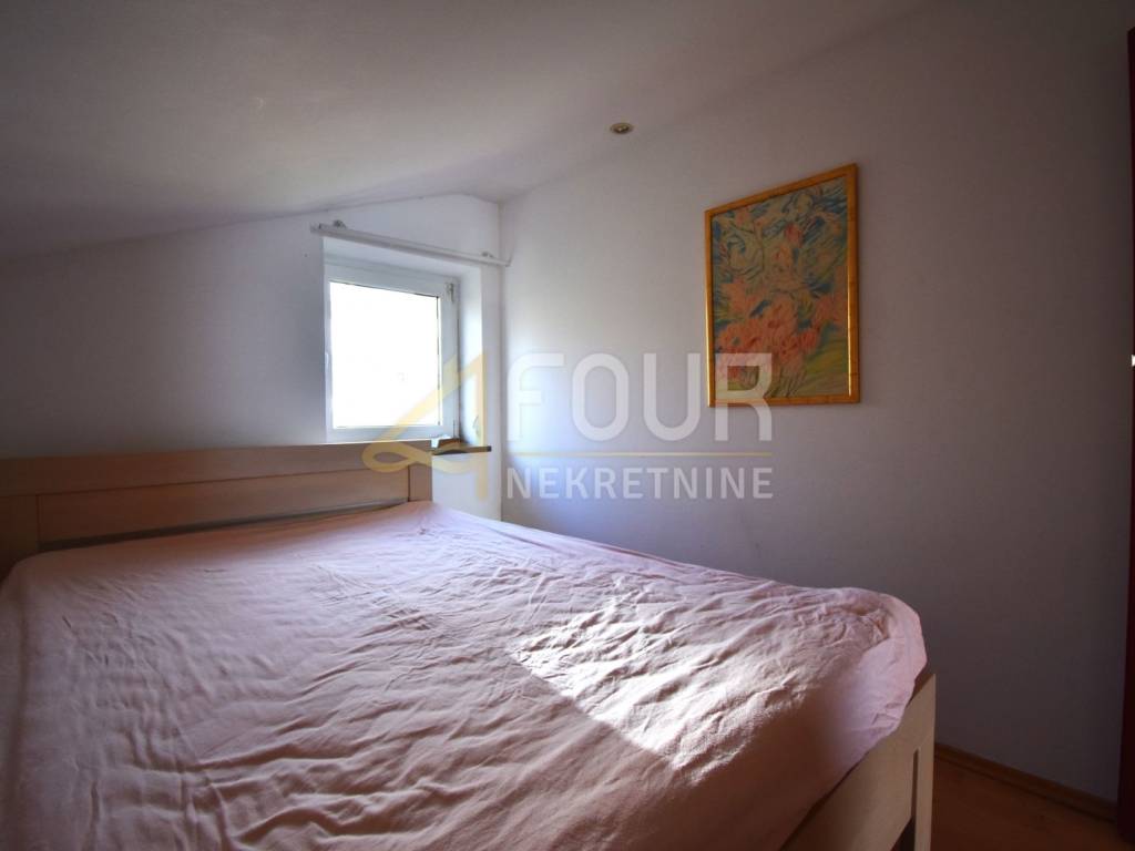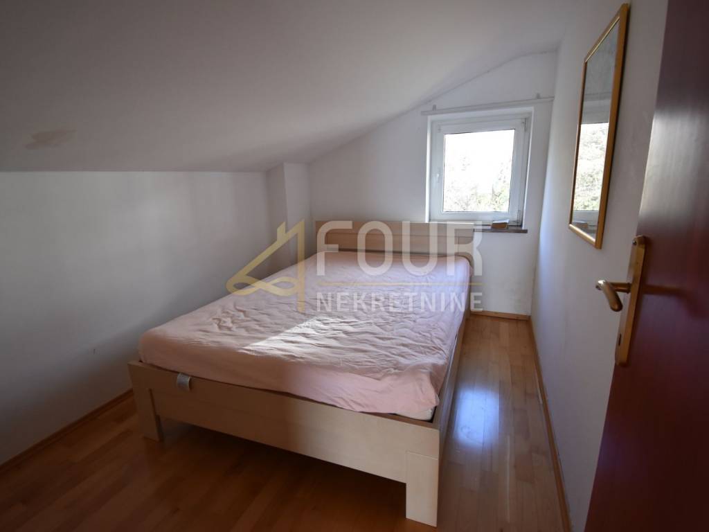 An apartment with a beautiful sea view is for sale in Volosko, located in a small gated residential building. This is a high attic apartment, oriented to the north and south, ensuring good lighting and pleasant airflow. The total living area is 57.94 m2, and the apartment consists of an entrance hall, one bedroom, a bathroom, and a living room with a kitchen and dining area that offers an open view of the sea. The apartment also includes an entrance staircase with a platform, additional area of 5.31 m2. The property is in its original condition, neat and ready to move in, but refreshing the space could further emphasize its full potential. It is sold furnished, equipped with PVC joinery and air conditioning.