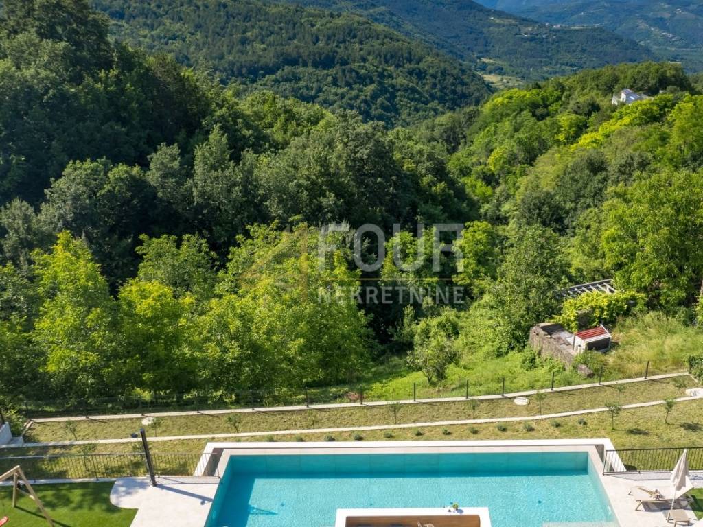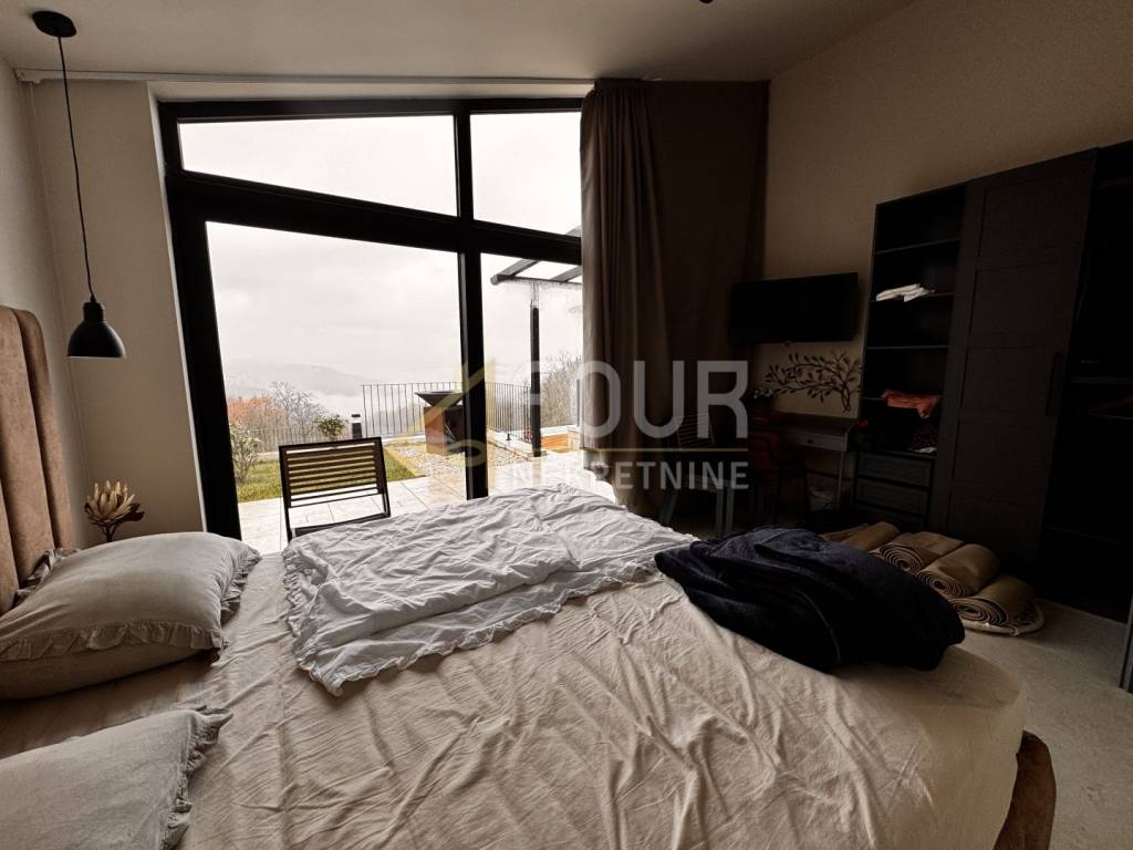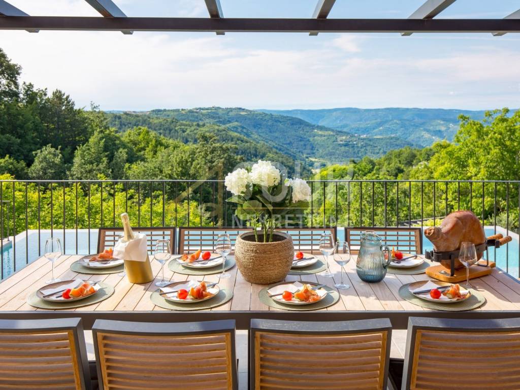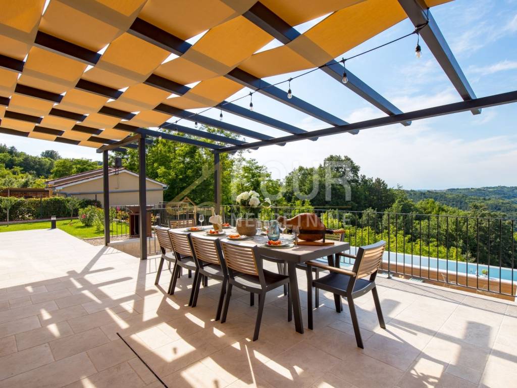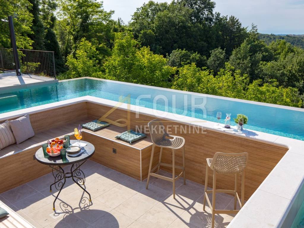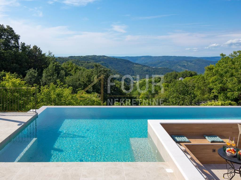 In the heart of central Istria, in a peaceful environment near Motovun, there is an exclusive detached ground floor villa, which with its architecture, location, and equipment represents the perfect combination of luxury, privacy, and nature. The villa offers a charming view of the green valley, Istrian hills, and on clear days the view extends all the way to Slovenia and Italy. Built in 2024, it is fully finished and equipped, and is located on a spacious plot of 1,417 m2 with a landscaped and fenced yard that ensures complete peace and privacy. The space around the house is designed as a true oasis for relaxation, with an infinity pool with salt water and overflow on three sides, an outdoor shower, a sunbathing area in the shape of an island, a children's playground, and a beautifully landscaped garden. The interior of the villa exudes elegance and quality. Stylish custom-made furniture is handmade, and large glass windows fill the interior with natural light and connect the indoor and outdoor spaces. The ground floor is designed as a spacious open-space that combines the living room, kitchen, and dining room, with direct access to the terrace and outdoor dining area. On the same floor, there are three bedrooms, each with its own bathroom, a gym, a guest toilet, a boiler room, and a woodshed. From the living room, stairs lead to a gallery that further emphasizes the openness of the space. On this floor, there is a fourth bedroom with its own bathroom and access to a private terrace overlooking the pool and surrounding hills. The villa is equipped with top-of-the-line heating and cooling systems, including underfloor heating, a heat pump, central heating, eight air conditioners, and a wood-burning fireplace. Additional security and comfort are provided by security doors, PVC and aluminum windows, and a 15.25 kW solar power plant. Three covered parking spaces are also available. An ideal property as a luxury family residence, but also as a top investment for tourist rentals. Dear clients, agency fees are charged in accordance with the General Terms and Conditions.
