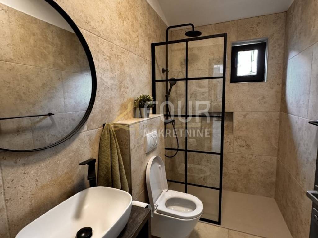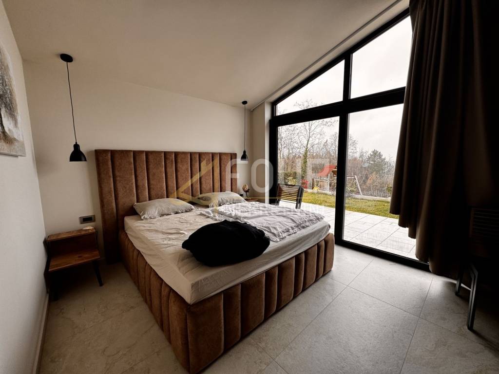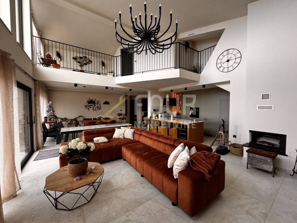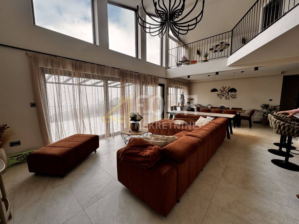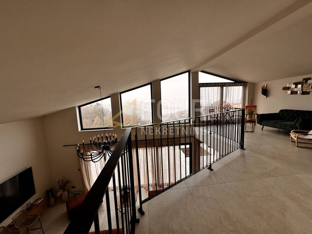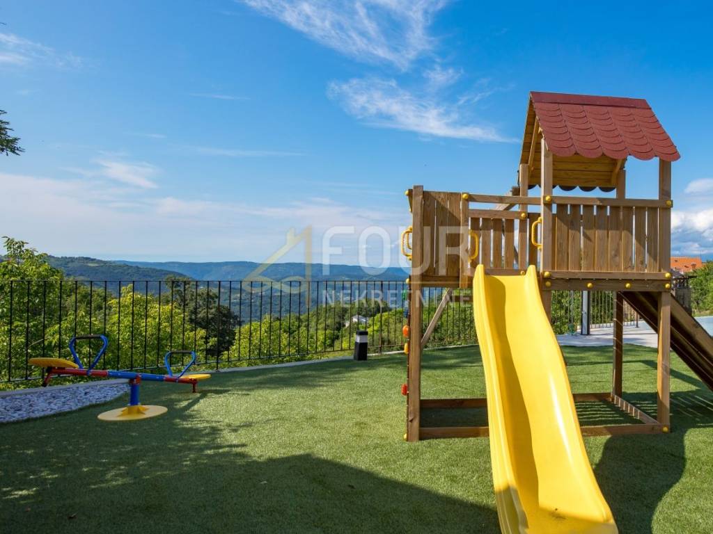 In the heart of central Istria, in a peaceful environment near Motovun, there is an exclusive detached ground floor villa, which with its architecture, location, and equipment represents the perfect combination of luxury, privacy, and nature. The villa offers a charming view of the green valley, Istrian hills, and on clear days the view extends all the way to Slovenia and Italy. Built in 2024, it is fully finished and equipped, and is located on a spacious plot of 1,417 m2 with a landscaped and fenced yard that ensures complete peace and privacy. The space around the house is designed as a true oasis for relaxation, with an infinity pool with salt water and overflow on three sides, an outdoor shower, a sunbathing area in the shape of an island, a children's playground, and a beautifully landscaped garden. The interior of the villa exudes elegance and quality. Stylish custom-made furniture is handmade, and large glass windows fill the interior with natural light and connect the indoor and outdoor spaces. The ground floor is designed as a spacious open-space that combines the living room, kitchen, and dining room, with direct access to the terrace and outdoor dining area. On the same floor, there are three bedrooms, each with its own bathroom, a gym, a guest toilet, a boiler room, and a woodshed. From the living room, stairs lead to a gallery that further emphasizes the openness of the space. On this floor, there is a fourth bedroom with its own bathroom and access to a private terrace overlooking the pool and surrounding hills. The villa is equipped with top-of-the-line heating and cooling systems, including underfloor heating, a heat pump, central heating, eight air conditioners, and a wood-burning fireplace. Additional security and comfort are provided by security doors, PVC and aluminum windows, and a 15.25 kW solar power plant. Three covered parking spaces are also available. An ideal property as a luxury family residence, but also as a top investment for tourist rentals. Dear clients, agency fees are charged in accordance with the General Terms and Conditions.