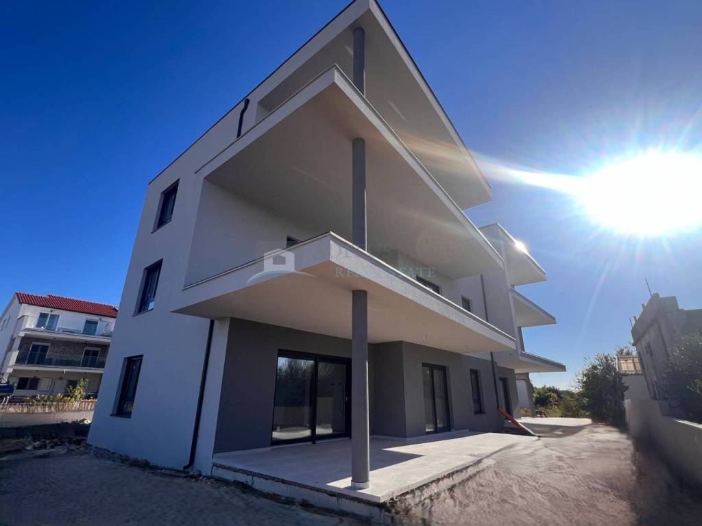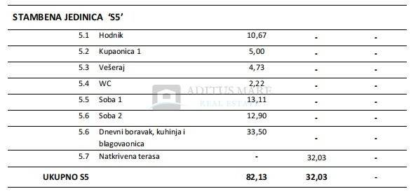 Raspored prostorija: Stan se sastoji od hodnika, kupaonice, dodatnog WC-a, vešeraja, dvije udobne spavaće sobe te prostranog open-space dnevnog boravka s kuhinjom i blagovaonicom. Natkrivena terasa od 32.03 m pruža savršeno mjesto za boravak na otvorenom. Zašto je ovaj stan poseban? -mirna i atraktivna lokacija -blizina mora i plaže