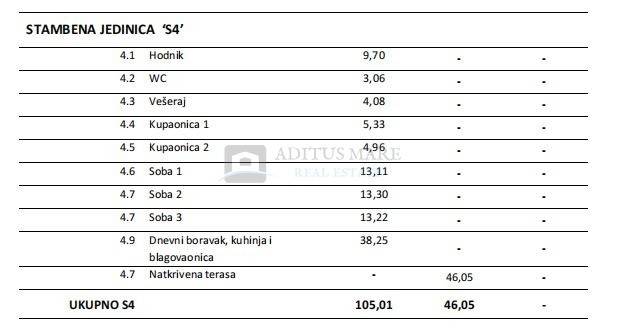 Raspored prostorija: Stan se sastoji od hodnika, dvije kupaonice, dodatnog WC-a, vešeraja, tri udobne spavaće sobe te prostranog open-space dnevnog boravka s kuhinjom i blagovaonicom. Natkrivena terasa od 46.05 m pruža savršeno mjesto za boravak na otvorenom. Zašto je ovaj stan poseban? -mirna i atraktivna lokacija -blizina mora i plaže
