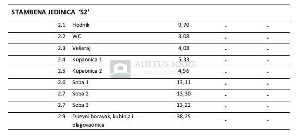 Stan se sastoji od hodnika, dvije kupaonice, dodatnog WC-a, vešeraja, tri udobne spavaće sobe te prostranog open-space dnevnog boravka s kuhinjom i blagovaonicom.